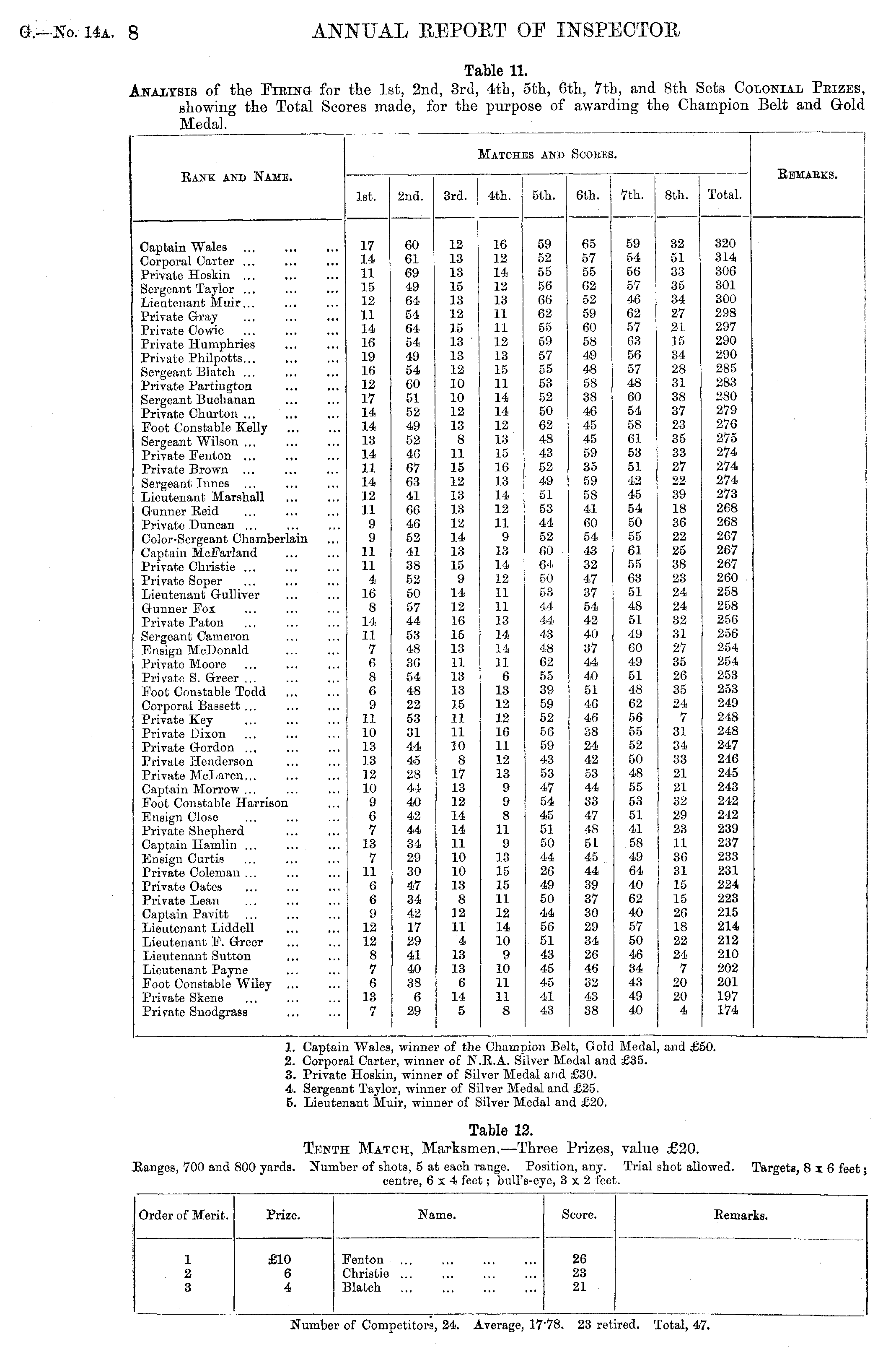 Table 11. Analysis of the Firing for the Ist, 2nd, 3rd, 4th, 5th, 6th, 7th, and 8th Sets _ Colonial Prizes, showing the Total Scores made, for the purpose of awarding the Champion Belt and Gold Medal.