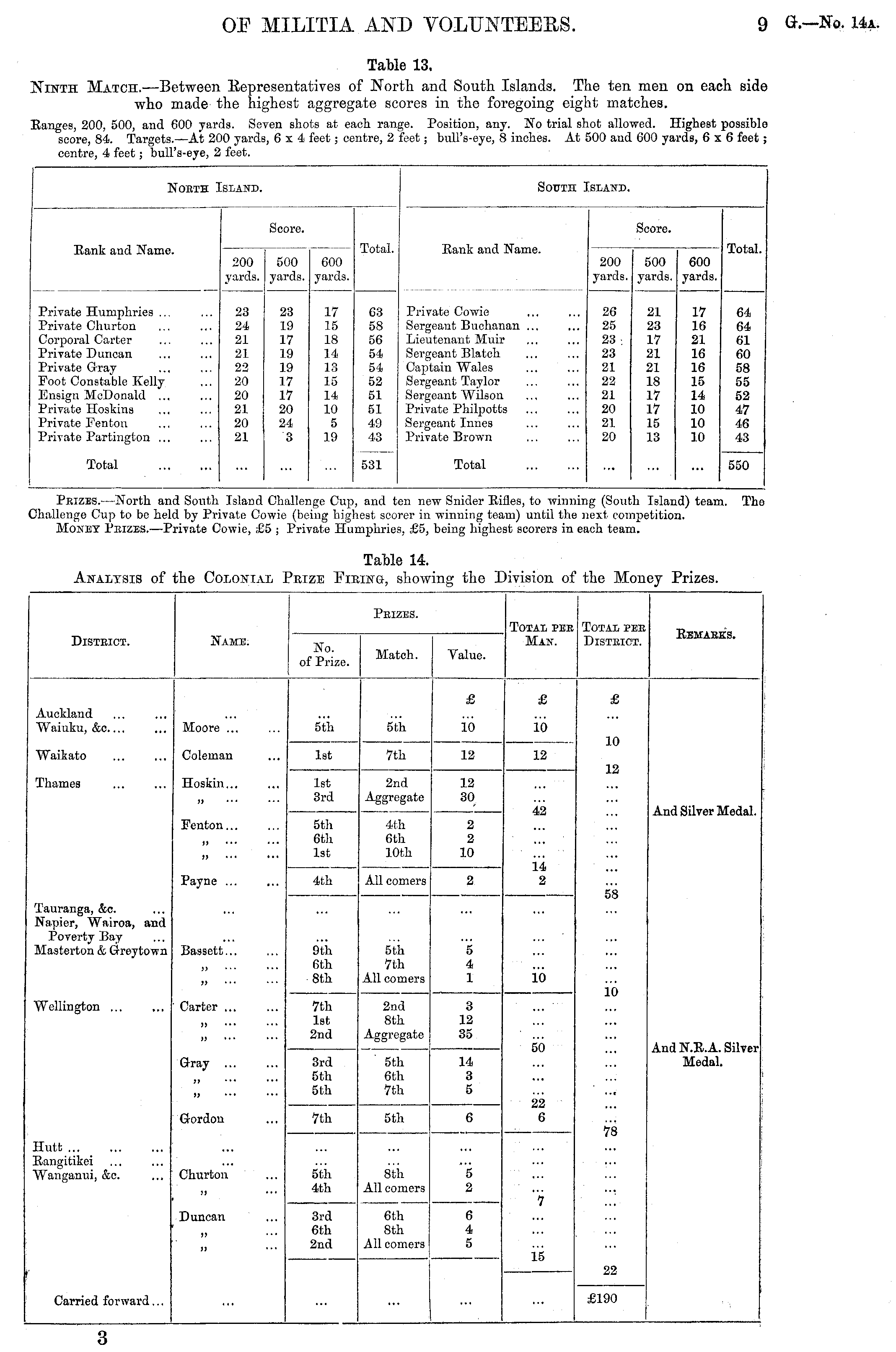 Tab! iti, fiNTn Match. —Between Representatives of Nor who made the highest aggregate sci th and South Islands. The ten men on each side jres in the foregoing eight matches. ;e. Position, any. No trial shot allowed. Highest possible feet; bull's-eye, 8 inches. At 500 and 600 yards, 6x6 feet; langes, 200, 500, and 600 yards. Seven shots at each ran^ score, 84. Targets.—At 200 yards, 6x4 feet; centre, 2 1 centre, 4 feet; bull's-eye, 2 feet. Nobth Island. SotTTH .BLAST/. Score. Score. Rank and Name. 200 yards. 500 yards. 600 yards. Total. Rank and Name. 200 yards. 500 yards. 600 yards. Total. Private Humphries .., Private Churton Corporal Carter Private Duncan Private Gray Foot Constable Kelly Ensign McDonald ... Private Hoskins Private Fenton Private Partington ... 23 24 21 21 22 20 20 21 20 21 23 19 17 19 19 17 17 20 24 3 17 15 18 14 13 15 14 10 5 19 63 58 56 54 54 52 51 51 49 43 Private Cowie Sergeant Buchanan ... Lieutenant Muir Sergeant Blatch Captain Wales Sergeant Taylor Sergeant Wilson Private Philpotts Sergeant Innes Private Brown 26 25 23 ■ 23 21 22 21 20 21 20 21 23 17 21 21 18 17 17 15 13 17 16 21 16 16 15 14 10 10 10 64 64 61 60 58 55 52 47 46 43 Total 531 Total 550 Peizes. —North and South lhallenge Cup to be held by Pri Money Peizes. —Private C Island ivate Ci lowie, i. Challen iwie (bei 'A; Priv >ge Cup, and t ing highest sco rate Humphrie. ten new Snider Rii >rer in winning tea is, £5, being highe; flies, to winniri tm) until the 1 st scorers in e£ ig (Soul lext cor ich tear th Island) team npetition. a. Thi n. Analysis of the Cc JLONIJ -L Pali Tabli .e 14. Kvision of i oney Prizes. ZE ElEINa, showing the I ;he Peizes. Total pee Total pes Distbict. Remabks. District. Name. No. of Prize. Match. Value. Man. £ £ £ ] Auckland Waiuku, &e .. 5th 5th id id Moore ... 10 Waikato Coleman 1st 7th 12 12 12 Thames Hoskin... 1st 3rd 2nd Aggregate 12 30 42 And Silver Medal. Fenton... 5th 6th 1st 4th 6th 10th 2 2 10 Tauranga, &c. Napier, Wairoa, and Poverty Bay Masterton & Greytown ,, Payne ... 4th All comers 2 14 2 58 Bassett... 9th 6th 8th 5th 7th All comers 5 4 1 ,, i'6 Wellington ... ,, i'6 Carter ... 7th 1st 2nd 2nd 8th 3 12 35 ,, Gray ... 3rd 5th 5th Aggregate 5th 6th 7th 14 3 5 50 And N.R.A. Silver Medal. ,, ... Gordon 7th 5th 6 22 6 78 Hutt Rangitikei Wanganui, &c. Churton 5tii 4th 8th All comers "5 2 >) 3rd 6th 2nd "i Duncan 6th 8th All comers 6 4 5 j> H 15 22 Carried forward... £190