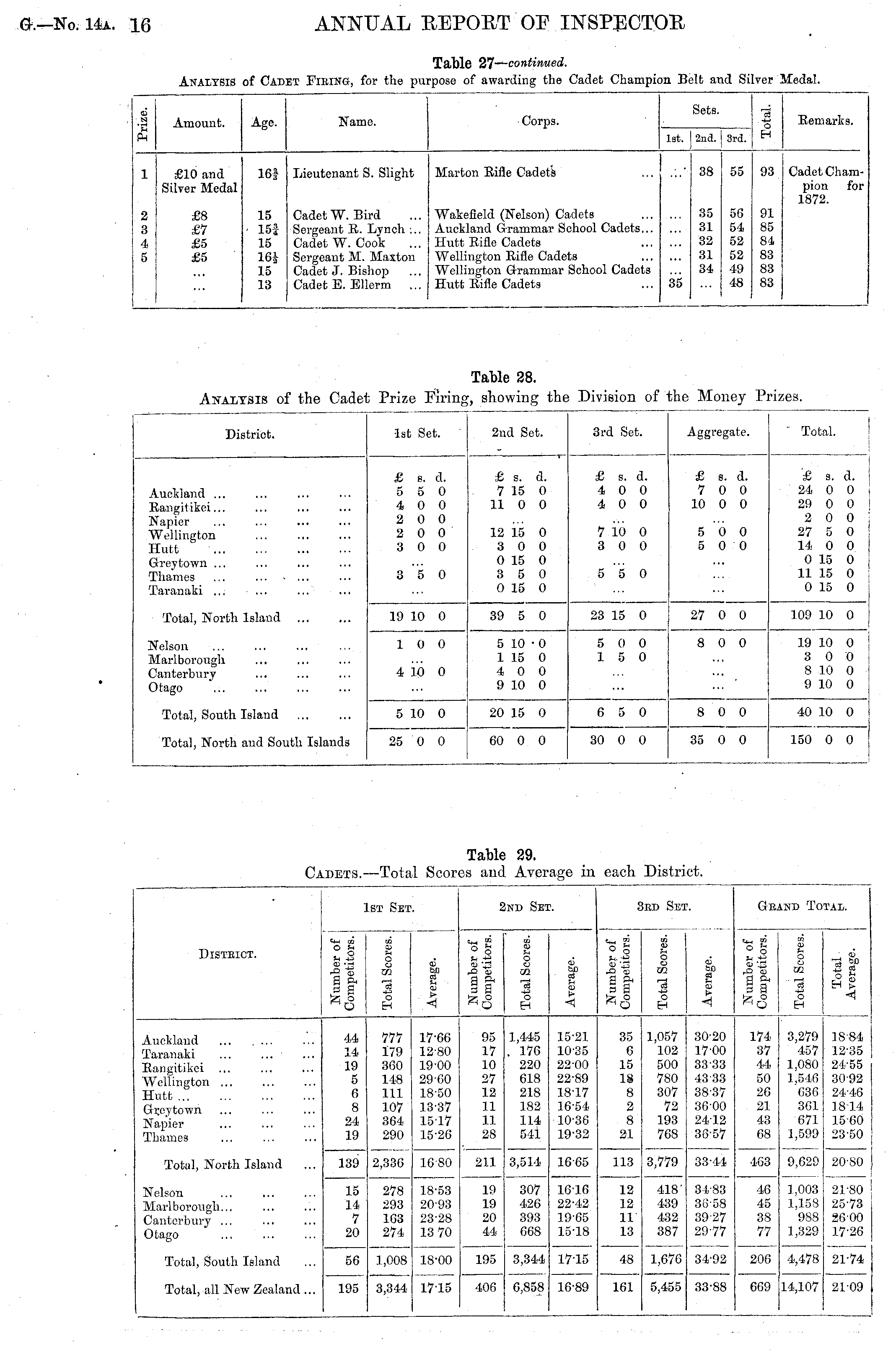 CD Sets. Is Amount. Age. Name. Corps. Remarks. 1st. I and. | 3rd. £10 and Silver Medal 16| Lieutenant S. Slight Marton Rifle Cadets 38 55 93 Cadet Champion for 1872. 2 3 4 5 £8 £7 £5 £5 15 15J 15 16* 15 13 Cadet W. Bird Sergeant R. Lynch ... Cadet W.Cook Sergeant M. Maxton Cadet J. Bishop Cadet E. Ellerm ... Wakefield (Nelson) Cadets Auckland Grammar School Cadets... Hutt Rifle Cadets Wellington Rifle Cadets Wellington Grammar School Cadets Hutt Rifle Cadets 35 31 32 31 34 56 54 52 52 49 48 91 85 84 83 83 83 35 Table 28. Analtsis of the CadePrize Firing g, showing the Division of i the Money Prizes. Total. District. 1st Set. 2nd Set. 3rd Set. Aggregate. Auckland ... Rangitikei... Napier Wellington Hutt Greytown ... Thames ... ... - ... Taranaki ... ... £ s. d. 5 5 0 4 0 0 2 0 0 2 0 0 3 0 0 £ s. d. 7 15 0 11 0 0 12 15 0 3 0 0 0 15 0 3 5 0 0 15 0 £ s. d. 4 0 0 4 0 0 7 10 0 3 0 0 £ s. d. 7 0 0 10 0 0 5 0 0 5 0 0 £ s. d. ! 24 0 0 29 0 0 2 0 0 27 5 0 ; 14 0 0 ! 0 15 0 i 11 15 0 0 15 0 3 -6 0 5 "5 0 Total, North Island 19 10 0 39 5 0 23 15 0 27 0 0 109 10 0 Nelson Marlborough Canterbury Otago 10 0 4 10 0 5 10 -0 1 15 0 4 0 0 9 10 0 5 0 0 15 0 8 0 0 19 10 0 3 0 0 8 10 0 9 10 0 Total, South Island 5 10 0 20 15 0 6 5 0 8 0 0 40 10 0 Total, North and South Islands 25 0 0 60 0 0 30 0 0 35 0 0 150 0 0 Tabh 29. Average in each District. Cadets. —Total Scores am 1st Sei !nd Se: ikd Se: Ge. jtd Ti ?AL. DlSTEICT. a g. s a □0 4> O 02 ■"3 o H ° o -t2 ai 43 ,£? CD § a Sz ° o o 02 -4-3 o ° s I It' 9S ° o o 02 ;3 o H <4-< ? ° o rQ CD *5 to CD O OQ 3f o H bo > ■4 fcD c5 g cu k <1 Auckland Taranaki ... ... Rangitikei Wellington ... Hutt Greytown Napier Thames 44 14 19 5 6 8 24 19 777 179 360 148 111 107 364 290 17-66 12-80 1900 2960 18-50 13-37 1517 15-26 95 17 10 27 12 11 11 28 1,445 . 176 220 618 218 182 114 541 15-21 10-35 2200 22-89 18-17 16-54 10-36 19-32 35 6 15 18 8 2 8 21 1,057 102 500 780 307 72 193 768 30-20 17-00 33-33 43-33 38-37 3600 24-12 36-57 174 37 44 50 26 21 43 68 3,279 457 1,080 1,546 636 361 671 1,599 9,629 18-84 12-35 24-55 3092 24-46 18-14 15-60 23-50 Total, North Island 139 2,336 1680 211 3,514 16-65 113 3,779 33-44 463 20-80 Nelson Marlborough... Canterbury ... Otago 15 14 7 20 278 293 163 274 18-53 20-93 23-28 13 70 19 19 20 44 307 426 393 668 1616 22-42 19-65 15-18 12 12 11 13 418' 439 432 387 34-83 36-58 39-27 29-77 46 45 38 77 1,003 1,158 988 1,329 4,478 21-80 2573 26-00 17-26 Total, South Island 56 1,008 18-00 195 3,344 17-15 48 1,676 34-92 206 21-74 Total, all New Zealand ... 195 3,344 17-15 406 6,858 16-89 161 5,455 33-88 669 14,107 21-09