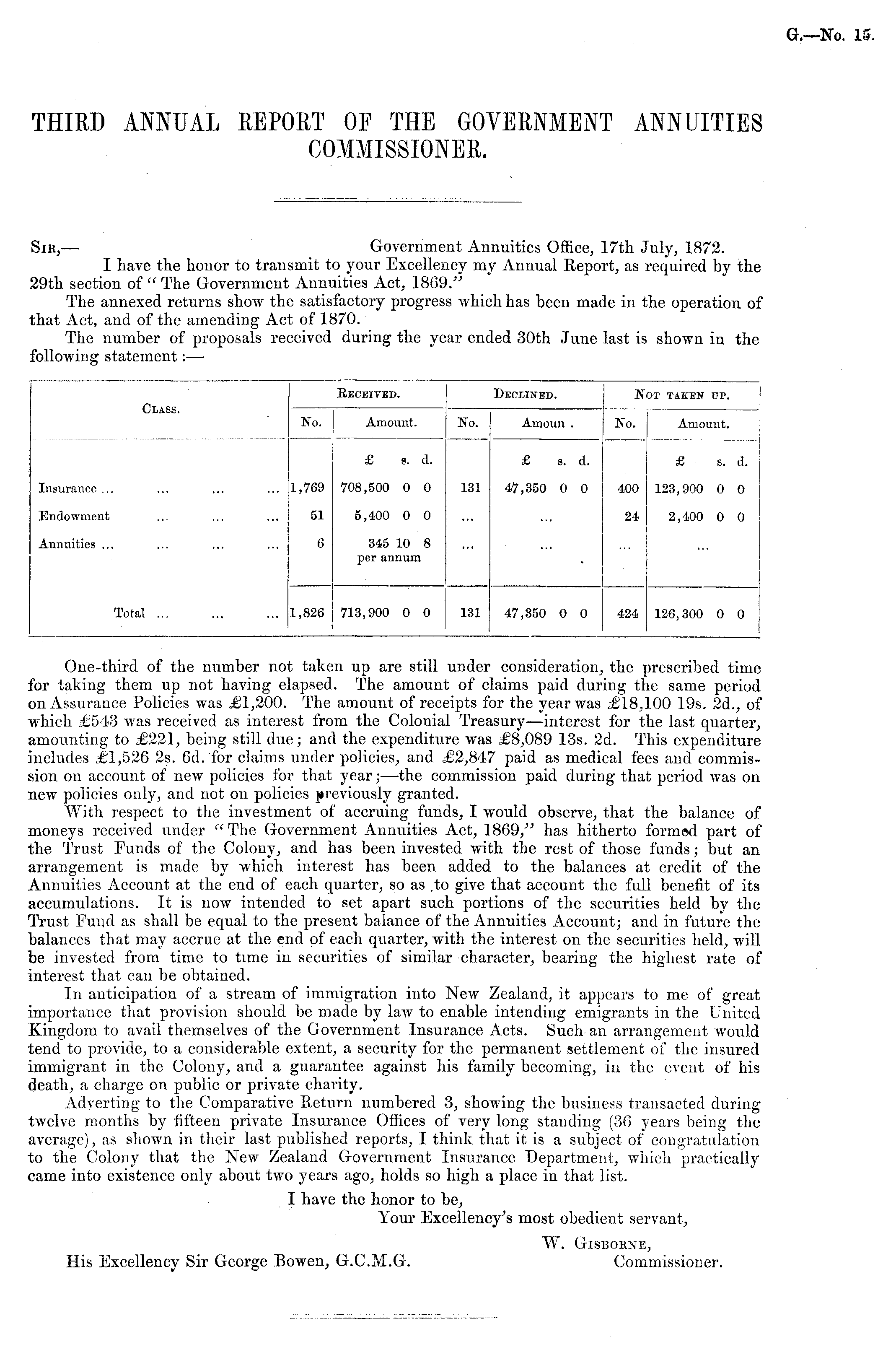 One-third of the number not taken up are still under consideration, the prescribed time for taking them up not having elapsed. The amount of claims paid during the same period on Assurance Policies was £1,200. The amount of receipts for the year was £18,100 19s. 2d., of which £543 was received as interest from the Colonial Treasury—interest for the last quarter, amounting to £221, being still due; and the expenditure was £8,089 13s. 2d. This expenditure includes £1,526 2s. 6d. for claims under policies, and £2,847 paid as medical fees and commission on account of new policies for that year; —-the commission paid during that period was on new policies only, and not on policies previously granted. With respect to the investment of accruing funds, I would observe, that the balance of moneys received under " The Government Annuities Act, 1869,'" has hitherto formod part of the Trust Funds of the Colony, and has been invested with the rest of those funds; but an arrangement is made by which interest has been, added to the balances at credit of the Annuities Account at the end of each quarter, so as .to give that account the full benefit of its accumulations. It is now intended to set apart such portions of the securities held by the Trust Fund as shall be equal to the present balance of the Annuities Account; and in future the balances that may accrue at the end of each quarter, with the interest on the securities held, will be invested from time to time in securities of similar character, bearing the highest rate of interest that can be obtained. In anticipation of a stream of immigration into New Zealand, it appears to me of great importance that provision should be made by law to enable intending emigrants in the United Kingdom to avail themselves of the Government Insurance Acts. Such an arrangement would tend to provide, to a considerable extent, a security for the permanent settlement of the insured immigrant in the Colony, and a guarantee against his family becoming, in the event of his death, a charge on public or private charity. Adverting to the Comparative Return numbered 3, showing the business transacted during twelve months by fifteen private Insurance Offices of very long standing (36 years being the average), as shown in their last published reports, I think that it is a subject of congratulation to the Colony that the New Zealand Government Insurance Department, which practically came into existence only about two years ago, holds so high a place in that list. I have the honor to be, Your Excellency's most obedient servant, W. Gisborne, His Excellency Sir George Bowen, G.C.M.G. Commissioner.