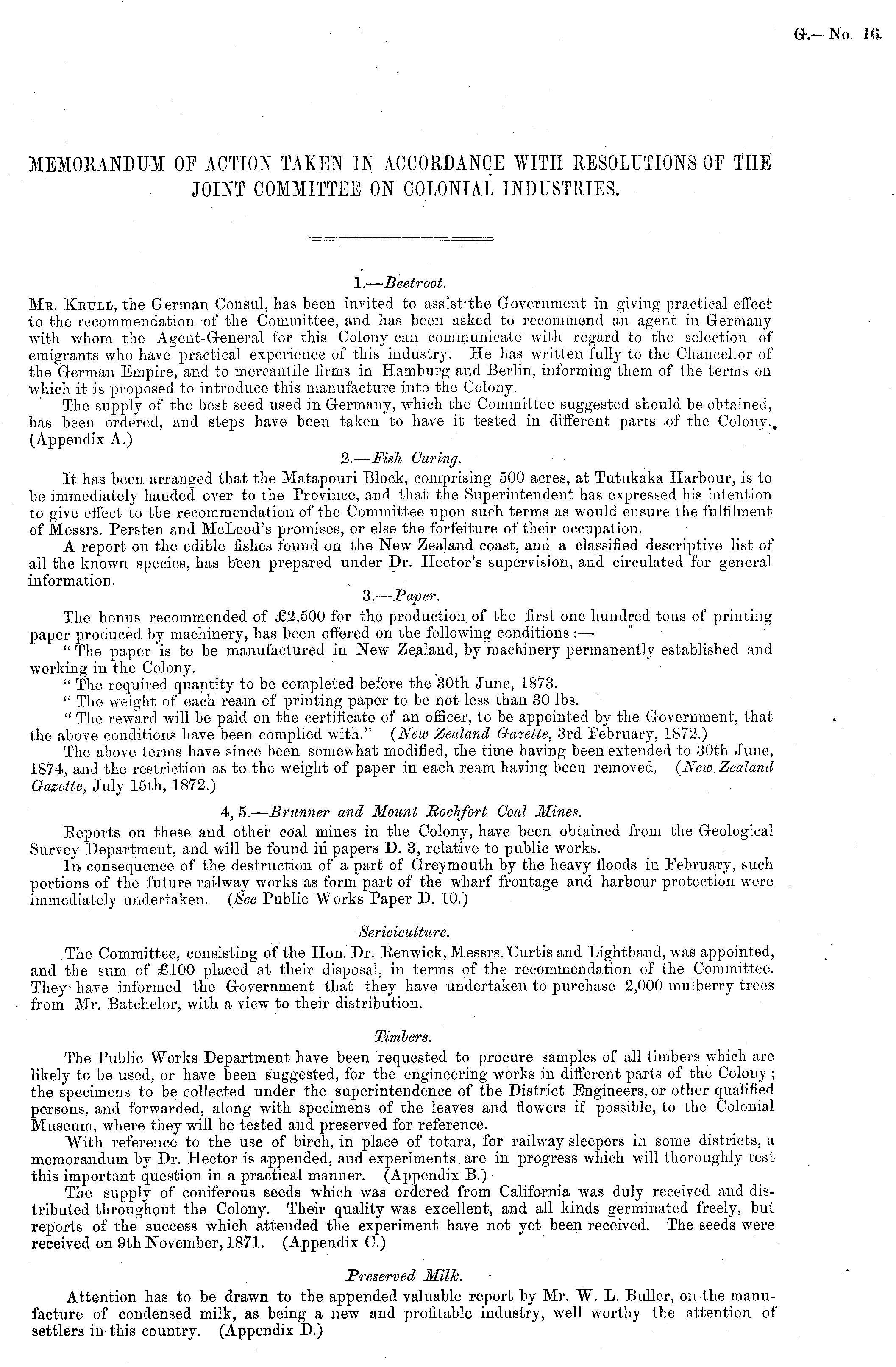 I.— Beetroot. Me. Krtjxl, the German Consul, has been invited to assist the Government in giving practical effect to the recommendation of the Committee, and has been asked to recommend an agent in Germany with whom the Agent-General for this Colony can communicate with regard to the selection of emigrants who have practical experience of this industry. He has written fully to the Chancellor of the German Empire, and to mercantile firms in Hamburg and Berlin, informing them of the terms on which it is proposed to introduce this manufacture into the Colony. The supply of the best seed used in Germany, which the Committee suggested should be obtained, has been ordered, and steps have been taken to have it tested in different parts of the Colony., (Appendix A.) 2.— Fish Curing. It has been arranged that the Matapouri Block, comprising 500 acres, at Tutukaka Harbour, is to be immediately handed over to the Province, and that the Superintendent has expressed his intention to give effect to the recommendation of the Committee upon such terms as would ensure the fulfilment of Messrs. Persten and McLeod's promises, or else the forfeiture of their occupation. A report on the edible fishes found on the New Zealand coast, and a classified descriptive list of all the known species, has been prepared under Dr. Hector's supervision, and circulated for general information. 3. — Paper. The bonus recommended of £2,500 for the production of the first one hundred tons of printing paper produced by machinery, has been offered on the following conditions : —■ " The paper is to be manufactured in New Zealand, by machinery permanently established and working in the Colony. " The required quantity to be completed before the 30th June, 1873. " The weight of each ream of printing paper to be not less than 30 lbs. " The reward will be paid on the certificate of an officer, to be appointed by the Government, that the above conditions have been complied with." (New Zealand Gazette, 3rd February, 1872.) The above terms have since been somewhat modified, the time having been extended to 30th June, 187J<, and the restriction as to the weight of paper in each ream having been removed. (New Zealand Gazette, July 15th, 1372.) 4, s.— Srwnner and Mount Sochfort Coal Mines. Eeports on these and other coal mines in the Colony, have been obtained from the Geological Survey Department, and will be found hi papers D. 3, relative to public works. In- consequence of the destruction of a part of Greymouth by the heavy floods in February, such portions of the future railway works as form part of the wharf frontage and harbour protection were immediately undertaken. (See Public Works Paper D. 10.) Sericioulture. The Committee, consisting of the Hon. Dr. lienwick, Messrs. XDurtis and Lightband, was appointed, and the sum of £100 placed at their disposal, in terms of the recommendation of the Committee. They have informed the Government that they have undertaken to purchase 2,000 mulberry trees from Mr. Batchelor, with a view to their distribution. Timbers. The Public Works Department have been requested to procure samples of all timbers which are likely to be used, or have been suggested, for the engineering works in different parts of the Colony; the specimens to be collected under the superintendence of the District Engineers, or other qualified persons, and forwarded, along with specimens of the leaves and flowers if possible, to the Colonial Museum, where they will be tested and preserved for reference. With reference to the use of birch, in place of totara, for railway sleepers in some districts, a memorandum by Dr. Hector is appended, and experiments are in progress which will thoroughly test this important question in a practical manner. (Appendix B.) The supply of coniferous seeds which was ordered from California was duly received and distributed throughout the Colony. Their quality was excellent, and all kinds germinated freely, but reports of the success which attended the experiment have not yet been received. The seeds were received on 9th November, 1871. (Appendix C.) Preserved Milk. Attention has to be drawn to the appended valuable report by Mr. W. L. Buller, on the manufacture of condensed milk, as being a new and profitable industry, well worthy the attention of settlers in this country. (Appendix D.)