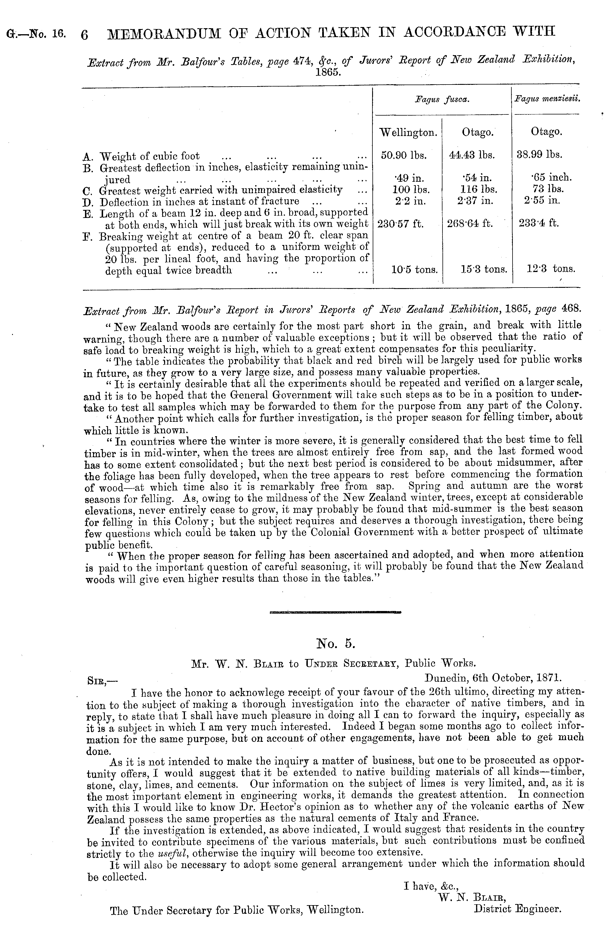 Extract from Mr. Salfour's Report in Jurors' Reports of New Zealand Exhibition, 18G5, page 468. " New Zealand woods are certainly for the most part short in the grain, and break with little warning, though there are a number of valuable exceptions ; but it will be observed that the ratio of safe load to breaking weight is high, which to a great extent compensates for this peculiarity. " The table indicates the probability that black and red birch will be largely used for public works in future, as they grow to a very large size, and possess many valuable properties. " It is certainly desirable that all the experiments should be repeated and verified on a larger scale, and it is to be hoped that the General Government will take such steps as to "be in a position to undertake to test all samples which may be forwarded to them for the purpose from any part of the Colony. " Another point which calls for further investigation, is the proper season for felling timber, about which little is known. " In countries where the winter is more severe, it is generally considered that the best time to fell timber is in mid-winter, when the trees are almost entirely free from sap, and the last formed wood has to some extent consolidated; but the next best period is considered to be about midsummer, after the foliage has been fully developed, when the tree appears to rest before commencing the formation of wood —at which time also it is remarkably free from sap. Spring and autumn are the worst seasons for felling. As, owing to the mildness of the New Zealand winter, trees, except at considerable elevations, never entirely cease to grow, it may probably be found that mid-summer is the best season for felling in this Colony; but the subject requires and deserves a thorough investigation, there being few questions which could be taken up by the Colonial Government with a better prospect of ultimate public benefit. " "When the proper season for felling has been ascertained and adopted, and when more attention is paid to the important question of careful seasoning, it will probably be found that the New Zealand woods will give even higher results than those in the tables."
