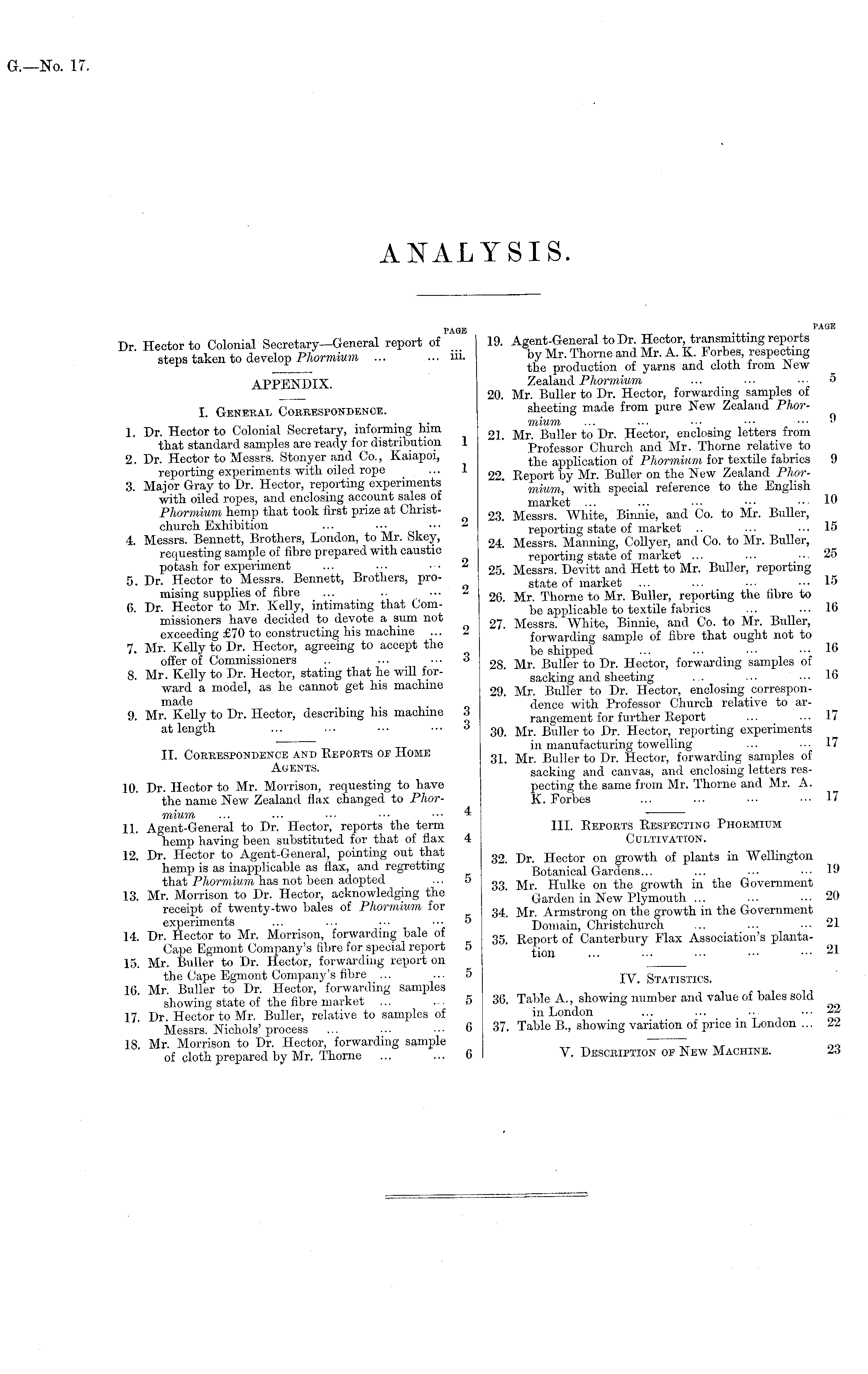 FABE _. PAOT Dr Hector to Colonial Secretary-General report of 19. Agent-General to Dr. Hector transmitting reports steps taken to develop Phormium in. by Mr. Thome and Mr. A. K. E orbes, respecting F F the production of yarns and cloth from New APPENDIX Zealand Phormium ... ... ■ ■ £> ' 20. Mr. Buller to Dr. Hector, forwarding samples of I. General Correspondence, sheeting made from pure New Zealand Phor- _ , ~ „ . , • . • mium ... ... ••■ ■•• •••• J 1. Dr. Hector to Colonial Secretary, informing him 2J Mr Bul i er to Dr. Hector, enclosing letters from that standard samples are ready for distribution 1 Professor Church and Mr. Thorne relative to 2. Dr. Hector to Messrs. Stonyer and Co., Kaiapoi, the ap p licat i on 0 f Phormium for textile fabrics 9 reporting experiments with oiled rope ... 1 22 X rt by Mr Buller on the New Zealand Phor3. Major Gray to Dr. Hector, reporting experiments miwre, with special reference to the English with oiled ropes, and enclosing account sales ot market ... ■■• ...10 Phormium hemp that took first prize at Christ- 23 Messrs. White, Biniiie, and Co. to Mr. Buller, church Exhibition ... ... ••■ 2 reporting state of market .. ... ... 15 4. Messrs. Bennett, Brothers, London, to Mr. bkey, 24 Messrs Manning, Collyer, and Co. to Mr. Buller, requesting sample of fibre prepared with caustic reporting state of market 25 potash for experiment ... ■•■ -• l 25 Messrs. Devitt and Hett to Mr. Buller, reporting 5. Dr. Hector to Messrs. Bennett, Brothers, pro- state of market 15 mising supplies of fibre ... .... 2 20 ]yr r Thorne to Mr. Buller, reporting the fibre to 6. Dr. Hector to Mr. Kelly, intimating that Com- be applicable to textile fabrics 16 missioners have decided to devote a sum not Messrs white, Binnie, and Co. to Mr. Buller, exceeding £70 to constructing his machine ... I forwarding sample of fibre that ought not to 7. Mr. Kelly to Dr. Hector, agreeing to accept the be shipped ... ... ■■• ... 16 offer of Commissioners .. ... •■• 3 2 8 Mr. Buller to Dr. Hector, forwarding samples of 8. Mr. Kelly to Dr. Hector, stating that he will for- sacking and sheeting 16 ward a model, as he cannot get his machine M^ Buller to Dr Hector, enclosing corresponmade ~.-,. , . „ dence with Professor Church relative to ar9. Mr. Kelly to Dr. Hector, describing his machine 3 rangement for further Report 17 at length ... ■•■ ••• •■• 3 30. Mr. Buller to Dr. Hector, reporting experiments „ TT in manufacturing towelling ... ■•■ 17 11. Correspondence and Reports of Home gl Mr _ Buller to Tj r . Hector, forwarding samples of Agents. sacking and canvas, and enclosing letters res--10. Dr. Hector to Mr. Morrison, requesting to have peeting the same from Mr. Thome and Mr. A. the name New Zealand flax changed to Phor- K.Forbes ... ... ■■• ... 17 mium ... ... ••• ••• ■■■ * 11. Agent-General to Dr. Hector, reports the term 111. Reports Respecting Phormium hemp having been substituted for that of flax 4 Cultivation. 12. Dr. Hector to Agent-General, pointing out that g2 Dr _ H ector on growth of plants in Wellington hemp is as inapplicable as flax and regretting Botanical Gardens 19 that Phormmm, has not been adopted ... o 33 jy; r Hulke on the growth in the Government 13. Mr. Morrison to Dr. Hector, acknowledging the Garden in New Plymouth . . ... ... 20 receipt of twenty-two bales of Phormmm for v Mr Armstrong on tne growt h in the Government experiments ... _ ... ..... 5 Domain, Christchurch ... ... ... 21 14. Dr. Hector to Mr. Morrison forwarding bale of 3g X tof Canterbury yi ax Association's plantaCape Egmont Company s hbre for special report 5 f. ___ 21 15. Mr. Buller to Dr. Hector, forwarding report on "J the Cape Egmont Company's fibre ... ... 5 jy g TATIgTICg _ 16. Mr. Buller to Dr. Hector, forwarding samples . ' showing state of the fibre market 5 36. Table A., showing number and value of bales sold 17 Dr. Hector to Mr. Buller, relative to samples of 111 London _ ... ... ... •■• j± Messrs. Nichols'process 0 37. Table 8., showing variation of price in London ... 22 18, Mr. Morrison to Dr. Hector, forwarding sample of cloth prepared by Mr, Thome ... '... 6 V. Description oe New Machine. 23