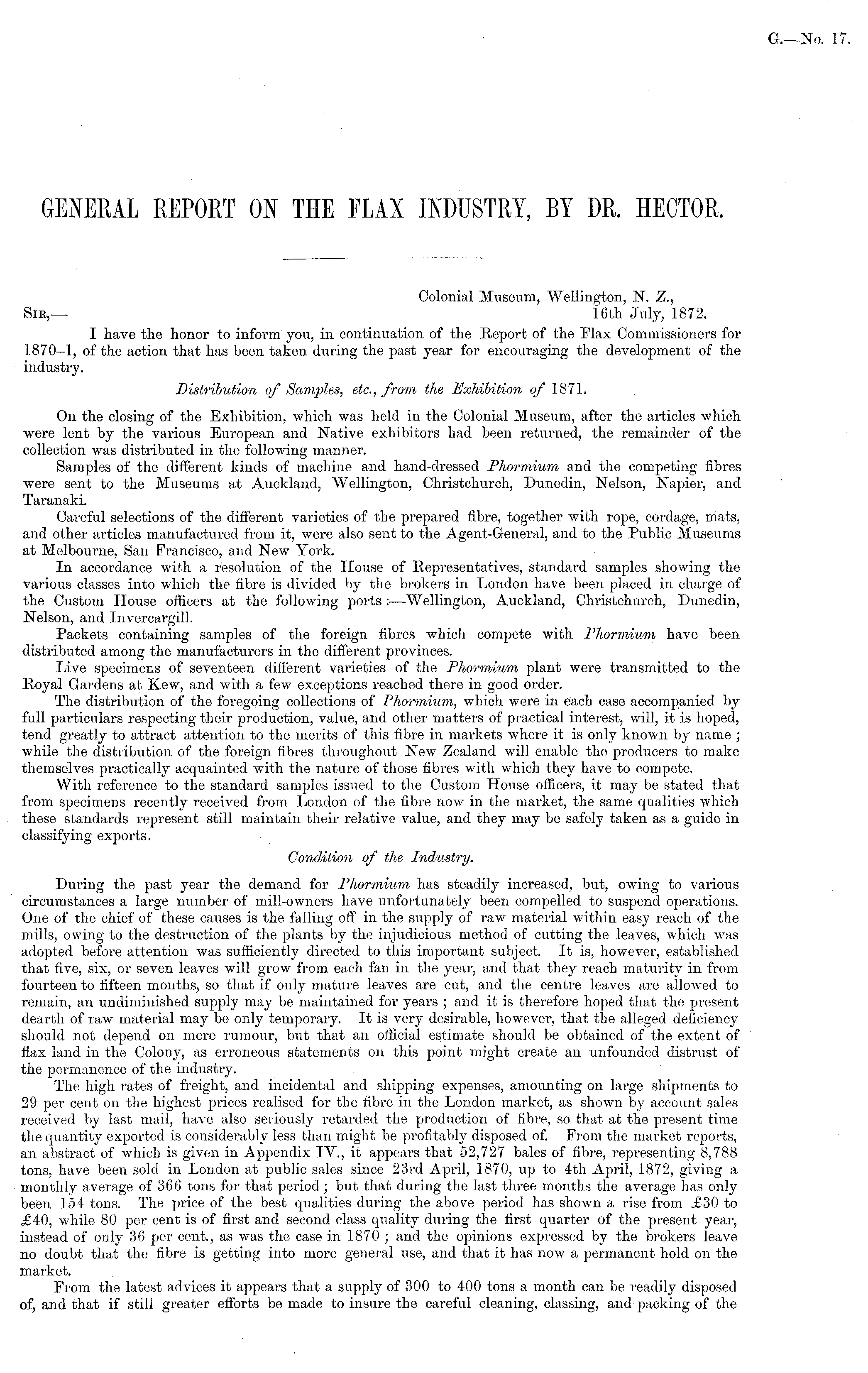GENERAL REPORT ON THE FLAX INDUSTRY, BY DR. HECTOR.