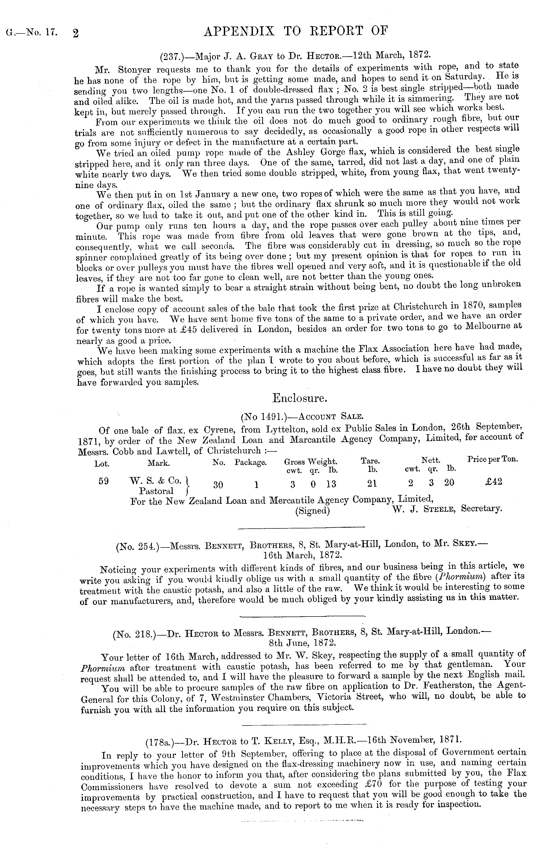 (No 218 )— Dr. Hector to Messrs. Bennett, Brothers, 8, St. Mary-at-Hill, London. — Bth June, 1872. Your letter of 16th March, addressed to Mr. W. Skey, respecting the supply of a small quantity of Phormium after treatment with caustic potash, has been referred to me by that gentleman. Your request shall be attended to, and I will have the pleasure to forward a sample by the next English mail. You will be able to procure samples of the raw fibre on application to Dr. Featherston, the AgentGeneral for this Colony, of 7, Westminster Chambers, Victoria Street, who will, no doubt, be able to furnish you with all the information you require on this subject.