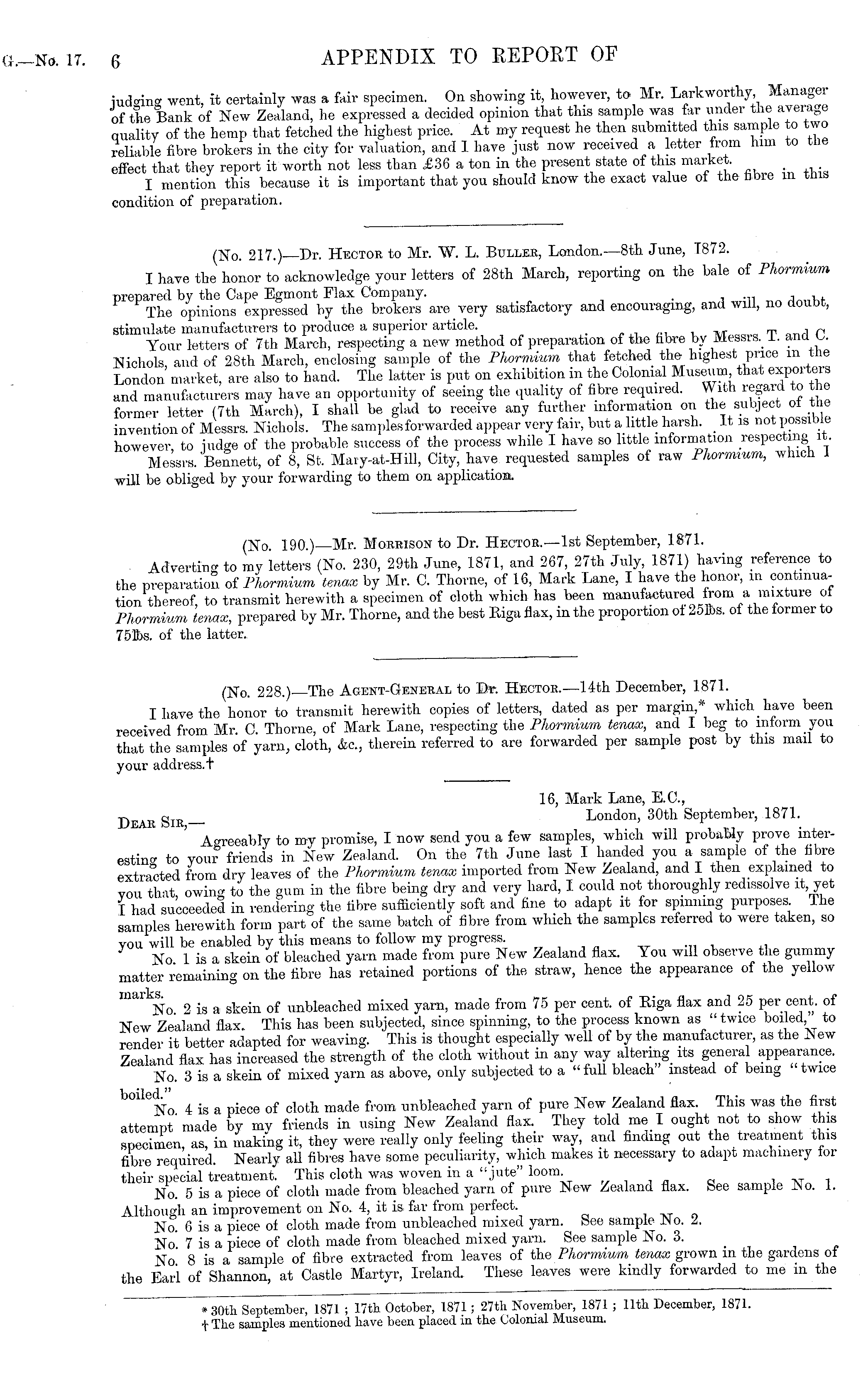 (No. 228.)— The Agent-General to Dr. Hector.—l4th December, 1871. I have the honor to transmit herewith copies of letters, dated as per margin,* which have been received from Mr C. Thorne, of Mark Lane, respecting the Phormium tenax, and I beg to inform you that the samples of yarn, cloth, Ac, therein referred to are forwarded per sample post by this mail to your address.t