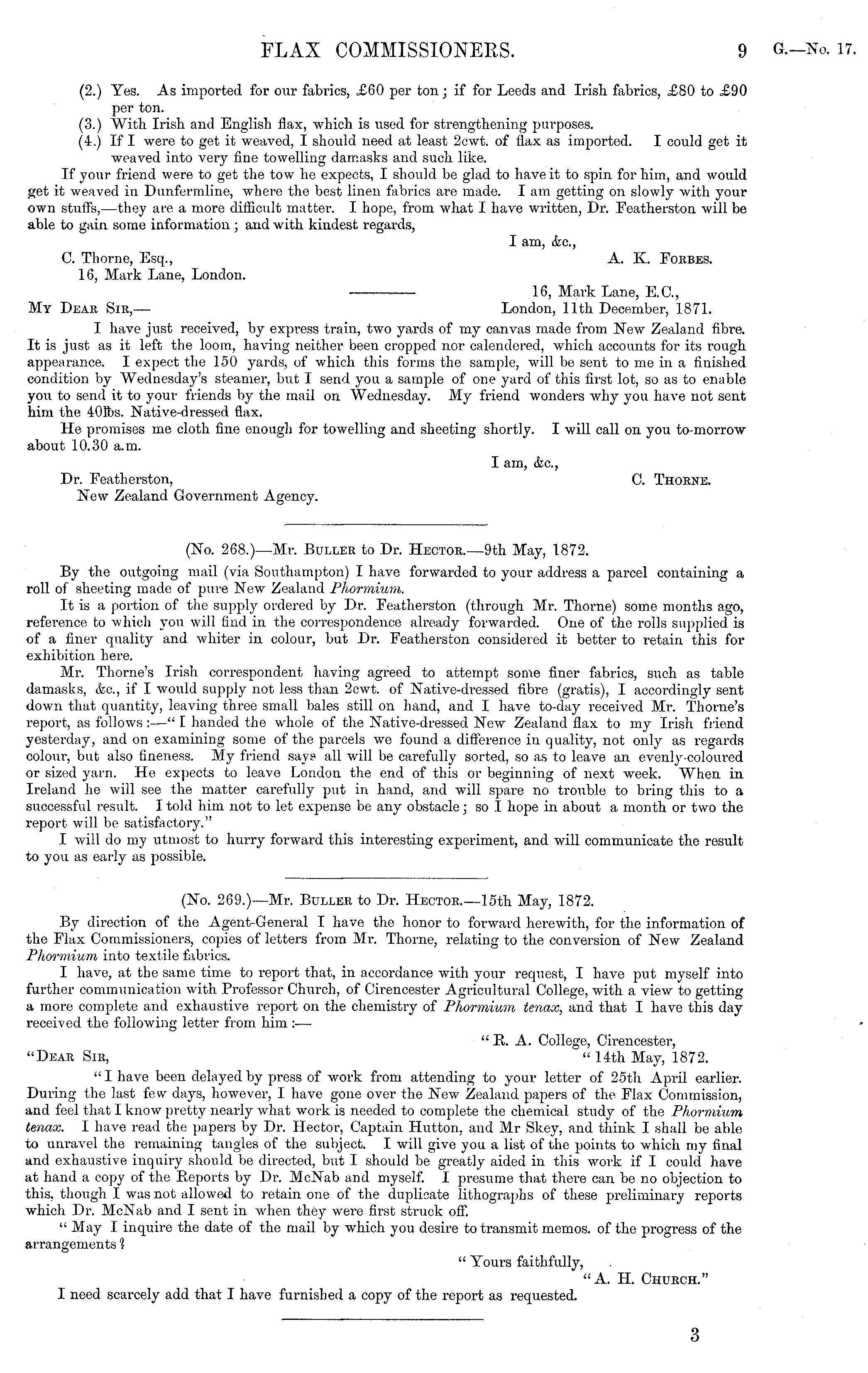 (No. 268.)—Mr. Buller to Dr. Hector.—9th May, 1872. By the outgoing mail (via Southampton) I have forwarded to your address a parcel containing a roll of sheeting made of pure New Zealand Phcyrmium. It is a portion of the supply ordered by Dr. Featherston (through Mr. Thorne) some months ago, reference to which you will find in the correspondence already forwarded. One of the rolls supplied is of a finer quality and whiter in colour, but Dr. Featherston considered it better to retain this for exhibition here. Mr. Thome's Irish correspondent having agreed to attempt some finer fabrics, such as table damasks, (fee, if I would supply not less than 2cwt. of Native-dressed fibre (gratis), I accordingly sent down that quantity, leaving three small bales still on hand, and I have to-day received Mr. Thome's report, as follows : —" I handed the whole of the Native-dressed New Zealand flax to my Irish friend yesterday, and on examining some of the parcels we found a difference in quality, not only as regards colour, but also fineness. My friend says all will be carefully sorted, so as to leave an evenly-coloured or sized yarn. He expects to leave London the end of this or beginning of next week. When in Ireland he will see the matter carefully put in hand, and will spare no trouble to bring this to a successful result. I told him not to let expense be any obstacle; so I hope in about a month or two the report will be satisfactory." I will do my utmost to hurry forward this interesting experiment, and will communicate the result to you as early as possible.
