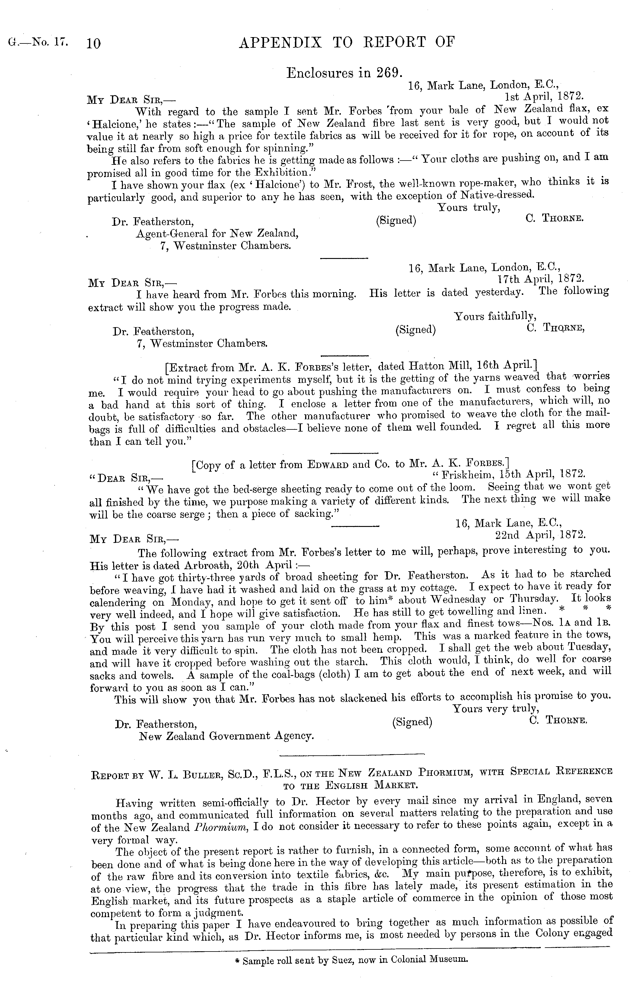 Enclosures in 269. 16, Mark Lane, London, E.C., My Dear Sir,— lst AP"b 18?2. With regard to the sample I sent Mr. Forbes 'from your bale of New Zealand flax, ex ' Halcione,'he states:—"The sample of New Zealand fibre last sent is very good, but I would not value it at nearly so high a price for textile fabrics as will be received for it for rope, on account of its being still far from soft enough for spinning." He also refers to the fabrics he is getting made as follows :—" Your cloths are pushing on, and I am promised all in good time for the Exhibition." I have shown your flax (ex ' Halcione') to Mr. Frost, the well-known rope-maker, who thinks it is particularly good, and superior to any he has seen, with the exception of Native-dressed. Yours truly, Dr. Featherston, (Signed) C. Thorne. Agent-General for New Zealand, 7, Westminster Chambers. 16, Mark Lane, London, E.C., My Dear Sir,— 17th April, 1872. _ I have heard from Mr. Forbes this morning. His letter is dated yesterday. Ihe following extract will show you the progress made. Yours faithfully, Dr. Featherston, (Signed) C. Thqjine, 7, Westminster Chambers. [Extract from Mr. A. K. Forbes's letter, dated Hatton Mill, 16th April] " I do not mind trying experiments myself, but it is the getting of the yarns weaved that worries me. I would require your head to go about pushing the manufacturers on. I must confess to being a bad hand at this sort of thing. I enclose a letter from one of the manufacturers, which will, no doubt, be satisfactory so far. The other manufacturer who promised to weave the cloth for the mailbags is full of difficulties and obstacles—l believe none of them well founded. I regret all this more than I can tell you." [Copy of a letter from Edward and Co. to Mr. A. K. Forbes.] "Dear Sir " Friskheim, 15th April, 1872. "We have got the bed-serge sheeting ready to come out of the loom. Seeing that we wont get all finished by the time, we purpose making a variety of different kinds. The next thing we will make will be the coarse serge ; then a piece of sacking." 16, Mark Lane, E.C., My Dear Sir— 22nd April, 1872. The following extract from Mr. Forbes's letter to me will, perhaps, prove interesting to you. His letter is dated Arbroath, 20th April : — " I have got thirty-three yards of broad sheeting for Dr. Featherston. As it had to be starched before weaving, I have had it washed and laid on the grass at my cottage. I expect to have it ready for calendering on Monday, and hope to get it sent off to him* about Wednesday or Thursday. It looks very well indeed, and I hope will give satisfaction. He has still to get towelling and linen. * By this post I send you sample of your cloth made from your flax and finest tows —Nos._ 1a and Ib. You will perceive this yarn has run very much to small hemp. This was a marked feature in the tows, and made it very difficult to spin. The cloth has not been cropped. I shall get the web about Tuesday, and will have it cropped before washing out the starch. This cloth would, I think, do well for coarse sacks and towels. A sample of the coal-bags (cloth) lam to get about the end of next week, and will forward to you as soon as I can." This will show you that Mr. Forbes has not slackened his efforts to accomplish his promise to you. Yours very truly, Dr. Featherston, (Signed) C. Thorne, New Zealand Government Agency.