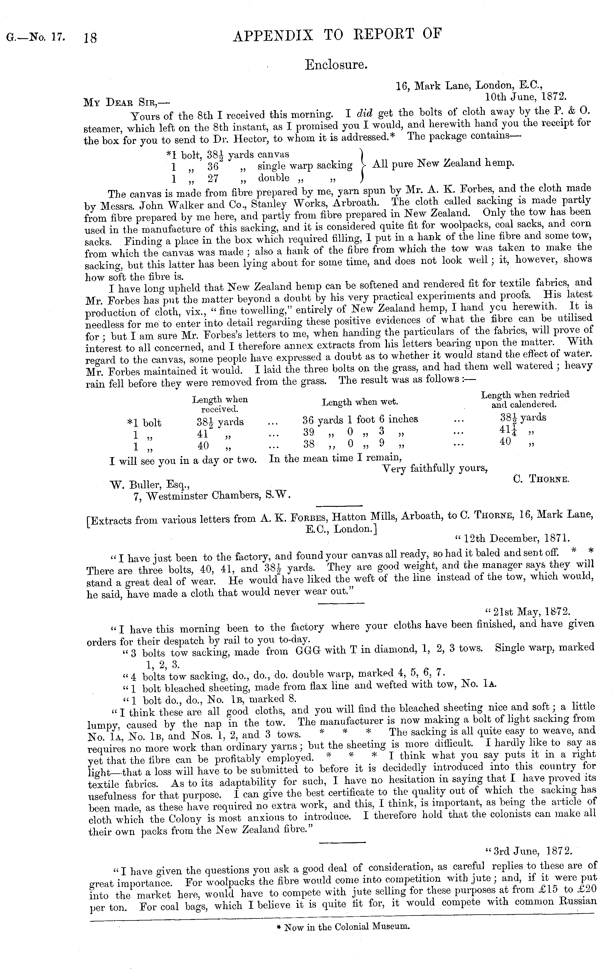 Enclosure. 16, Mark Lane, London, E.C., My Dear Sir,- 10th June, 1872 Yours of the Bth I received this morning. I did get the bolts ot cloth away by the P. &O. steamer which left on the Bth instant, as I promised you I would, and herewith hand you the receipt for the box for you to send to Dr. Hector, to whom it is addressed.* The package contains— *1 bolt, 381 yards canvas ) 1 „ 36" ~ single warp sacking V All pure New Zealand hemp. 1 „ 27 „ double „ „ ) The canvas is made from fibre prepared by me, yarn spun by Mr. A. K. Forbes and the cloth made by Messrs. John Walker and Co., Stanley Works, Arbroath. The cloth called sacking is made partly from fibre prepared by me here, and partly from fibre prepared m New Zealand. Only the tow has been used in the manufacture of this sacking, and it is considered quite fit for woolpacks, coal sacks, and corn sacks Finding a place in the box which required filling, 1 put in a hank of the line fibre and some tow, from which the canvas was made ; also a hank of the fibre from which the tow was taken to make the sacking, but this latter has been lying about for some time, and does not look well; it, however, shows how soft the fibre is. , . ■ . . ... „ , . , I have long upheld that New Zealand hemp can be softened and rendered fit for textile fabrics and Mr Forbes has put the matter beyond a doubt by his very practical experiments and proofs. His latest production of cloth, vix., "fine towelling," entirely of New Zealand hemp I hand you herewith. It is needless for me to enter into detail regarding these positive evidences of what the fibre can be utilised for • but I am sure Mr. Forbes's letters to me, when handing the particulars of the fabrics, will prove ot interest to all concerned, and I therefore annex extracts from his letters bearing upon the matter With regard to the canvas, some people have expressed a doubt as to whether it would stand the effect of water. Mr. Forbes maintained it would. I laid the three bolts on the grass, and had them well watered ; heavy rain fell before they were removed from the grass. The result was as follows :— T _lv v Length when redried Length when Length when wet. afd calendered, received. *1 bolt 381 yards ... 36 yards 1 foot 6 inches ... 381 yards 1 „ 41 „ ... 39 „ 0„ 3 „ ... 41i „ 1 40 „ ... 38 „_ 0„9 _ „ ... 40 „ I will see you in a day or two. In the mean time I remain, Very faithfully yours, W. Buller, Esq., C- ThOKNK 7, Westminster Chambers, S.W. [Extracts from various letters from A. K. Forbes, Hatton Mills, Arboath, to C. Thorne, 16, Mark Lane, E.C., London.] " 12th December, 1871. " I have inst been to the factory, and found your canvas all ready, so had it baled and sent off * * There are three bolts, 40, 41, and 38} yards. They are good weight, and the manager says they wi 1 stand a great deal of wear. He would have liked the weft of the line instead of the tow, which would, he said, have made a cloth that would never wear out." "21st May, 1872. " I have this morning been to the factory where your cloths have been finished, and have given orders for their despatch by rail to you to-day. ninoj . cr i ii " 3 bolts tow sacking, made from GGG with Tin diamond, 1, 2, 3 tows. Single warp, marked 12 3. " 4 bolts'tow sacking, do., do., do. double warp, marked 4, 5, 6, 7. " 1 bolt bleached sheeting, made from flax line and wefted with tow, No. la. "1 bolt do., do., No. Ib, marked 8. ~,,,- • , a. tj-j-i "I think these are all good cloths, and you will find the bleached sheeting nice and soft; a little lumpy caused by the nap in the tow. The manufacturer is now making a bolt of light sacking from No. IA, No. Ib, and Nos. 1, 2, and 3 tows. * * * The sacking is all quite easy to weave, and requires no more work than ordinary yarns; but the sheeting is more difficult. I hard y like to say as yet that the fibre can be profitably employed. * * * I think what you say puts it m a right lia-ht—that a loss will have to be submitted to before it is decidedly introduced into this country for textile fabrics. As to its adaptability for such, I have no hesitation in saying that I have proved its usefulness for that purpose. I can give the best certificate to the quality out of which the sacking has been made, as these have required no extra work, and this, I think, is important, as being the article of cloth which the Colony is most anxious to introduce. I therefore hold that the colonists can make all their own packs from the New Zealand fibre."