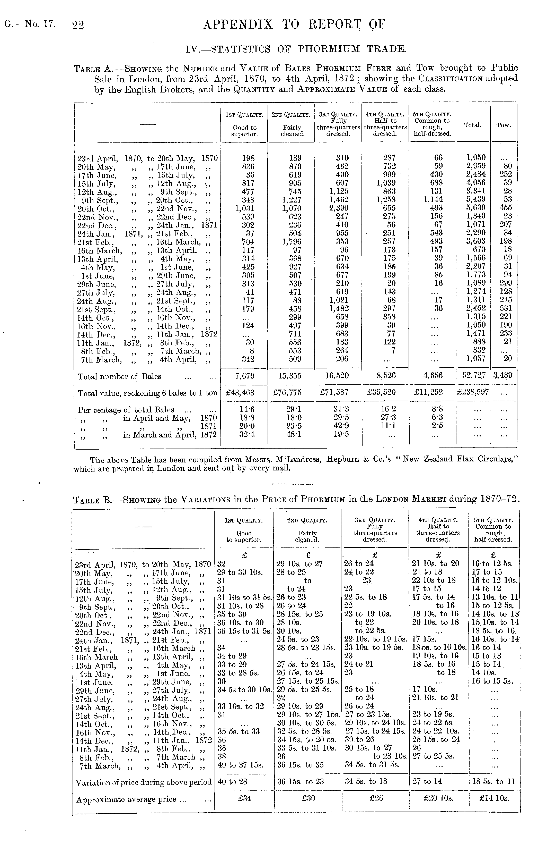 IV.—STATISTICS OF PHORMIUM TRADE. TABLE A.—SHOWING the NUMBER and VALUE of BALES PHORMIUM FIBRE and TOW brought to Public Sale in London, from 23rd April, 1870, to 4th April, 1872 ; showing the CLASSIFICATION adopted by the English Brokers, and the QUANTITY and APPROXIMATE VALUE of each class.