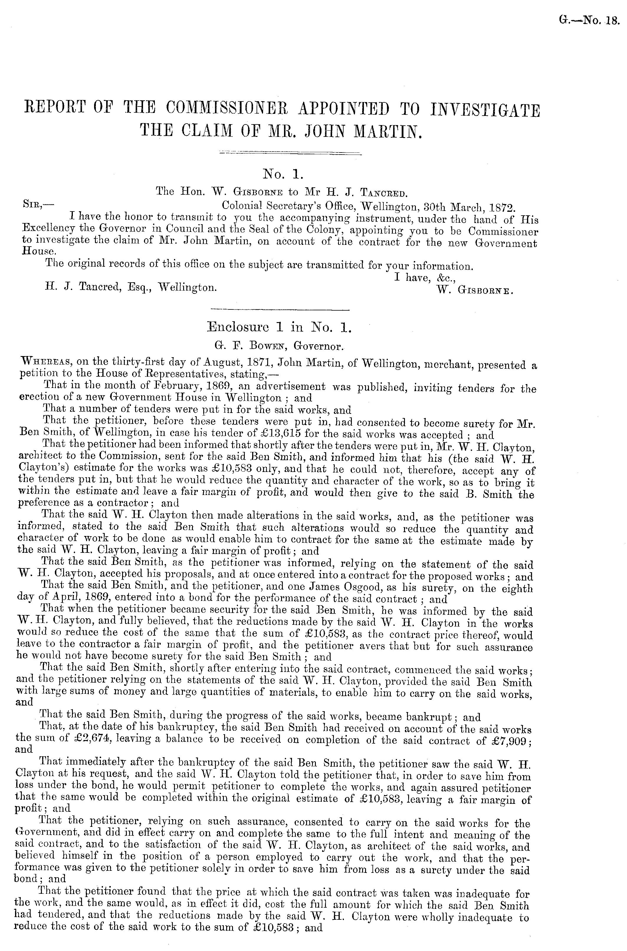 Enclosure 1 in No. 1. G. F. BowKis", Governor. Whereas, on the thirty-first day of August, 1871, John Martin, of Wellington, merchant, presented a petition to the House of Representatives, stating,— That in the month of February, 1869, an advertisement was published, inviting tenders for the erection of a new Government House in Wellington ; and That a number of tenders were put in for the said works, and That the petitioner, before these tenders were put in, had consented to become surety for Mr. Ben Smith, of Wellington, in case his tender of £13,015 for the said works was accepted ; and That the petitioner had been informed that shortly after the tenders were put in, Mr. W. H. Clayton, architect to the Commission, sent for the said Ben Smith, and informed him that his (the said W. h! Clayton's) estimate for the works was £10,583 only, and that he could not, therefore, accept any of the tenders put in, but that he would reduce the quantity and character of the work, so as to bring it ■within the estimate and leave a fair margin of profit, and would then give to the said B. Smith the preference as a contractor ; and That the said W. H. Clayton then made alterations in the said works, and, as the petitioner was informed, stated to the said Ben Smith that such alterations would so reduce the quantity and character of work to be done as would enable him to contract for the same at the estimate made by the said W. H. Clayton, leaving a fair margin of profit; and That the said Ben Smith, as the petitioner was informed, relying on the statement of the said W. H. Clayton, accepted his proposals, and at once entered into a contract for the proposed works ; and That the said Ben Smith, and the petitioner, and one James Osgood, as his surety, on the eighth day of April, 1869, entered into a bond for the performance of the said contract ; and That when the petitioner became security for the said Ben Smith, he was informed by the said W". H. Clayton, and fully believed, that the reductions made by the said W. H. Clayton in the works would so reduce the cost of the same that the sum of £10,583, as the contract price thereof, would leave to the contractor a fair margin of profit, and the petitioner avers that but for such assurance he would not have become surety for the said Ben Smith ; and That the said Ben Smith, shortly after entering into the said contract, commenced the said works; and the petitioner relying on the statements of the said W. H. Clayton, provided the said Ben Smith with large sums of money and largo quantities of materials, to enable him to carry on the said works and That the said Ben Smith, during the progress of the said works, became bankrupt; and That, at the date of his bankruptcy, the said Ben Smith had received on account of the said works the sum of £2,674, leaving a balance to be received on completion of the said contract of £7 909 • and That immediately after the bankruptcy of tho said Ben Smith, the petitioner saw the said W. H. Clayton at his request, and the said W. H. Clayton told the petitioner that, in order to save him from loss under the bond, he would permit petitioner to complete the works, and again assured petitioner that the same would be completed within the original estimate of £10,583, leaving a fair margin of profit; and That the petitioner, relying on such assurance, consented to carry on the said works for the Government, and did in effect carry on and complete the same to the full intent and meaning of the said contract, and to the satisfaction of the said W. 11. Clayton, as architect of the said works, and believed himself in the position of a person employed to carry out the work, and that the'performance was given to the petitioner solely in order to save him from loss as a surety under the said bond; and That the petitioner found that the price at which the said contract was taken was inadequate for the work, and the same would, as in effect it did, cost the full amount for which the said Ben Smith had tendered, and that the reductions made by the said W. H. Clayton were wholly inadequate to reduce the cost of the said work to the sum of £10,583 • and