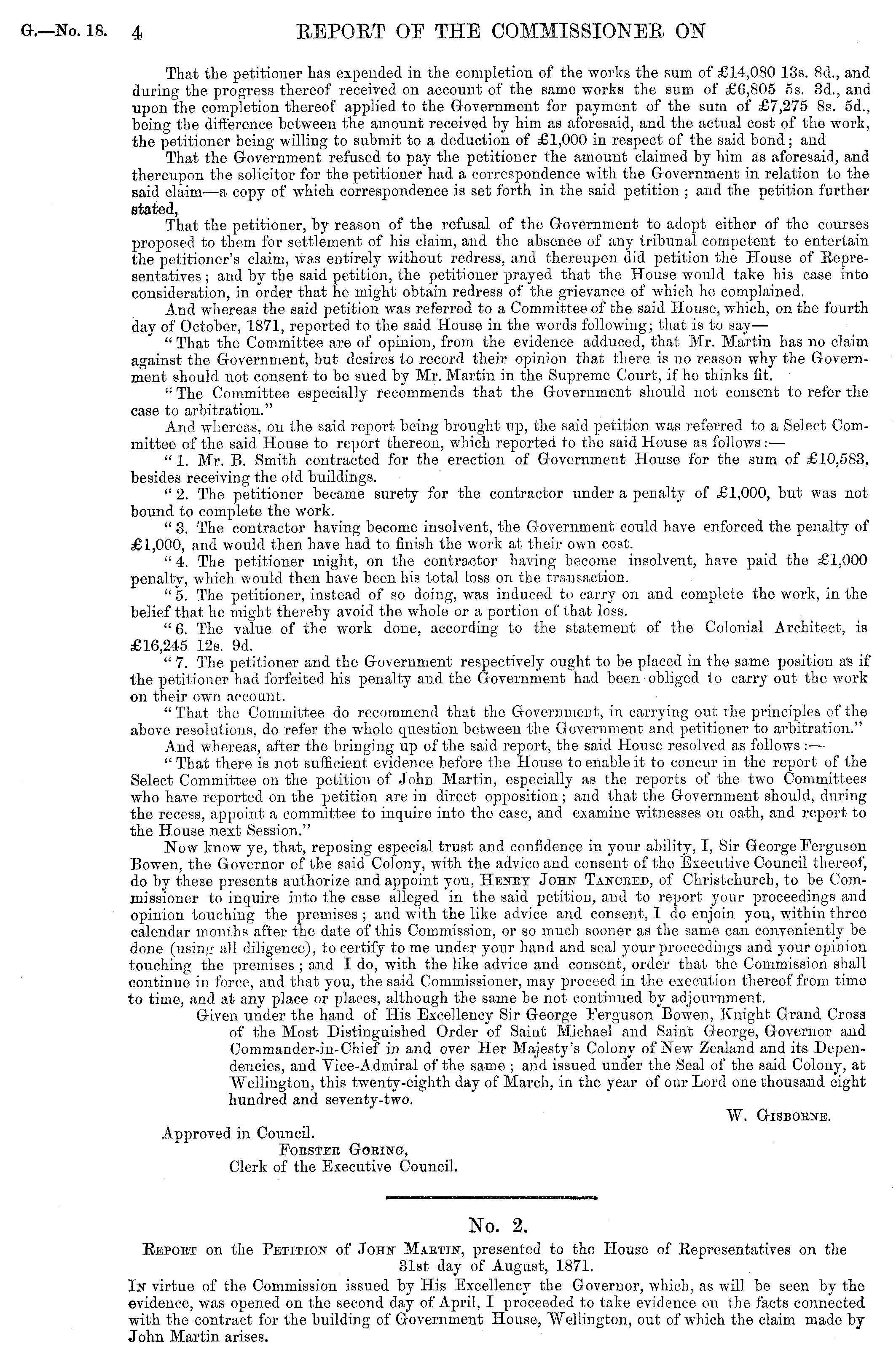 That the petitioner has expended in the completion of the works the sum of £14,080 13s. Bd., and during the progress thereof received on account of the same works the sum of £6,805 ss. 3d., and upon the completion thereof applied to the Government for payment of the sum of £7,275 Bs. 5d., being the difference between the amount received by him as aforesaid, and the actual cost of the work, the petitioner being willing to submit to a deduction of £1,000 in respect of the said bond; and That the Government refused to pay the petitioner the amount claimed by him as aforesaid, and thereupon the solicitor for the petitioner had a correspondence with the Government in relation to the said claim—a copy of which correspondence is set forth in the said petition : and the petition further stated, That the petitioner, by reason of the refusal of the Government to adopt either of the courses proposed to them for settlement of his claim, and the absence of any tribunal competent to entertain the petitioner's claim, was entirely without redress, and thereupon did petition the House of Representatives ; and by the said petition, the petitioner prayed that the House would take his case into consideration, in order that he might obtain redress of the grievance of which he complained. And whereas the said petition was referred to a Committee of the said House, which, on the fourth day of October, 1871, reported to the said House in the words following; that is to say — " That the Committee are of opinion, from the evidence adduced, that Mr. Martin has no claim against the Government, but desires to record their opinion that there is no reason why the Government should not consent to be sued by Mr. Martin in the Supreme Court, if he thinks fit. " The Committee especially recommends that the Government should not consent to refer the case to arbitration." And whereas, on the said report being brought up, the said petition was referred to a Select Committee of the said House to report thereon, which reported to the said House as follows : — " 1. Mr. B. Smith contracted for the erection of Government House for the sum of £10,583, besides receiving the old buildings. " 2. The petitioner became surety for the contractor under a penalty of £1,000, but was not bound to complete the work. " 3. The contractor having become insolvent, the Government could have enforced the penalty of £1,000, and would then have had to finish the work at their own cost. "4. The petitioner might, on the contractor having become insolvent, have paid the £1,000 penalty, which would then have been his total loss on the transaction. " 5. The petitioner, instead of so doing, was induced to carry on and complete the work, in the belief that he might thereby avoid the whole or a portion of that loss. "6. The value of the work done, according to the statement of the Colonial Architect, is £16,245 12s. 9d. " 7. The petitioner and the Government respectively ought to be placed in the same position as if the petitioner had forfeited his penalty and the Government had been obliged to carry out the work on their own account. "That the Committee do recommend that the Government, in carrying out the principles of the above resolutions, do refer the whole question between the Government and petitioner to arbitration." And whereas, after the bringing up of the said report, the said House resolved as follows : — " That there is not sufficient evidence before the House to enable it to concur in the report of the Select Committee on the petition of John Martin, especially as the reports of the two Committees who have reported on the petition are in direct opposition; and that the Government should, during the recess, appoint a committee to inquire into the case, and examine witnesses on oath, and report to the House next Session." Now know ye, that, reposing especial trust and confidence in your ability, I, Sir George Ferguson Bowen, the Governor of the said Colony, with the advice and consent of the Executive Council thereof, do by these presents authorize and appoint you, Henby John Tancbed, of Christchurch, to be Commissioner to inquire into the case alleged in the said petition, and to report your proceedings and opinion touching the premises ; and with the like advice and consent, I do enjoin you, within three calendar months after the date of this Commission, or so much sooner as the same can conveniently bo done (using all diligence), to certify to me under your hand and seal your proceedings and your opinion touching the premises ; and I do, with the like advice and consent, order that the Commission shall continue in force, and that you, the said Commissioner, may proceed in the execution thereof from time to time, and at any place or places, although the same be not continued by adjournment. Given under the hand of His Excellency Sir George Ferguson Bowen, Knight Grand Cross of the Most Distinguished Order of Saint Michael and Saint George, Governor and Commander-in-Chief in and over Her Majesty's Colony of New Zealand and its Dependencies, and Vice-Admiral of the same ; and issued under the Seal of the said Colony, at Wellington, this twenty-eighth day of March, in the year of our Lord one thousand eight hundred and seventy-two. W. Gisboene. Approved in Council. FOHSTEE GOEING, Clerk of the Executive Council.