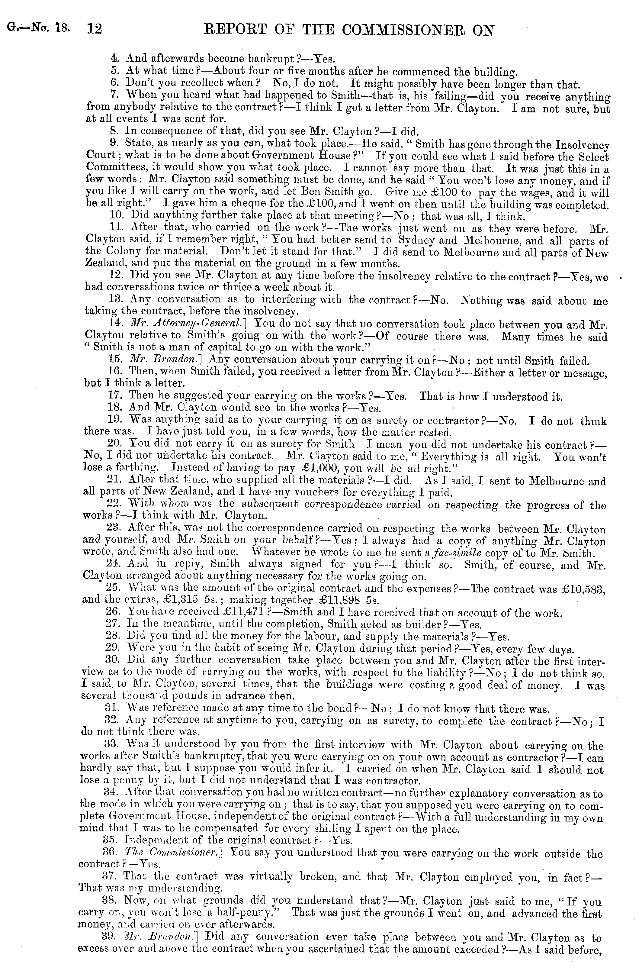 4. And afterwards become bankrupt ? —Yes. 5. At what time ?—About four or five months after lie commenced the building. 6. Don't you recollect when ? No, Ido not. It might possibly have been longer than that. 7. When you heard what had happened to Smith—that is, his failing—did you receive anything from anybody relative to the contract ? —I think I got a letter from Mr. Clayton. lam not sure, but at all events I was sent for. 8. In consequence of that, did you see Mr. Clayton ? —I did. 9. State, as nearly as you can, what took place. —He said, " Smith has gone through the Insolvency Court; what is to be done about Government House ?" If you could see what I said before the Select Committees, it would show you what took place. I cannot say more than that. It was just this in a few words : Mr. Clayton said something must be done, and he said " You won't lose any money, and if you like I will carry on the work, and let Ben Smith go. Give me £100 to pay the wages, and it will be all right." I gave him a cheque for the £100, and I went on then until the building was completed. 10. Did anything further take place at that meeting ? —No ; that was all, I think. 11. After that, who carried on the work ? —The works just went on as they were before. Mr. Clayton said, if I remember right, " You had better send to Sydney and Melbourne, and all parts of the Colony for material. Don't let it stand for that." I did send to Melbourne and all parts of New Zealand, and put the material on the ground in a few months. 12. Did you see_Mr. Clayton at any time before the insolvency relative to the contract ?—Yes, we had conversations twice or thrice a week about it. _ 13. Any conversation as to interfering with the contract ? —No. Nothing was said about me taking the contract, before the insolvency. 14. Mr. Attorney-General.'] You do not say that no conversation took place between you and Mr. Clayton relative to Smith's going on with the work ? —Of course there was. Many times he said " Smith is not a man of capital to go on with the work." 15. Mr. Brandon.'] Any conversation about your carrying it on?—No ; not until Smith failed. 16. Then, when Smith failed, you received a letter from Mr. Clayton ? —Either a letter or message, but I think a letter. 17. Then he suggested your carrying on the works ?—Yes. That is how I understood it. 18. And Mr. Clayton would see to the works ?■—Yes. 19. Was anything said as to your carrying it on as surety or contractor?— No. I do not think there was. I have just told you, in a few words, how the matter rested. 20. You did not carry it on as surety for Smith I mean you did not undertake his contract ?— No, I did not undertake his contract. Mr. Clayton said to me, " Everything is all right. You won't lose a farthing. Instead of having to pay £1,000, you will be all right." 21. After that time, who supplied all the materials ?—I did. As I said, I sent to Melbourne and all parts of New Zealand, and I have my vouchers for everything I paid. 22. With whom was the subsequent correspondence carried on respecting the progress of the works ?—I think with Mr. Clayton. 23. After this, was not the correspondence carried on respecting the works between Mr. Clayton and yourself, and Mr. Smith on your behalf? —Yes ; I always had a copy of anything Mr. Clayton wrote, and Smith also had one. Whatever he wrote to me he sent a facsimile copy of to Mr. Smith. 24. And in reply, Smith always signed for you ? —I think so. Smith, of course, and Mr. Clayton arranged about anything necessary for the works going on. 25. What was the amount of the original contract and the expenses?— The contract was £10,583, and the extras, £1,315 55.; making together £11,898 ss. 26. You have received £11,471 ?—Smith and I have received that on account of the work. 27. In the meantime, until the completion, Smith acted as builder?— Yes. 28. Did you find all the money for the labour, and supply the materials ? —Yes. 29. Were you in the habit of seeing Mr. Clayton during that period?— Yes, every few days. 30. Did any further conversation take place between you and Mr. Clayton after the first interview as to the mode of carrying on the works, with respect to the liability ? —No; I do not think so. I said, to Mr. Clayton, several times, that the buildings were costing a good deal of money. I was several thousand pounds in advance then. 31. Was reference made at any time to the bond ? —No ; I do not know that there was. 32. Any reference at anytime to you, carrying on as surety, to complete the contract ? —No; I do not think there was. 33. "Was it understood by you from the first interview with Mr. Clayton about carrying on the works after Smith's bankruptcy, that you were carrying on on your own account as contractor?—l can hardly say that, but I suppose you would infer it. I carried on when Mr. Clayton said I should not lose a penny by it, but I did not understand that I was contractor. 34. Alter that conversation you had no written contract —no further explanatory conversation as to the mode in which you were carrying on ; that is to say, that you supposed you were carrying on to complete Government House, independent of the original contract ?—With a full understanding in my own mind that I was to bo compensated for every shilling I spent on the place. 35. Independent of the original contract ? —Yes. 36. The Commissioner.] You say you understood that you were carrying on the work outside the contract ? —Yes. 37. That the contract was virtually broken, and that Mr. Clayton employed you, in fact ?— That was my understanding. 38. Now, on what grouuds did you nnderstand that?—Mr. Clayton just said tome, "If you carry on, you wont lose a half-penny." That was just the grounds I went on, and advanced the first money, and carried on ever afterwards. 39. Mr. Brandon.] Did any conversation ever take place between you and Mr. Clayton as to excess ove