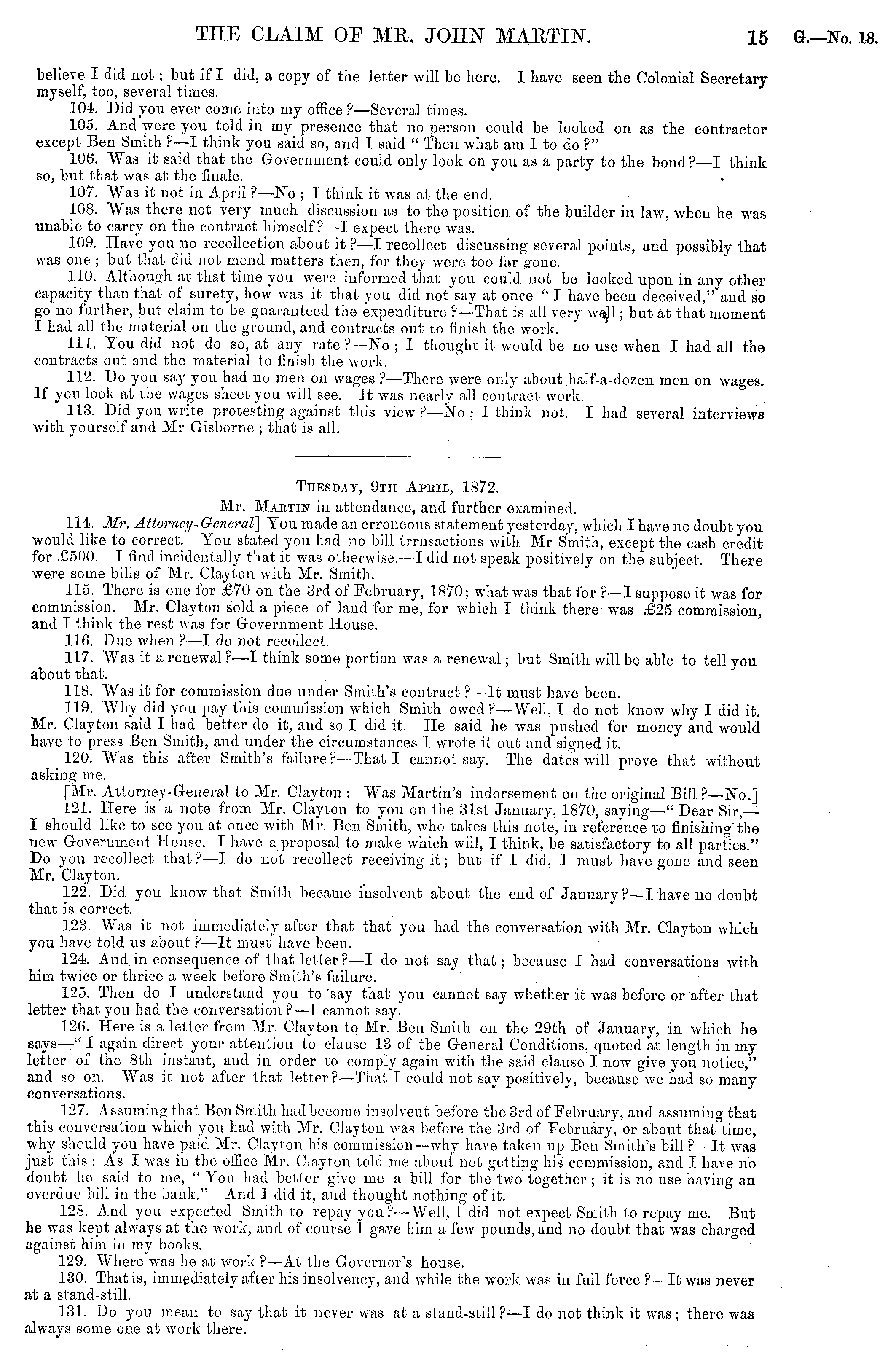 Tuesday, 9th Amil, 1872. Mr. Maktin in attendance, and further examined. 114. Mr. Attorney- General] You made an erroneous statement yesterday, which I have no doubt you would like to correct. You stated you had no bill trrusaetions with Mr Smith, except the cash credit for £500. I find incidentally that it was otherwise.—l did not speak positively on the subject. There were some bills of Mr. Clayton with Mr. Smith. 115. There is one for £70 on the 3rd of February, 1870; what was that for ?—I suppose it was for commission. Mr. Clayton sold a piece of land for me, for which I think there was £25 commission, and I think the rest was for Government House. 116. Due when ? —I do not recollect. 117. Was it a renewal ?—I think some portion was a renewal; but Smith will be able to tell you about that. 118. Was it for commission due under Smith's contract ? —lt must have been. 119. Why did you pay this commission which Smith owed ?—Well, 1 do not know why I did it. Mr. Clayton said I had better do it, and so I did it. He said he was pushed for money and would have to press Ben Smith, and under the circumstances I wrote it out and signed it. 120. Was this after Smith's failure?— That I cannot say. The dates will prove that without asking me. [Mr. Attorney-General to Mr. Clayton : Was Martin's indorsement on the original Bill ?—No.] 121. Here is a note from Mr. Clayton to you on the 31st January, 1870, saying—" Dear Sir,— I should like to see you at once with Mr. Ben Smith, who takes this note, in reference to finishing the new Government House. I have a proposal to make which will, I think, be satisfactory to all parties." Do you recollect that?—l do not recollect receiving it; but if I did, I must have gone and seen Mr. Clayton. 122. Did you know that Smith became insolvent about the end of January ?-—I have no doubt that is correct. 123. Was it not immediately after that that you had the conversation with Mr. Clayton which you have told us about ? —lt must have been. 124. And in consequence of that letter?—l do not say that; because I had conversations with him twice or thrice a week before Smith's failure. 125. Then do I understand you to say that you cannot say whether it was before or after that letter that you had the conversation ? —I cannot say. 120. Here is a letter from Mr. Clayton to Mr. Ben Smith on the 29th of January, in which he says —" I again direct your attention to clause 13 of the General Conditions, quoted at length in my letter of the Bth instant, and in order to comply again with the said clause I now give you notice," and so on. Was it not after that letter?— That I could not say positively, because we had so many conversations. 127. Assuming that Ben Smith had become insolvent before the 3rd of February, and assuming that this conversation which you had with Mr. Clayton was before the 3rd of February, or about that time, why shculd you have paid Mr. Clayton his commission—why have taken up Ben Smith's bill ? —lt was just this : As I was in the office Mr. Clayton told me about not getting his commission, and I have no doubt he said to me, "You had better give me a bill for the two together; it is no use having an overdue bill in the bank." And ] did it, and thought nothing of it. 128. And you expected Smith to repay you?— Well, I did not expect Smith to repay me. But he was kept always at the work, and of course I gave him a few pounds, and no doubt that was charged against him in my books. 129. Where was he at work ? —At the Governor's house. 130. That is, immediately after his insolvency, and while the work was in full force ?—lt was never at a stand-still. 131. Do you mean to say that it never was at a stand-still ? —I do not think it was; there was always some one at work there.