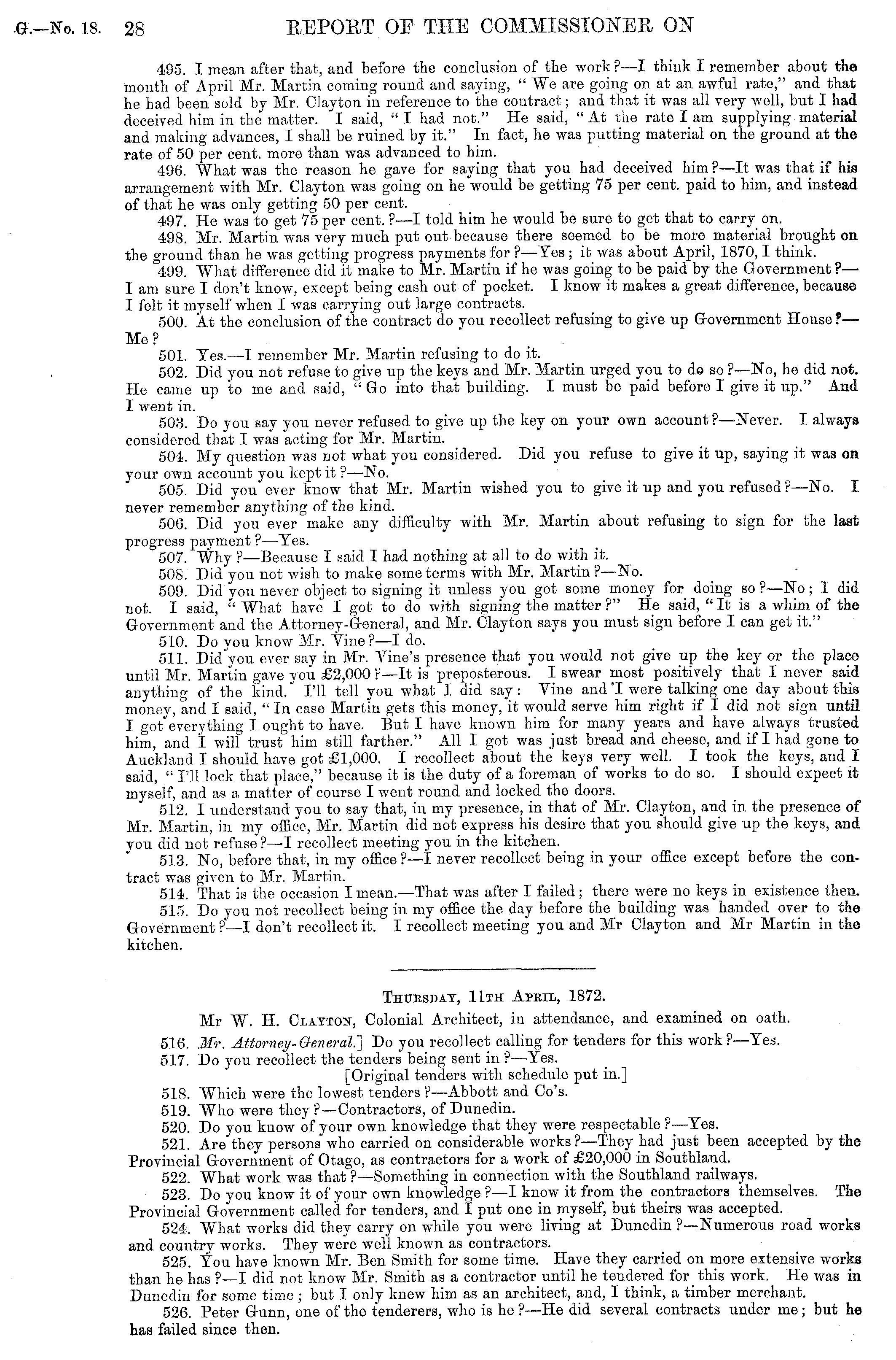 TmmsDAY, ILth Apbii, 1872. Mr W. H. Clayton, Colonial Architect, in attendance, and examined on oath. 516. Mr. Attorney-General.'] Do you recollect calling for tenders for this work?—Tes. 517. Do you recollect the tenders being sent in ? —Tes. [Original tenders with schedule put in.] 518. Which were the lowest tenders ? —Abbott and Cos. 519. Who were they ? —Contractors, of Dunedin. 520. Do you know of your own knowledge that they were respectable ? —Tes. 521. Are they persons who carried on considerable works? —They had just been accepted by the Provincial Government of Otago, as contractors for a work of £20,000 in Southland. 522. What work was that ? —Something in connection with the Southland railways. 523. Do you know it of your own knowledge ?—I know it from the contractors themselves. The Provincial Government called for tenders, and I put one in myself, but theirs was accepted. 524. What works did they carry on while you were living at Dunedin ?—Numerous road works and country works. They were well known as contractors. 525. You have known Mr. Bon Smith for some time. Have they carried on more extensive works than he has ?—I did not know Mr. Smith as a contractor until he tendered for this work. He was in Dunedin for some time ; but I only knew him as an architect, and, I think, a timber merchant. 526. Peter Gunn, one of the tenderers, who is he ?—He did several contracts under me; but he has failed since then.