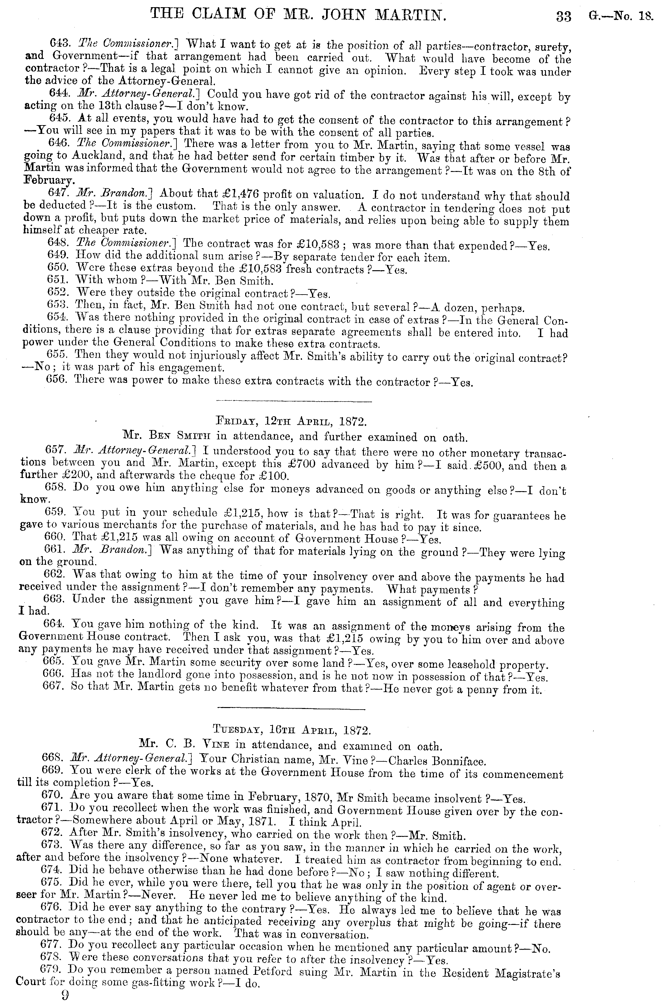 Peidax, 12th Apeil, 1872. Mr. Bex Smith in attendance, and further examined on oath. 657. Mr. Attorney-General.] I understood you to say that there were no other monetary transactions between you and Mr. Martin, except this £700 advanced by him ?—I said. £500, and then a further £200, and afterwards the cheque for £100. 658. Do you owe him anything else for moneys advanced on goods or anything else ?—I don't know. 059. Ton put in your schedule £1,215, how is that?— That is right. It was for guarantees he gave to various merchants for the purchase of materials, and he has had to pay it since. 660. That £1,215 was all owing on account of Government House ?—Tes. 661. Mr. Brandon.] Was anything of that for materials lying on the ground ? —They were lyinoon the ground. ° 662. Was that owing to him at the time of your insolvency over and above the payments he had received under the assignment ? —I don't remember any payments. What payments ? 663. Under the assignment you gave him?—l gave "him an assignment of all and everything I had. 664. You gave him nothing of the kind. It was an assignment of the moneys arising from the Government House contract. Then I ask you, was that £1,215 owing by you to"him over and above any payments he may have received under that assignment?—Tes. 665. You gave Mr. Martin some security over some land ?—Tes, over some leasehold property. 666. Has not the landlord gone into possession, and is he not now in possession of that ? Tes. 667. So that Mr. Martin gets no benefit whatever from that?—He never got a penny from it.
