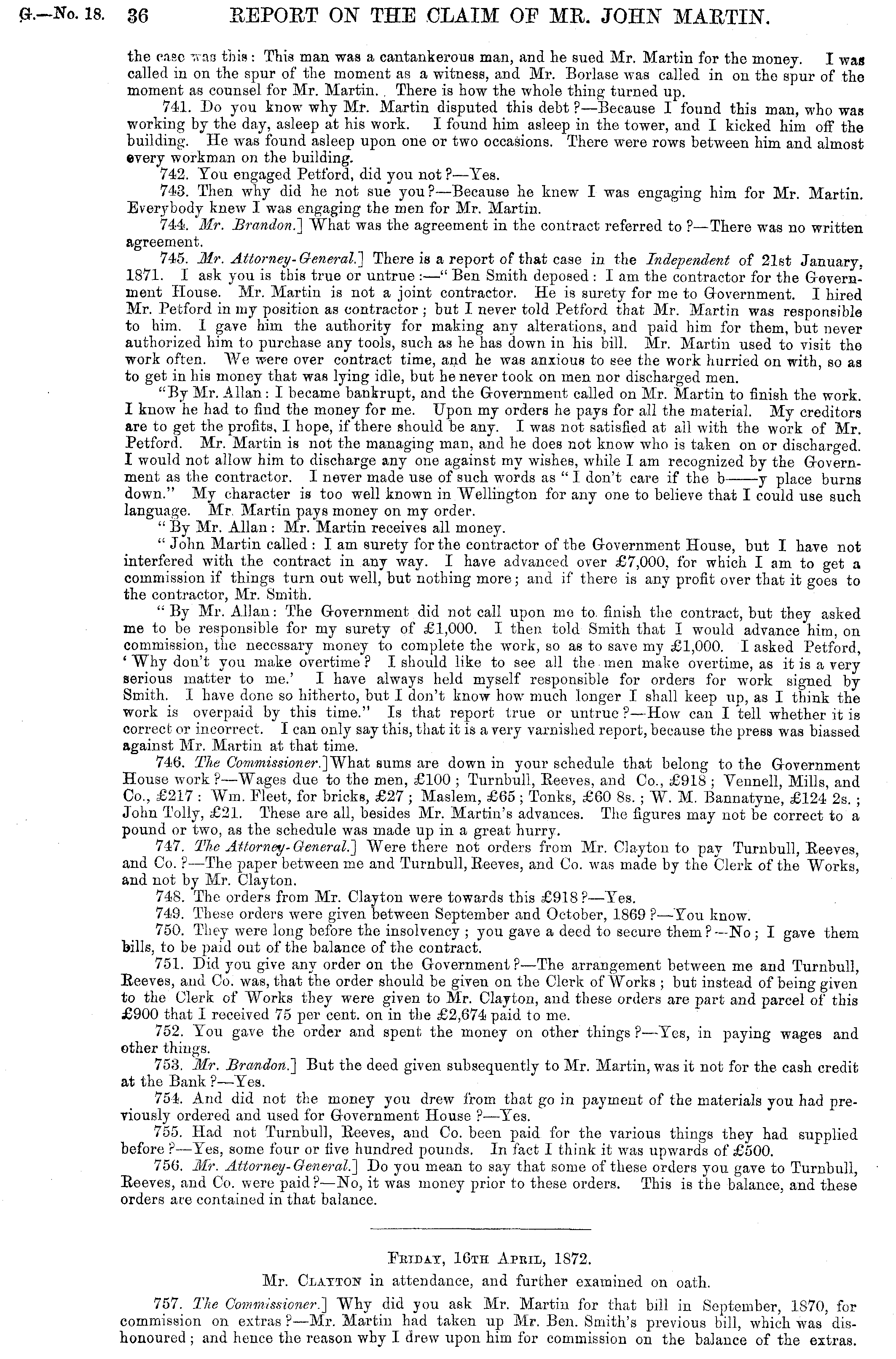 the case was this: This man was a cantankerous man, and he sued Mr. Martin for the money. I was called in on the spur of the moment aa a witness, and Mr. Borlase was called in on the spur of the moment as counsel for Mr. Martin. There is how the whole thing turned up. 741. Do you know why Mr. Martin disputed this debt ?—Because I found this man, who was working by the day, asleep at his work. I found him asleep in the tower, and I kicked him off the building. Ho was found asleep upon one or two occasions. There were rows between him and almost every workman on the building. 742. Ton engaged Petford, did you not ?—Yes. 743. Then, why did he not sue you? —Because he knew I was engaging him for Mr. Martin. Everybody knew I was engaging the men for Mr. Martin. 744. Mr. Brandon.] What was the agreement in the contract referred to ? —There was no written agreement. 745. Mr. Attorney-General.'] There is a report of that case in the Independent of 21st January. 1871. I ask you is this true or untrue :—" Ben Smith deposed :I am the contractor for the Government House. Mr. Martin is not a joint contractor. He is surety for me to Government. I hired Mr. Petford in my position as contractor ; but I never told Petford that Mr. Martin was responsible to him. 1 gave him the authority for making any alterations, and paid him for them, but never authorized him to purchase any tools, such as he has down in his bill. Mr. Martin used to visit the work often. We were over contract time, and he was anxious to see the work hurried on with, so as to get in his money that was lying idle, but he never took on men nor discharged men. "By Mr. Allan: I became bankrupt, and the Government called on Mr. Martin to finish the work. I know he had to find the money for me. Upon my orders he pays for all the material. My creditors are to get the profits, I hope, if there should be any. I was not satisfied at all with the work of Mr. Petford. Mr. Martin is not the managing man, and he does not know who is taken on or discharged. I would not allow him to discharge any one against my wishes, while I am recognized by the Government as the contractor. I never made use of such words as " I don't care if the by place burns down." My character is too well known in Wellington for any one to believe that I could use such language. Mr, Martin pays money on my order. "By Mr. Allan: Mr. Martin receives all money. " John Martin called : I am surety for the contractor of the Government House, but I have not interfered with the contract in any way. I have advanced over £7,000, for which I am to get a commission if things turn out well, but nothing more; and if there is any profit over that it goes to the contractor, Mr. Smith. " By Mr. Allan: The Government did not call upon me to. finish the contract, but they asked me to be responsible for my surety of £1,000. I then told Smith that I would advance him, on commission, the necessary money to complete the work, so as to save my £1,000. I asked Petford, ' Why don't you make overtime ? I should like to see all the men make overtime, as it is a very serious matter to me.' I have always held myself responsible for orders for work signed by Smith. I have done so hitherto, but I don't know how much longer I shall keep up, as I think the work is overpaid by this time." Is that report true or untrue ?—How can I tell whether it is correct or incorrect. I can only say this, that it is a very varnished report, because the press was biassed against Mr. Martin at that time. 746. The Commissioner ,] What sums are down in your schedule that belong to the Government House work ? —Wages due to the men, £100 ; Turnbull, Beeves, and Co., £918 ; Vennell, Mills, and Co., £217 : Wm. Fleet, for bricks, £27 ; Maslem, £65 ; Tonks, £60 Bs. ; W. M. Bannatyne, £124 2s. ; John Tolly, £21. These are all, besides Mr. Martin's advances. The figures may not be correct to a pound or two, as the schedule was made up in a great hurry. 747. The Attorney-General.] Were there not orders from Mr. Clayton to pay Turnbull, Eeeves, and Co. ? —The paper between me and Turnbull, Eeeves, and Co. was made by the Clerk of the Works, and not by Mr. Clayton. 748. The orders from Mr. Clayton were towards this £918 ?—Yes. 749. These orders were given between September and October, 1869 ? —You know. 750. They were long before the insolvency ; you gave a deed to secure them? —No ; I gave them bills, to be paid out of the balance of the contract. 751. Did you give any order on the Government ?—The arrangement between me and Turnbull, Eeeves, and Co. was, that the order should be given on the Clerk of Works ; but instead of being given to the Clerk of Works they were given to Mr. Clayton, and these orders are part and parcel of this £900 that I received 75 per cent, on in the £2,674 paid to mo. 752. You gave the order and spent the money on other things ?■ —Yes, in paying wages and other things. 753. Mr. Brandon.] But the deed given subsequently to Mr. Martin, was it not for the cash credit at the Bank ?—Yes. 754. And did not the money you drew from that go in payment of the materials you had previously ordered and used for Government House ? —Yes. 755. Had not Turnbull, Eeeves, and Co. been paid for the various things they had supplied before ? —Yes, some four or five hundred pounds. In fact I think it was upwards of £500. 75G. Mr. Attorney-General.] Do you mean to say that some of these orders you gave to Turnbull, Eeeves, and Co. were paid? —No, it was money prior to these orders. This is the balance, and these orders are contained in that balance.