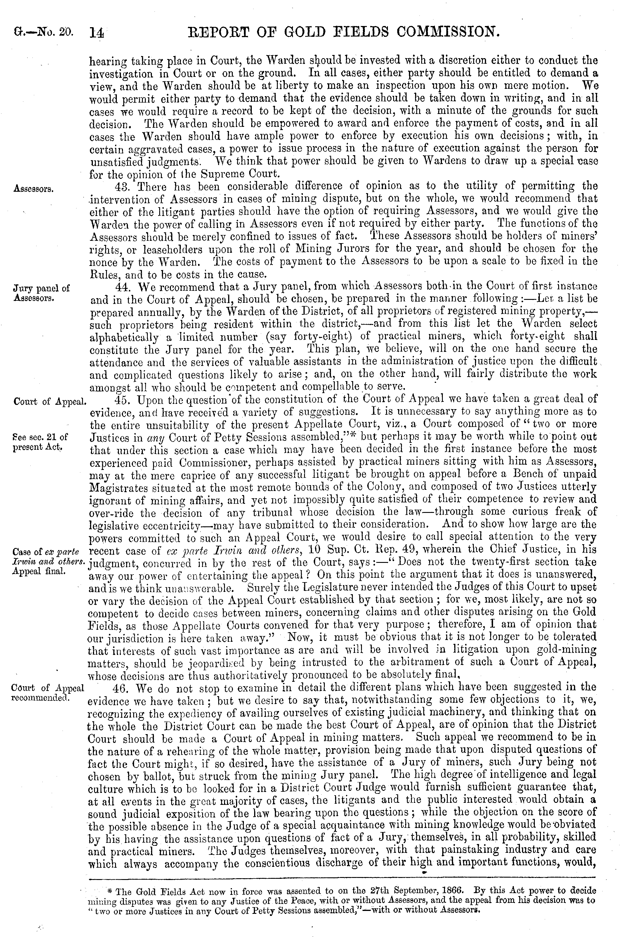 hearing taking place in Court, the Warden should be invested with a discretion either to conduct the investigation in Court or on the ground. In all cases, either party should be entitled to demand a view, and the Warden should be at liberty to make an inspection upon his own mere motion. We would permit either party to demand that the evidence should be taken down in writing, and in all cases we would require a record to be kept of the decision, with a minute of the grounds for such decision. The Warden should be empowered to award and enforce the payment of costs, and in all cases the Warden should have ample power to enforce by execution his own decisions; with, in certain aggravated cases, a power to issue process in the nature of execution against the person for unsatisfied judgments. We think that power should be given to Wardens to draw up a special ease for the opinion of Ihe Supreme Court. 43. There has been considerable difference of opinion as to the utility of permitting the ■intervention of Assessors in cases of mining dispute, but on the whole, we would recommend that either of the litigant parties should have the option of requiring Assessors, and we would give the Warden the power of calling in Assessors even if not required by either party. The functions of the Assessors should be merely confined to issues of fact. These Assessors should be holders of miners' rights, or leaseholders upon the roll of Mining Jurors for the year, and should be chosen for the nonce by the Warden. The costs of payment to the Assessors to be upon a scale to be fixed in the Rules, and to be costs in the cause. 44. We recommend that a Jury panel, from which Assessors bothin the Court of first instance an( j [ n the Court of Appeal, should be chosen, be prepared in the manner following :—Let a list be prepared annually, by the Warden of the District, of all proprietors of registered mining property,— such proprietors being resident within the district,—and from this list let the Warden select alphabetically a limited number (say forty-eight) of practical miners, which forty-eight shall constitute the Jury panel for the year. This plan, we believe, will on the one hand secure the attendance and the services of valuable assistants in the administration of justice upon the difficult and complicated questions likely to arise; and, on the other hand, will fairly distribute the work amongst all who should be competent and compellable to serve. 45. Upon the question'of the constitution of the Court of Appeal we have taken a great deal of evidence, and have received a variety of suggestions. It is unnecessary to say anything more as to the entire unsuitability of the present Appellate Court, viz,, a Court composed of " two or more Justices in any Court of Petty Sessions assembled,"* but perhaps it may be worth while to point out unc [ er this section a case which may have been decided in the first instance before the most experienced paid Commissioner, perhaps assisted by practical miners sitting with him as Assessors, may at the mere caprice of any successful litigant be brought on appeal before a Bench of unpaid Magistrates situated at the most remote bounds of the Colony, and composed of two Justices utterly ignorant of mining affairs, and yet not impossibly quite satisfied of their competence to review and over-ride the decision of any tribunal whose decision the law—through some curious freak of legislative eccentricity—may have submitted to their consideration. And to show how large are the powers committed to such an Appeal Court, we would desire to call special attention to the very recent case of ex parte Irwin and others, 10 Sup. Ct. Rep. 49, wherein the Chief Justice, in his judgment, concurred in by the rest of the Court, says:—"Does not the twenty-first section take awa y Qm p ower of en t e rtaining the appeal ?On this point the argument that it does is unanswered, and is we think unanswerable. Surely the Legislature never intended the Judges of this Court to upset or vary the decision of the Appeal Court established by that section ; for we, most likely, are not so competent to decide cases between miners, concerning claims and other disputes arising on the Gold Fields, as those Appellate Courts convened for that very purpose; therefore, I am of opinion that our jurisdiction is here taken away." Now, it must be obvious that it is not longer to be tolerated that interests of such vast importance as are and will be involved in litigation upon gold-mining matters, should be jeopardised by being intrusted to the arbitrament of such a Court of Appeal, whose decisions are thus authoritatively pronounced to be absolutely final. 46. We do not stop to examine in detail the different plans which have been suggested in the evidence we have taken; but we desire to say that, notwithstanding some few objections to it, we, recognizing the expediency of availing ourselves of existing judicial machinery, and thinking that on the whole the District Court can be made the best Court of Appeal, are of opinion that the District Court should be made a Court of Appeal in mining matters. Such appeal we recommend to be in the nature of a rehearing of the whole matter, provision being made that upon disputed questions of fact the Court might, if so desired, have the assistance of a Jury of miners, such Jury being not chosen by ballot, but struck from the mining Jury panel. The high degree of intelligence and legal culture which is to be looked for in a District Court Judge would furnish sufficient guarantee that, at all events in the great majority of cases, the litigants and the public interested would obtain a sound judicial exposition of the law bearing upon the questions ; while the objection on the score of the possible absence in the Judge of a special acquaintance with mining knowledge would be obviated by his having the assistance upon questions of fact of a Jury, themselves, in all probability