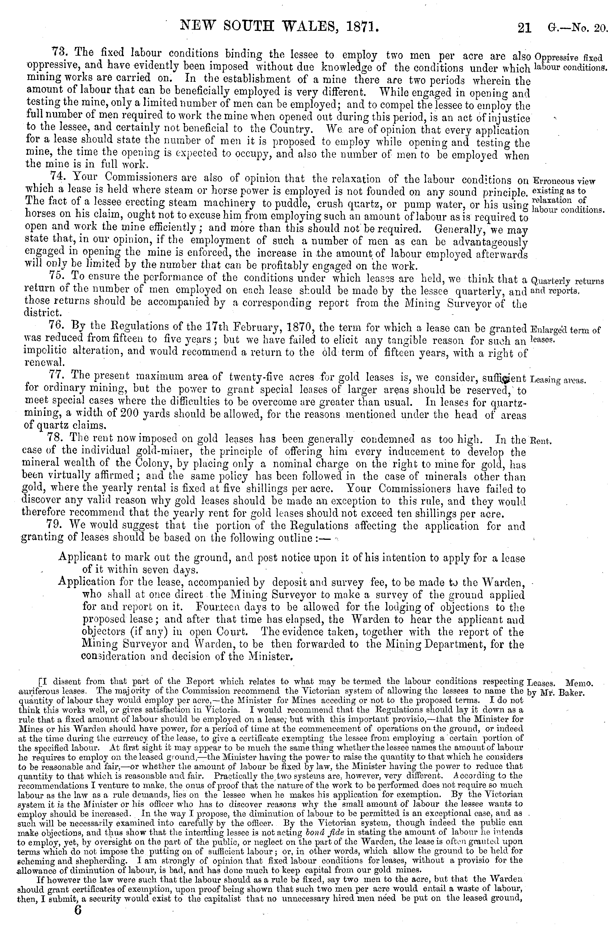 73. The fixed labour conditions binding the lessee to employ two men per acre are als< oppressive, and have evidently been imposed without due knowledge of the conditions under which mining works are carried on. In the establishment of a mine there are two periods wherein tin amount of labour that cau be beneficially employed is very different. While engaged in opening anc testing the mine, only a limited number of men can he employed; and to compel the lessee to employ the full number of men required to work the mine when opened out during this period, is an act of injustice to the lessee, and certainly not beneficial to the Country. We are of opinion that every application for a lease should state the number of men it is proposed to employ while opening and testing the mine, the time the opening is expected to occupy, and also the number of men to be employed when the mine is in full work. 74. Your Commissioners are also of opinion that the relaxation of the labour conditions on which a lease is held where steam or horse power is employed is not founded on any sound principle. The fact of a lessee erecting steam machinery to puddle, crush quartz, or pump water, or his usinohorses on his claim, ought not to excuse him from employing such an amount of labour as is required to open and work the mine efficiently; and more than this should not be required. Generally, we may state that, in our opinion, if the employment of such a number of men as can be advantageously engaged in opening the mine is enforced, the increase in the amount of labour employed afterwards will only be limited by the number that can be profitably engaged on the work. 75. ensure the performance of the conditions under which leases are held, we think that a return of the number of men employed on each lease should be made by the lessee quarterly, and those returns should be accompauied by a corresponding report from the Mining Surveyor of the district. 76. By the Regulations of the 17th February, 1870, the term for which a lease can be granted was reduced from fifteen to five years ; but we have failed to elicit any tangible reason for such an impolitic alteration, and would recommend a return to the old term of fifteen years, with a right of renewal. 77. The present maximum area of twenty-five acres for gold leases is, we consider, sufficient for ordinary mining, but tho power to grant special leases of larger areas should be reserved, to meet special^ cases where the difficulties to be overcome are greater than usual. In leases for quartzmining, a width of 200 yards should be allowed, for the reasons mentioned under the head of areas of quartz claims. 78. The rent now imposed on gold leases has been generally condemned as too high. In the case of the individual gold-miner, the principle of offering him every inducement to develop the mineral wealth of the Colony, by placing only a nominal charge on the right to mine for gold, lias been virtually affirmed; and the same policy has been followed in the case of minerals other than gold, where the yearly rental is fixed at five shillings per acre. Your Commissioners have failed to discover any valid reason why gold leases should be made an exception to this rule, and they would therefore recommend that the yearly rent for gold leases should not exceed ten shillings per acre. 79. We would suggest that the portion of the Regulations affecting the application for and granting of leases should be based on the following outline : — Applicant to mark out the ground, and post notice upon it of his intention to apply for a lease of it within seven days. Application for the lease, accompanied by deposit and survey fee, to be made to the Warden, who shall at once direct the Mining Surveyor to make a survey of the ground applied for and report on it. Fourteen days to be allowed for the lodging of objections to the proposed lease; and after that time has elapsed, the Warden to hear the applicant and objectors (if any) in open Court. The evidence taken, together with the report of the Mining Surveyor and Warden, to be then forwarded to the Mining Department, for the consideration and decision of the Minister. [I dissent from that part of the Beport which relates to what may be termed the labour conditions respecting ; auriferous leases. The majority of the Commission recommend the Victorian system of allowing the lessees to name the] quantity of labour they would employ per acre, —the Minister for Mines acceding or not to the proposed terms. Ido not think this works well, or gives satisfaction in Victoria. I would recommend that the Eegulations should lay it down as a rule that a fixed amount of labour should be employed on a lease, but with this important provisio,—that the Minister for Mines or his Warden should have power, for a period of time at the commencement of operations on the ground, or indeed at tho time during the currency of the lease, to give a certificate exempting the lessee from employing a certain portion of the specified labour. At first sight it may appear to be much the same thing whether the lessee names the amount of labour he requires to employ on the leased ground, —the Minister having the power to raise the quantity to that wdiieh he considers to be reasonable and fair, —or whether the amount of labour be fixed by law, the Minister having the power to reduce that quantity to that which is reasonable and fair. Practically the two systems are, however, very different. According to the recommendations I venture to make, the onus of proof that the nature of the work to be performed does not require so much labour as the law as a rule demands, lies on the lessee when he makes his application for exemption. By the Victorian system it is the Minister or his officer who has to discover reasons why the small amount of labour the lessee wants to employ should be increased. In the way I propose, the diminution of labour to be permitted is an exceptional case,