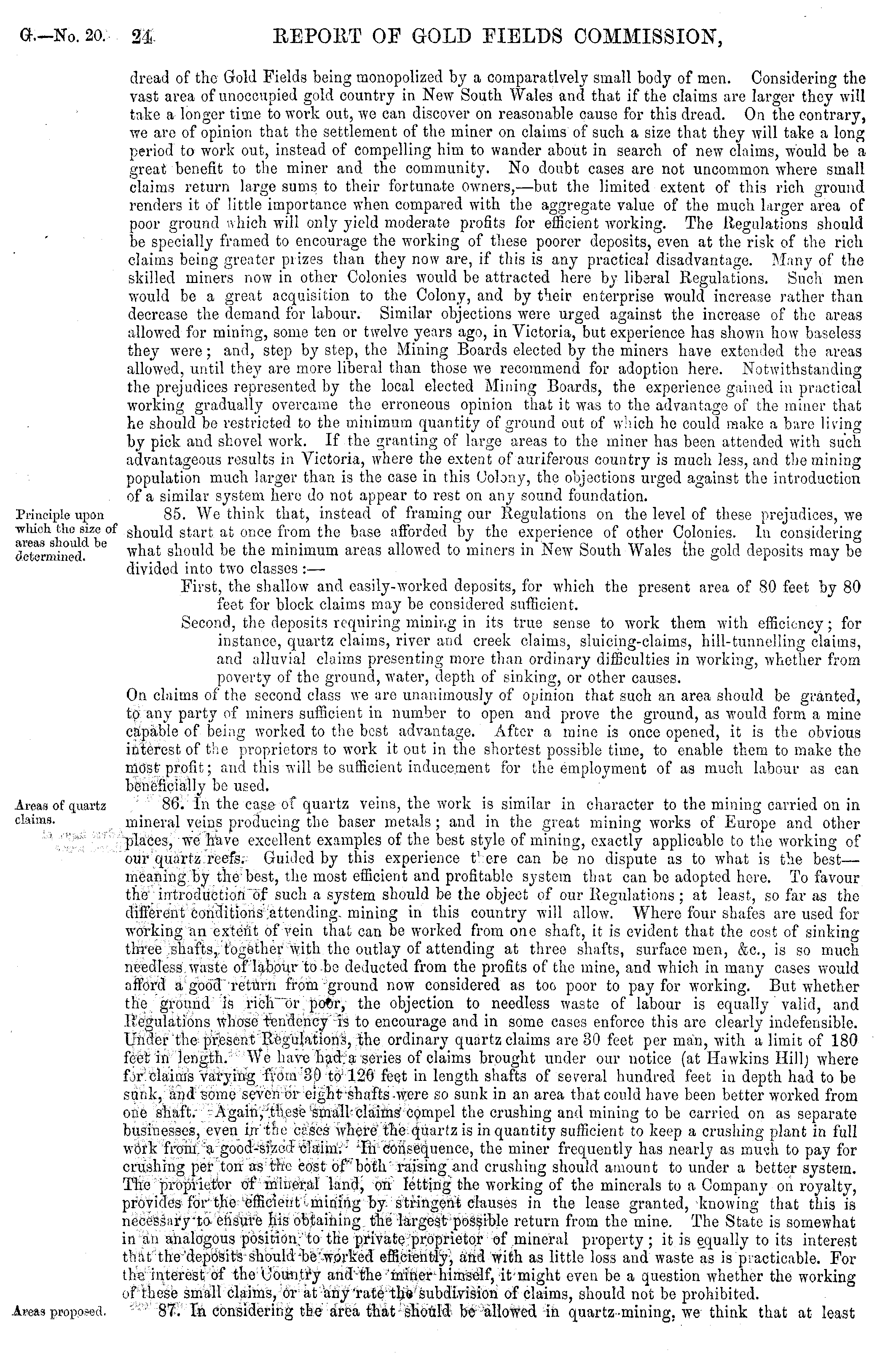 dread of tho Gold Fields being monopolized by a comparatively small body of men. Considering the vast area of unoccupied gold country in New South Wales and that if tho claims are larger they will take a longer time to work out, we can discover on reasonable cause for this dread. On the contrary, we arc of opinion that the settlement of tho miner on claims of such a size that they will take a long period to work out, instead of compelling him to wander about in search of new claims, would be a great benefit to the miner and the community. No doubt cases are not uncommon where small claims return large sums to their fortunate Owners, —but the limited extent of this rich ground renders it of little importance when compared with the aggregate value of the much larger area of poor ground which will only yield moderate profits for efficient working. The Regulations should be specially framed to encourage the working of these poorer deposits, even at the risk of the rich claims being greater prizes than they now are, if this is any practical disadvantage. Many of the skilled miners now in other Colonies would be attracted here by liberal Regulations. Such men would be a great acquisition to the Colony, and by their enterprise would increase rather than decrease the demand for labour. Similar objections were urged against the increase of the areas allowed for mining, some ten or twelve years ago, in Victoria, but experience has shown how baseless they were; and, step by step, the Mining Boards elected by the miners have extended the areas allowed, until they are more liberal than those we recommend for adoption here. Notwithstanding the prejudices represented by the local elected Mining Boards, the experience gained in practical working gradually overcame the erroneous opinion that it was to the advantage of the miner that he should be restricted to the minimum quantity of ground out of wliich ho could make a bare living by pick and shovel work. If the granting of large areas to the miner has been attended with such advantageous results in Victoria, where the extent of auriferous country is much less, and the mining population much larger than is the case in thi3 Colony, the objections urged against the introduction of a similar system here do not appear to rest on any sound foundation. 85. We think that, instead of framing our Regulations on the level of these prejudices, we should start at once from the base afforded by the experience of other Colonies. In considering what should be the minimum areas allowed to miners in New South Wales the gold deposits may be divided into two classes : — First, the shallow and easily-worked deposits, for which the present area of 80 feet by 80 feet for block claims may be considered sufficient. Second, the deposits requiring mining in its true sense to work them with efficiency; for instance, quartz claims, river and creek claims, sluicing-claims, hill-tunnelling claims, and alluvial claims presenting more than ordinary difficulties in working, whether from poverty of tho ground, water, depth of sinking, or other causes. On claims of the second class we are unanimously of opinion that such an area should be granted, to any party of miners sufficient in number to open and prove the ground, as would form a mine capable of being worked to the best advantage. After a mine is once opened, it is the obvious interest of the proprietors to work it out in the shortest possible time, to enable them to make the most profit; and this will bo sufficient inducement for the employment of as much labour as can beneficially be used. 86. In the cas^ of quartz veins, the work is similar in character to the mining carried on in mineral veins producing the baser metals ; and in the great mining works of Europe and other places, we have excellent examples of the best style of mining, exactly applicable to the working of our quartz reefs. Guided by this experience there can be no dispute as to what is the best— meaning by the best, the most efficient and profitable system that can bo adopted here. To favour the introduction of such a system should be the object of our Regulations ; at least, so far as the different conditions attending, mining in this country will allow. Where four shafes are used for working an extent of vein that can be worked from one shaft, it is evident that the cost of sinking three shafts,, together with the outlay of attending at three shafts, surfacemen, &c, is so much needless, waste of labour to be deducted from the profits of the mine, and which in many cases would afford a good return from ground now considered as too poor to pay for working. But whether the ground is rich "Or po*r, the objection to needless waste of labour is equally valid, and Regulations whose tendency is to encourage and in some cases enforce this are clearly indefensible. Under the present Regulations, the ordinary quartz claims are 30 feet per man, with a limit of 180 feet in length. We have had. a series of claims brought under our notice (at Hawkins Hill) where fori claims varying from 30 to 120 feet in length shafts of several hundred feet in depth had to be sunk, and some seven or eight-shafts were so sunk in an area that could have been better worked from one shaft. Again,'these 'Small- claims' 'compel the crushing and mining to be carried on as separate businesses, even in the esses where the-quartz is in quantity sufficient to keep a crushing plant in full work from. :a good-sfzod- claim; -Th consequence, the miner frequently has nearly as mush to pay for crushing per ton as the cost of both' raising and crushing should amount to under a better system. The proprietor of mineral land, on letting the working of the minerals to a Company on royalty, provides for'the efficient^.mining by stringent clauses in the lease granted, knowing that this is necessary'to ensure his obtaining the largest'possible return from tho mine. The State is somewhat in an analogous position