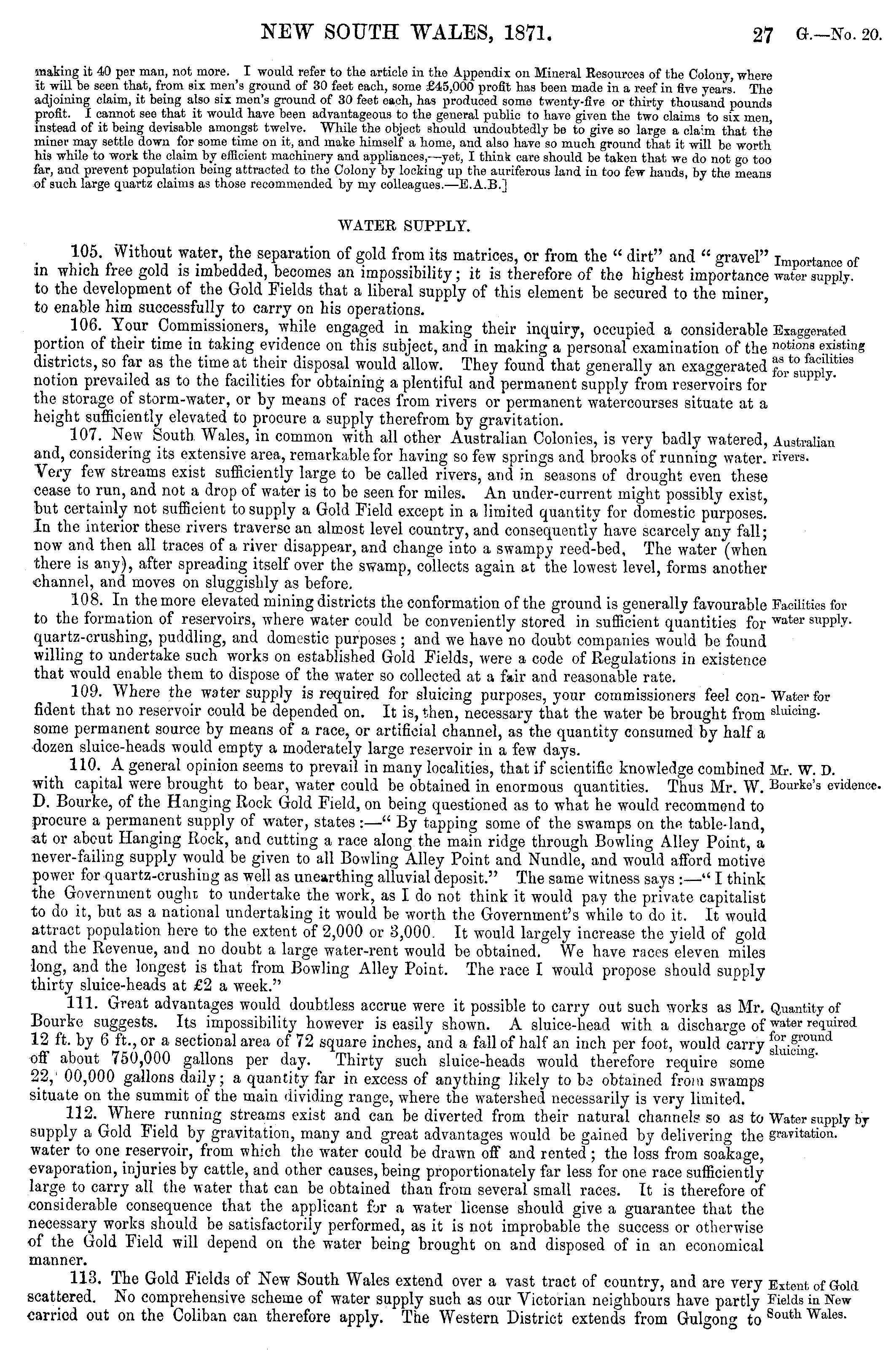 making it 40 per man, not more. I would refer to the article in the Appendix on Mineral Resources of the Colony, where it will be seen that, from six men's ground of 30 feet each, some £45,000 profit has been made in a reef in five years'. The adjoining claim, it being also six men's ground of 30 feet each, has produced some twenty-five or thirty thousand pounds profit. I cannot see that it would have been advantageous to the general public to have given the two claims to six men, instead of it being devisable amongst twelve. While tho object should undoubtedly be to give so large a cla:.m that the miner may settle down for some time on it, and make himself a home, and also have'so much ground that it will be worth his while to work the claim by efficient machinery and appliances,—yet, I think care should be taken that we do not go too far, and prevent population being attracted to the Colony by locking up the auriferous land in too few hands, by the means of such large quartz claims as those recommended by my colleagues.—E.A.B.] WATER SUPPLY. 105. Without water, the separation of gold from its matrices, or from the " dirt" and " gravel" ■ in which free gold is imbedded, becomes an impossibility; it is therefore of the highest importance : to the development of the Gold Fields that a liberal supply of this element be secured to the miner, to enable him successfully to carry on his operations. 106. Your Commissioners, while engaged in making their inquiry, occupied a considerable] portion of their time in taking evidence on this subject, and in making a personal examination of the r districts, so far as the time at their disposal would allow. They found that generally an exaggerated \ notion prevailed as to the facilities for obtaining a plentiful and permanent supply from reservoirs for the storage of storm-water, or by means of races from rivers or permanent watercourses situate at a height sufficiently elevated to procure a supply therefrom by gravitation. 107._ New South Wales, in common with all other Australian Colonies, is very badly watered,. and, considering its extensive area, remarkable for having so few springs and brooks of running water. > Very few streams exist sufficiently large to be called rivers, and in seasons of drought even these cease to run, and not a drop of water is to be seen for miles. An under-current might possibly exist, but certainly not sufficient to supply a Gold Field except in a limited quantity for domestic purposes. In the interior these rivers traverse an almost level country, and consequently have scarcely any fall; now and then all traces of a river disappear, and change into a swampy reed-bed, The water (when there is any), after spreading itself over the swamp, collects again at the lowest level, forms another channel, and moves on sluggishly as before. 108. In the more elevated mining districts the conformation of the ground is generally favourable 1 to the formation of reservoirs, where water could be conveniently stored in sufficient quantities for 1 quartz-crushing, puddling, and domestic purposes ; and we have no doubt companies would be found willing to undertake such works on established Gold Fields, were a code of Regulations in existence that would enable them to dispose of the water so collected at a fair and reasonable rate. 109. Where the water supply is required for sluicing purposes, your commissioners feel con-1 fident that no reservoir could be depended on. It is, then, necessary that the water be brought from s some permanent source by means of a race, or artificial channel, as the quantity consumed by half a dozen sluice-heads would empty a moderately large reservoir in a few days. 110. A general opinion seems to prevail in many localities, that if scientific knowledge combined 1 with capital were brought to bear, water could be obtained in enormous quantities. Thus Mr. W. I D. Bourke, of the Hanging Rock Gold Field, on being questioned as to what he would recommend to procure a permanent supply of water, states :—" By tapping some of the swamps on the table-land, at or about Hanging Rock, and cutting a race along the main ridge through Bowling Alley Point, a never-failing supply would be given to all Bowling Alley Point and Nundle, and would afford motive power for quartz-crushing as well as unearthing alluvial deposit." The same witness says :—" I think the Government ought to undertake the work, as I do not think it would pay the private capitalist to do it, but as a national undertaking it would be worth the Government's while to do it. It would attract population here to the extent of 2,000 or 3,000. It would largely increase the yield of gold and the Revenue, and no doubt a large water-rent would be obtained. We have races eleven miles long, and the longest is that from Bowling Alley Point. The race I would propose should supply thirty sluice-heads at £2 a week." 111. Great advantages would doubtless accrue were it possible to carry out such works as Mr. C Bourke suggests. Its impossibility however is easily shown. A sluice-head with a discharge of V 12 ft. by 6 ft., or a sectional area of 72 square inches, and a fall of half an inch per foot, would carry * off about 750,000 gallons per day. Thirty such sluice-heads would therefore require some S 22,' 00,000 gallons daily; a quantity far in excess of anything likely to be obtained from swamps situate on the summit of the main dividing range, where the watershed necessarily is very limited. 112. Where running streams exist and can be diverted from their natural channel? so as to \ supply a Gold Field by gravitation, many and great advantages would be gained by delivering the g water to one reservoir, from which the water could be drawn off and rented; the loss from soakage, evaporation, injuries by cattle, and other causes, being proportionately far less for one race sufficiently large to carry all the water that can be obtained than from several small races. It