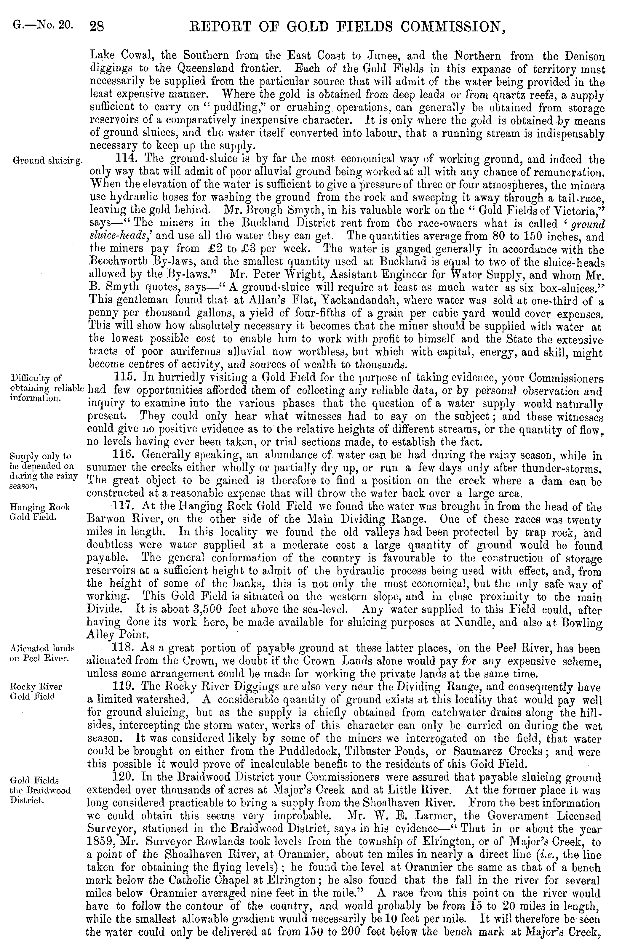 Lake Cowal, the Southern from the East Coast to Junee, and the Northern from the Denison diggings to the Queensland frontier. Each of the Gold Fields in this expanse of territory must necessarily be supplied from the particular source that will admit of the water being provided in the least expensive manner. Where the gold is obtained from deep leads or from quartz reefs, a supply sufficient to carry on " puddling," or crushing operations, can generally be obtained from storage reservoirs of a comparatively inexpensive character. It is only where the gold is obtained by means of ground sluices, and the water itself converted into labour, that a running stream is indispensably necessary to keep up the supply. 114. The ground-sluice is by far the most economical way of working ground, and indeed the only way that will admit of poor alluvial ground being worked at all with any chance of remuneration. When the elevation of the water is sufficient to give a pressure of three or four atmospheres, the miners use hydraulic hoses for washing the ground from the rock and sweeping it away through a tail-race, leaving the gold behind. Mr. Brough Smyth, in his valuable work on the " Gold Fields of Victoria," says—" The miners in the Buckland District rent from the race-owners what is called ' ground sluice-heads' and use all the water they can get. The quantities average from 80 to 150 inches, and the miners pay from £2 to £3 per week. The water is gauged generally in accordance with the Beechworth By-laws, and the smallest quantity used at Buckland is equal to two of the sluice-heads allowed by the By-laws." Mr. Peter Wright, Assistant Engineer for Water Supply, and whom Mr. B. Smyth quotes, says—" A ground-sluice will require at least as much water as six box-sluices." This gentleman found that at Allan's Flat, Yackandandah, where water was sold at one-third of a penny per thousand gallons, a yield of four-fifths of a grain per cubic yard would cover expenses. This will show how absolutely necessary it becomes that the miner should be supplied with water at the lowest possible cost to enable him to work with profit to himself and the State the extensive tracts of poor auriferous alluvial now worthless, but which with capital, energy, and skill, mio-ht become centres of activity, and sources of wealth to thousands. 115. In hurriedly visiting a Gold Field for the purpose of taking evidence, your Commissioners had few opportunities afforded them of collecting any reliable data, or by personal observation and inquiry to examine into the various phases that the question of a water supply would naturally present. They could only hear what witnesses had to say on the subject; and these witnesses could give no positive evidence as to the relative heights of different streams, or the quantity of flow no levels having ever been taken, or trial sections made, to establish the fact. 116. Generally speaking, an abundance of water can be had during the rainy season, while in summer the creeks either wholly or partially dry up, or run a few days only after thunder-storms. The great object to be gained is therefore to find a position on the creek where a dam can be constructed at a reasonable expense that will throw the water back over a large area. 117. At the Hanging Rock Gold Field we found the water was brought in from the head of the Barwon River, on the other side of the Main Dividing Range. One of these races was twenty miles in length. In this locality wc found the old valleys had been protected by trap rock, and doubtless were water supplied at a moderate cost a large quantity of ground would be found payable. The general conformation of the country is favourable to the construction of storage reservoirs at a sufficient height to admit of the hydraulic process being used with effect, and, from the height of some of the banks, this is not only the most economical, but the only safe way of working. This Gold Field is situated on the western slope, and in close proximity to the main Divide. It is about 3,500 feet above the sea-level. Any water supplied to this Field could, after having done its work here, be made available for sluicing purposes at Nundle, and also at Bowling Alley Point. 118. As a great portion of payable ground at these latter places, on the Peel River, has been alienated from the Crown, we doubt if the Crown Lands alone would pay for any expensive scheme, unless some arrangement could be made for working the private lands at the same time. 119. The Rocky River Diggings are also very near the Dividing Range, and consequently have a limited watershed. A considerable quantity of ground exists at this locality that would pay well for ground sluicing, but as the supply is chiefly obtained from catchwater drains along the hillsides, intercepting the storm water, works of this character can only be carried on during the wet season. It was considered likely by some of the miners we interrogated on the field, that water could be brought on either from the Puddledock, Tilbuster Ponds, or Saumarez Creeks ; and were this possible it would prove of incalculable benefit to the residents of this Gold Field. 120. In the Braidwood District your Commissioners were assured that payable sluicing ground extended over thousands of acres at Major's Creek and at Little River. At the former place it was long considered practicable to bring a supply from the Shoalhaven River. From the best information we could obtain this seems very improbable. Mr. W. E. Larmer, the Government Licensed Surveyor, stationed in the Braidwood District, says in his evidence—" That in or about the year 1859, Mr. Surveyor Rowlands took levels from the township of Ellington, or of Major's Creek, to a point of the Shoalhaven River, at Oranmier, about ten miles in nearly a direct line (i.e., the line taken for obtaining the flying levels); he found the level at Oranmier the same as that of a bench mark below the Catholic Chapel at El