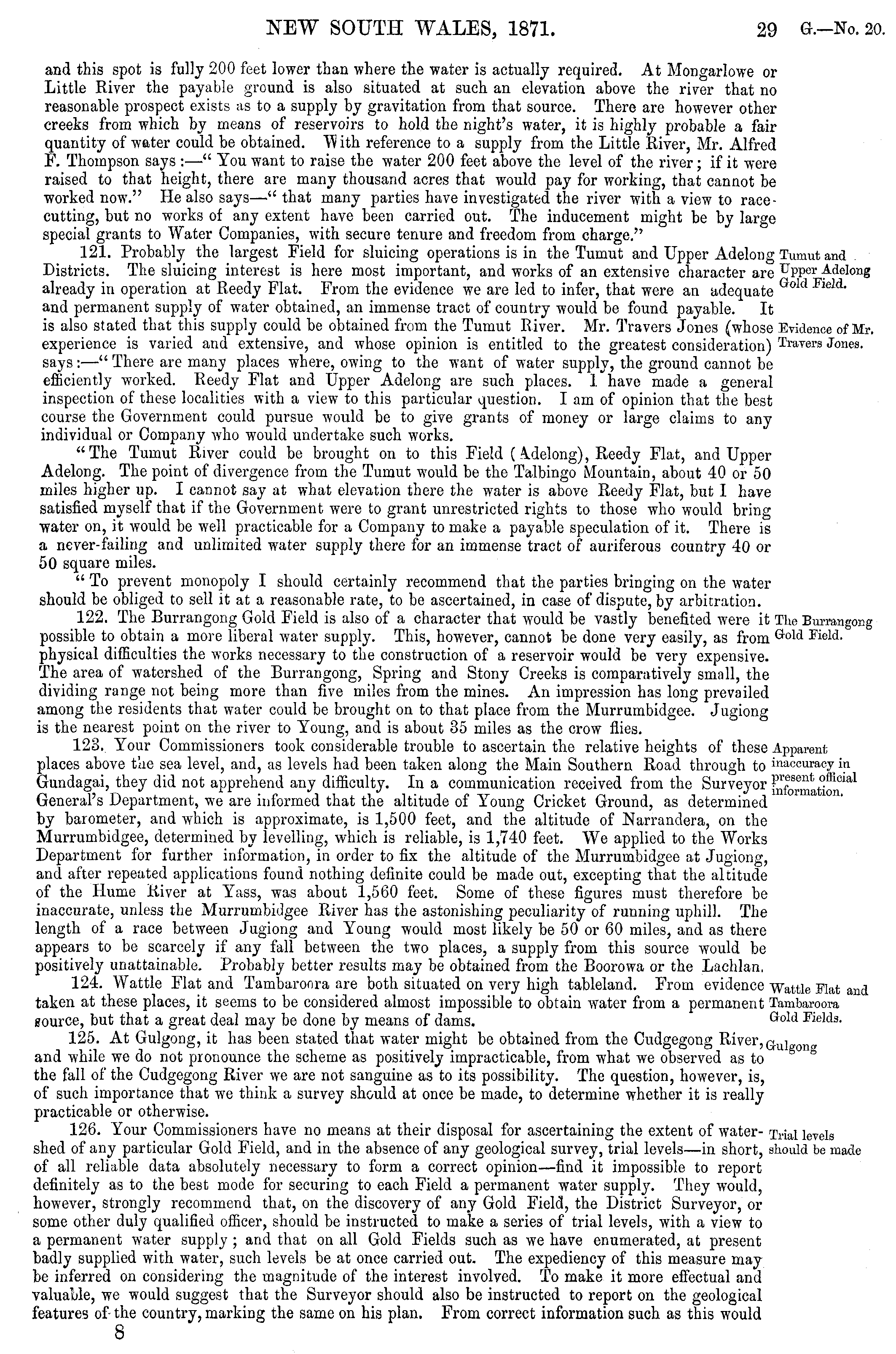 and this spot is fully 200 feet lower than where the water is actually required. At Mongarlowe or Little River the payable ground is also situated at such an elevation above the river that no reasonable prospect exists as to a supply by gravitation from that source. There are however other creeks from which by means of reservoirs to hold the night's water, it is highly probable a fair quantity of water could be obtained. With reference to a supply from the Little River, Mr. Alfred F. Thompson says : —" You want to raise the water 200 feet above the level of the river; if it were raised to that height, there are many thousand acres that would pay for working, that cannot be worked now." He also says—" that many parties have investigated the river with a view to racecutting, but no works of any extent have been carried out. The inducement might be by large special grants to Water Companies, with secure tenure and freedom from charge." 121. Probably the largest Field for sluicing operations is in the Tumut and Upper Adelong Districts. The sluicing interest is here most important, and works of an extensive character are already in operation at Reedy Flat. From the evidence we are led to infer, that were an adequate and permanent supply of water obtained, an immense tract of country would be found payable. It is also stated that this supply could be obtained from the Tumut River. Mr. Travers Jones (whose experience is varied and extensive, and whose opinion is entitled to the greatest consideration) says : —" There are many places where, owing to the want of water supply, the ground cannot be efficiently worked. Reedy Flat and Upper Adelong are such places. 1 have made a general inspection of these localities with a view to this particular question. lam of opinion that the best course the Government could pursue would be to give grants of money or large claims to any individual or Company who would undertake such works. "The Tumut River could be brought on to this Field (Melong), Reedy Flat, and Upper Adelong. The point of divergence from the Tumut would be the Talbingo Mountain, about 40 or 50 miles higher up. I cannot say at what elevation there the water is above Reedy Flat, but I have satisfied myself that if the Government were to grant unrestricted rights to those who would bring water on, it would be well practicable for a Company to make a payable speculation of it. There is a never-failing and unlimited water supply there for an immense tract of auriferous country 40 or 50 square miles. "To prevent monopoly I should certainly recommend that the parties bringing on the water should be obliged to sell it at a reasonable rate, to be ascertained, in case of dispute, by arbitration. 122. The Burrangong Gold Field is also of a character that would be vastly benefited were it. possible to obtain a more liberal water supply. This, however, cannot be done very easily, as from ( physical difficulties the works necessary to the construction of a reservoir would be very expensive. The area of watershed of the Burrangong, Spring and Stony Creeks is comparatively small, the dividing range not being more than five miles from the mines. An impression has long prevailed among the residents that water could be brought on to that place from the Murrumbidgee. Jugiong is the nearest point on the river to Young, and is about 35 miles as the crow flies. 123. Your Commissioners took considerable trouble to ascertain the relative heights of these i places above the sea level, and, as levels had been taken along the Main Southern Road through to i Gundagai, they did not apprehend any difficulty. In a communication received from the Surveyor I General's Department, we are informed that the altitude of Young Cricket Ground, as determined by barometer, and which is approximate, is 1,500 feet, and the altitude of Narrandera, on the Murrumbidgee, determined by levelling, which is reliable, is 1,740 feet. We applied to the Works Department for further information, in order to fix the altitude of the Murrumbidgee at Jugiong, and after repeated applications found nothing definite could be made out, excepting that the altitude of the Hume River at Yass, was about 1,560 feet. Some of these figures must therefore be inaccurate, unless the Murrumbidgee River has the astonishing peculiarity of running uphill. The length of a race between Jugiong and Young would most likely be 50 or 60 miles, and as there appears to be scarcely if any fall between the two places, a supply from this source would be positively unattainable. Probably better results may be obtained from the Boorowa or the Lachlan, 124. Wattle Flat and Tambaronra are both situated on very high tableland. From evidence t, taken at these places, it seems to be considered almost impossible to obtain water from a permanent T Kource, but that a great deal may be done by means of dams. G 125. At Gulgong, it has been stated that water might be obtained from the Cudgegong River, q and while we do not pronounce the scheme as positively impracticable, from what we observed as to the fall of the Cudgegong River we are not sanguine as to its possibility. The question, however, is, of such importance that we think a survey should at once be made, to determine whether it is really practicable or otherwise. 126. Your Commissioners have no means at their disposal for ascertaining the extent of water- j shed of any particular Gold Field, and in the absence of any geological survey, trial levels—in short, si of all reliable data absolutely necessary to form a correct opinion—find it impossible to report definitely as to the best mode for securing to each Field a permanent water supply. They would, however, strongly recommend that, on the discovery of any Gold Field, the District Surveyor, or some other duly qualified officer, should be instructed to make a series of trial levels, with a view to a permanent water supply ; and that on all Gold Fields such as we have enum