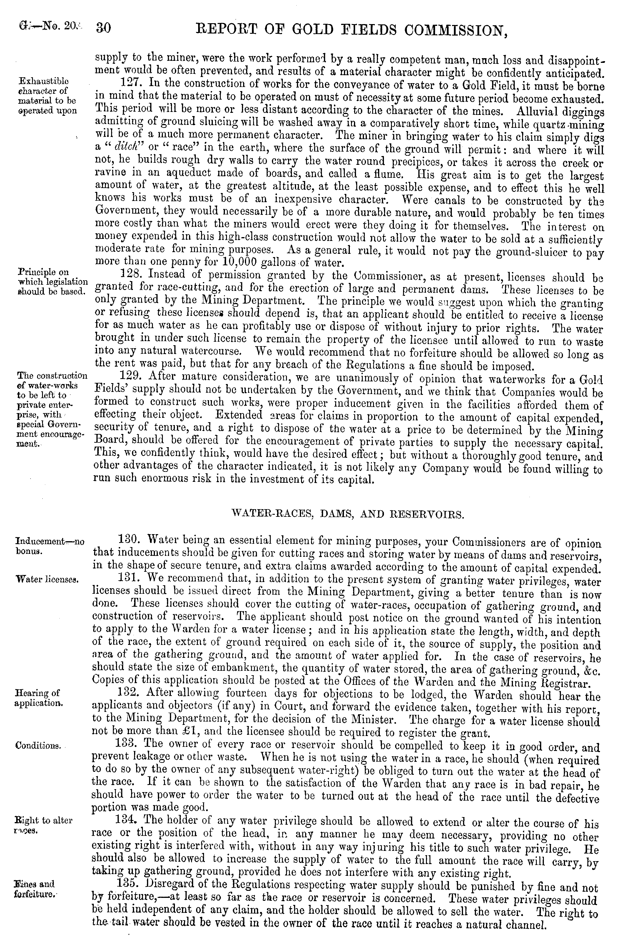supply to the miner, were the work performed by a really competent man, much loss and disappointment would be often prevented, and results of a material character might be confidently anticipated. 127. In the construction of works for the conveyance of water to a Gold Field, it must be borne in mind that the material to be operated on must of necessity at some future period become exhausted. This period will be more or less distant according to the character of the mines. Alluvial diggings admitting of ground sluicing will be washed away in a comparatively short time, while quartz -mining will be of a much more permanent character. The miner in bringing water to his claim simply digs a " ditch" or " race" in the earth, where the surface of the ground will permit: and where it will not, he _ builds rough dry walls to carry the water round precipices, or takes it across the creek or ravine in an aqueduct made of boards, and called a flume. His great aim is to get the largest amount of water, at the greatest altitude, at the least possible expense, and to effect this he well knows his works must be of an inexpensive character. Were canals to be constructed by the Government, they would necessarily be of a more durable nature, and would probably be ten times more costly than what the miners would erect were they doing it for themselves. The interest on money expended in this high-class construction would not allow the water to be sold at a sufficiently moderate rate for mining purposes. As a general rule, it would not pay the ground-sluicer to pay more than one penny for 10,000 gallons of water. 128. Instead of permission granted by the Commissioner, as at present, licenses should be granted for race-cutting, and for the erection of large and permanent dams. These licenses to be only granted by the Mining Department. The principle we would suggest upon which the grantinoor refusing these licenses should depend is, that an applicant should be entitled to receive a license for as much water as he can profitably use or dispose of without injury to prior rights. The water brought in under such license to remain the property of the licensee until allowed to run to waste into any natural watercourse. We would recommend that no forfeiture should be allowed so long as the rent was paid, but that for any breach of the Regulations a fine should be imposed. 129. After mature consideration, we are unanimously of opinion that waterworks for a Gold Fields' supply should not be undertaken by the Government, and we think that Companies would be formed to construct such works, were proper inducement given in the facilities afforded them of effecting their object. Extended areas for claims in proportion to the amount of capital expended, security of tenure, and a right to dispose of the water at a price to be determined by the Mining Board, should be offered for the encouragement of private parties to supply the necessary capital. This, we confidently think, would have the desired effect; but without a thoroughly good tenure, and other advantages of the character indicated, it is not likely any Company would be found willing to run such enormous risk in the investment of its capital. WATER-RACES, DAMS, AND RESERVOIRS. 130. Water being an essential element for mining purposes, your Commissioners are of opinion that inducements should be given for cutting races and storing water by means of dams and reservoirs in the shape of secure tenure, and extra claims awarded according to the amount of capital expended.' 131. We recommend that, in addition to the present system of granting water privileges water licenses should be issued direct from the Mining Department, giving a better tenure than 'is now done. These licenses should cover the cutting of water-races, occupation of gathering ground, and construction of reservoirs. The applicant should post notice on the ground wanted of his intention to apply to the Warden for a water license; and in his application state the length, width, and depth of the race, the extent of ground required on each side of it, the source of supply, the position and area of the gathering ground, and the amount of water applied for. In the case of reservoirs, he should state the size of embankment, the quantity of water stored, the area of gathering ground, &c. Copies of this application should be posted at the Offices of the Warden and the Mining Registrar. 132. After allowing fourteen days for objections to be lodged, the Warden should hear the applicants and objectors (if any) in Court, and forward the evidence taken, together with his report to the Mining Department, for the decision of the Minister. The charge for a water license should not be more than £1, and the licensee should be required to register the grant. 133. The owner of every race or reservoir should be compelled to keep it in good order and prevent leakage or other waste. When he is not using the water in a race, he should (when required to do so by the owner of any subsequent water-right) be obliged to turn out the water at the head of the race. If it can be shown to the satisfaction of the Warden that any race is in bad repair he should have power to order the water to be turned out at the head of the race until the defective portion was made good. 134. The holder of any water privilege should be allowed to extend or alter the course of his race _or the position of the head, ir, any manner he may deem necessary, providing no other existing right is interfered with, without in any way injuring his title to such water privilege. He should also be ahlowed to increase the supply of water to the full amount the race will carry, by taking up gathering ground, provided he does not interfere with any existing right. 135. Disregard of the Regulations respecting- water supply should be punished by fine and not by forfeiture, —at least so far as the race or reservoir is concerned. These water privileges should be held indepen