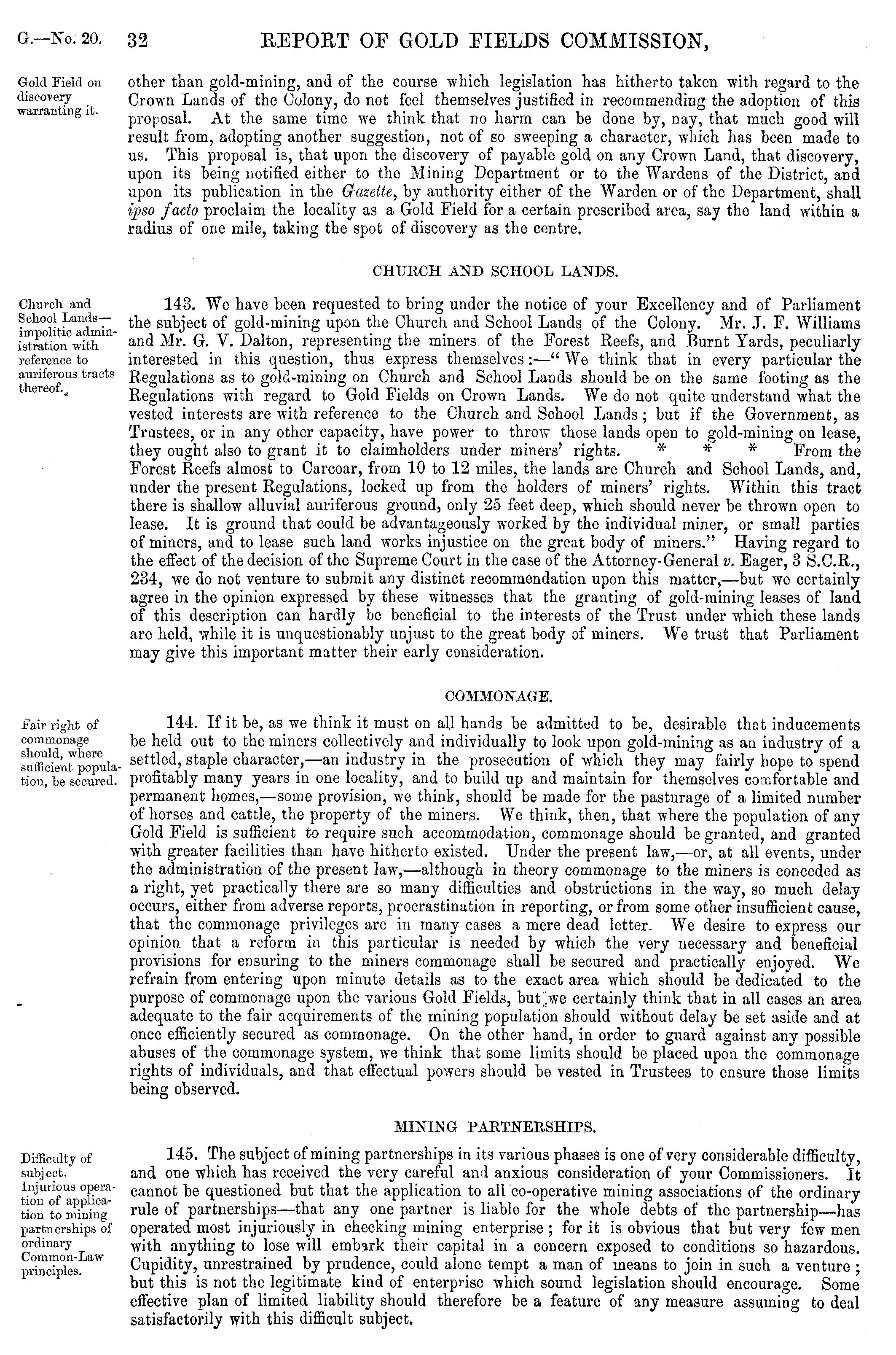 other than gold-mining, and of the course which legislation has hitherto taken with regard to the Crown Lands of the Colony, do not feel themselves justified in recommending the adoption of this proposal. At the same time we think that no harm can be done by, nay, that much good will result from, adopting another suggestion, not of so sweeping a character, which has been made to us. This proposal is, that upon the discovery of payable gold on any Crown Land, that discovery, upon its being notified either to the Mining Department or to the Wardens of the District, and upon its publication in the Gazette, by authority either of the Warden or of the Department, shall ipso facto proclaim the locality as a Gold Field for a certain prescribed area, say the land within a radius of one mile, taking the spot of discovery as the centre. CHURCH AND SCHOOL LANDS. 143. We have been requested to bring under the notice of your Excellency and of Parliament the subject of gold-mining upon the Church and School Lands of the Colony. Mr. J. F. Williams and Mr. G. V. Dalton, representing the miners of the Forest Reefs, and Burnt Yards, peculiarly interested in this question, thus express themselves:—" We think that in every particular the Regulations as to gold-mining on Church and School Lands should be on the same footing as the Regulations with regard to Gold Fields on Crown Lands. We do not quite understand what the vested interests are with reference to the Church and School Lands ; but if the Government, as Trustees, or in any other capacity, have power to throw those lands open to gold-mining on lease, they ought also to grant it to claimholders under miners' rights. * * * From the Forest Reefs almost to Carcoar, from 10 to 12 miles, the lands are Church and School Lands, and, under the present Regulations, locked up from the holders of miners' rights. Within this tract there is shallow alluvial auriferous ground, only 25 feet deep, which should never be thrown open to lease. It is ground that could be advantageously worked by the individual miner, or small parties of miners, and to lease such land works injustice on the great body of miners." Having regard to the effect of the decision of the Supreme Court in the case of the Attorney-General v. Eager, 3 S.C.R., 234, we do not venture to submit any distinct recommendation upon this matter, —but we certainly agree in the opinion expressed by these witnesses that the granting of gold-mining leases of land of this description can hardly be beneficial to the interests of the Trust under which these lands are held, while it is unquestionably unjust to the great body of miners. We trust that Parliament may give this important matter their early consideration. COMMONAGE. 144. If it be, as we think it must on all hands be admitted to be, desirable that inducements be held out to the miners collectively and individually to look upon gold-mining as an industry of a settled, staple character, —an industry in the prosecution of which they may fairly hope to spend profitably many years in one locality, and to build up and maintain for themselves comfortable and permanent homes, —some provision, we think, should be made for the pasturage of a limited number of horses and cattle, the property of the miners. We think, then, that where the population of any Gold Field is sufficient to require such accommodation, commonage should be granted, and granted with greater facilities than have hitherto existed. Under the present law, —or, at all events, under the administration of the present law, —although in theory commonage to the miners is conceded as a right, yet practically there are so many difficulties and obstructions in the way, so much delay occurs, either from adverse reports, procrastination in reporting, or from some other insufficient cause, that the commonage privileges are in many cases a mere dead letter. We desire to express our opinion that a reform in this particular is needed by which the very necessary and beneficial provisions for ensuring to the miners commonage shall be secured and practically enjoyed. We refrain from entering upon minute details as to the exact area which should be dedicated to the purpose of commonage upon the various Gold Fields, but",we certainly think that in all cases an area adequate to the fair acquirements of the mining population should without delay be set aside and at once efficiently secured as commonage. On the other hand, in order to guard against any possible abuses of the commonage system, we think that some limits should be placed upon the commonage rights of individuals, and that effectual powers should be vested in Trustees to ensure those limits being observed. MINUS G PARTNERSHIPS. 145. The subject of mining partnerships in its various phases is one of very considerable difficulty, and one which has received the very careful and anxious consideration of your Commissioners. It cannot be questioned but that the application to all co-operative mining associations of the ordinary rule of partnerships—that any one partner is liable for the whole debts of the partnership—has operated most injuriously in checking mining enterprise ; for it is obvious that but very few men with anything to lose will embark their capital in a concern exposed to conditions so hazardous. Cupidity, unrestrained by prudence, could alone tempt a man of means to join in such a venture ; but this is not the legitimate kind of enterprise which sound legislation should encourage. Some effective plan of limited liability should therefore be a feature of any measure assuming to deal satisfactorily with this difficult subject.