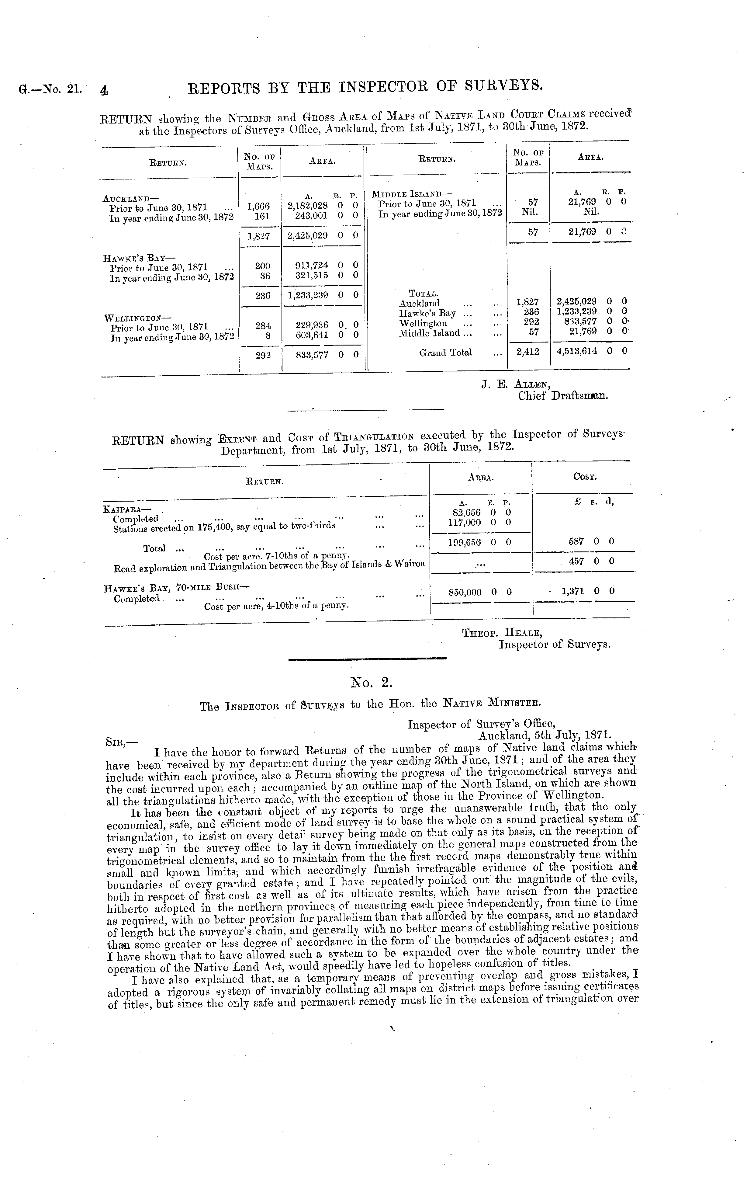 RETURN showing the NUMBER and GROSS AREA of MAPS of NATIVE LAND COURT CLAIMS received at the Inspectors of Surveys Office, Auckland, from 1st July, 1871, to 30th June, 1872.