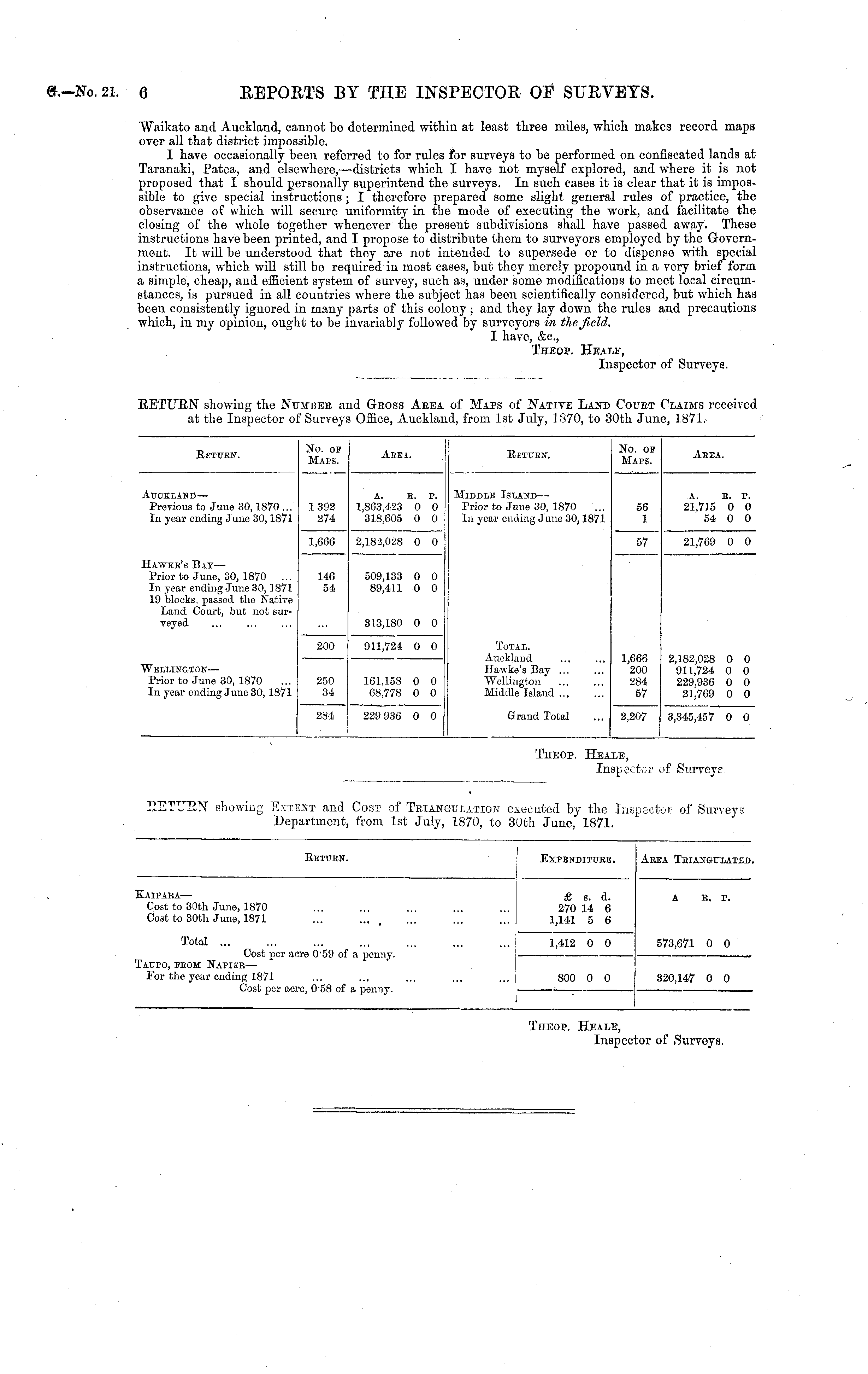 Return. No. op Maps. Abea. Ketuen. No. ov Maps. Aeea. Auckland— Previous to June 30,1870 ... In year ending June 30,1871 1392 274 A. E. P. 1,863,423 0 0 318,605 0 0 Middle Island— Prior to June 30, 1870 In year ending Juno 30,1871 56 1 a. B. P. 21,715 0 0 54 0 0 Hawke's Bat— Prior to June, 30, 1870 ... In year ending June 30,1871 19 blocks, passed the Native Land Court, but not surveyed 1,666 2,182,028 0 0 57 21,769 0 0 146 54 509,133 0 0 89,411 0 0 Total. Auckland Hawke's Bay ... "Wellington Middle Island 313,180 0 0 Wellington— Prior to June 30, 1870 In year ending Juno 30, 1871 200 911,724 0 0 1,666 200 284 57 2,182,028 0 0 911,724 0 0 229,936 0 0 21,769 0 0 250 84 161,158 0 0 68,778 0 0 284 229 936 0 0 Grand Total 2,207 3,345,457 0 0 Tiieop. He. I] .LE, ispector of Surveyr.