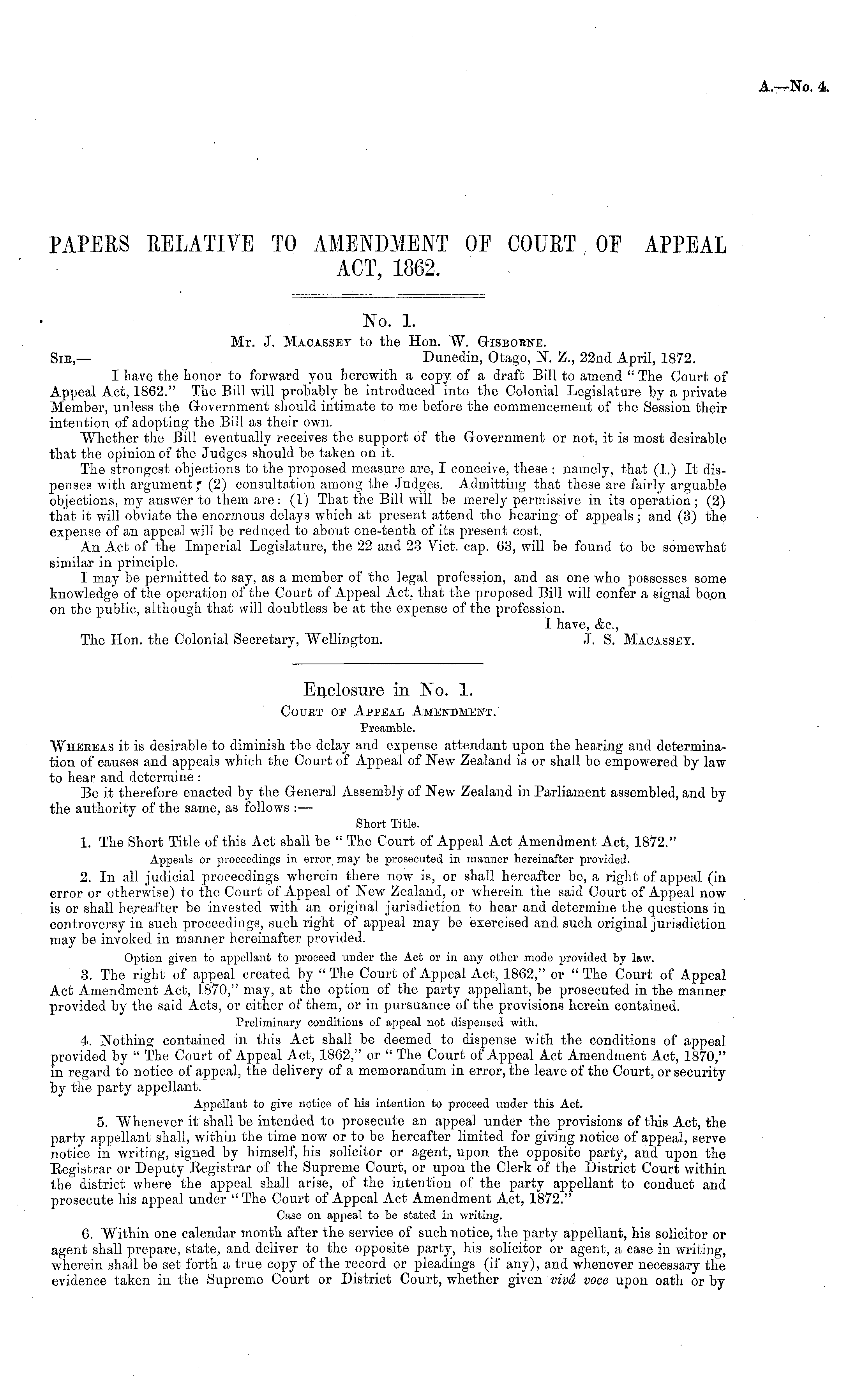 No. 1. Mr. J. Macasset to the Hon. W. Gisboene. Sic,— Dunedin, Otago, N. Z., 22nd April, 1872. I have the honor to forward you herewith a copy of a draft Bill to amend " The Court of Appeal Act, 1862." The Bill will probably be introduced into the Colonial Legislature by a private Member, unless the Government should intimate to me before the commencement of the Session their intention of adopting the Bill as their own. Whether the Bill eventually receives the support of the Government or not, it is most desirable that the opinion of the Judges should be taken on it. The strongest objections to the proposed measure are, I conceive, these : namely, that (1.) It dispenses with argument • (2) consultation among the Judges. Admitting that these are fairly arguable objections, my answer to them are: (1) That the Bill will be merely permissive in its operation; (2) that it will obviate the enormous delays which at present attend the hearing of appeals; and (3) the expense of an appeal will be reduced to about one-tenth of its present cost. An Act of the Imperial Legislature, the 22 and 23 Viet. cap. 63, will bo found to be somewhat similar in principle. I may be permitted to say, as a member of the legal profession, and as one who possesses some knowledge of the operation of the Court of Appeal Act, that the proposed Bill will confer a signal bo.on on the public, although that will doubtless be at the expense of the profession. I have, &c, The Hon. the Colonial Secretary, Wellington. J. S. Macasset.
