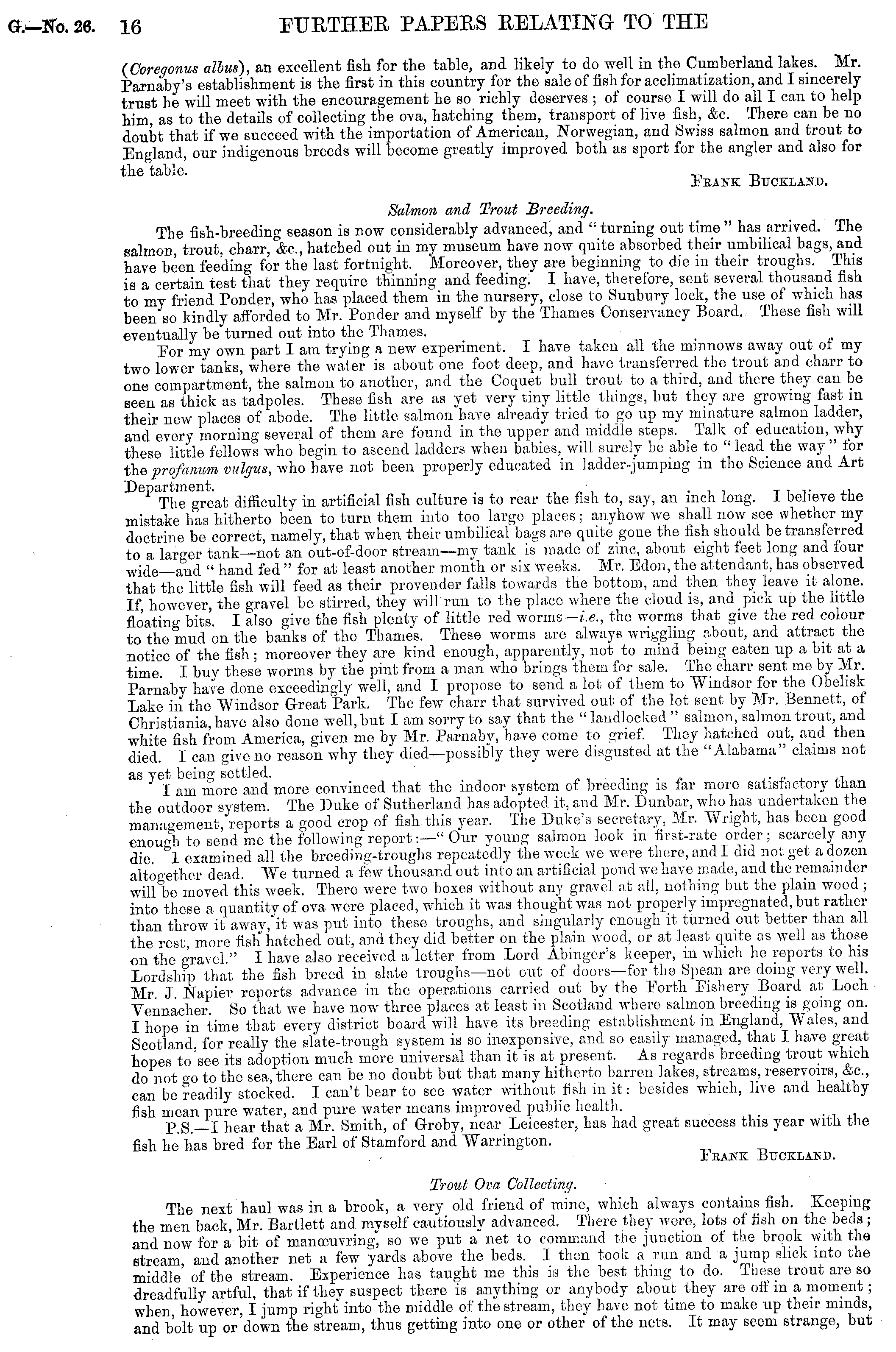 (Coregonus alius), an excellent fish for the table, and likely to do well in the Cumberland lakes. Mr. Parnaby's establishment is the first in this country for the sale of fish for acclimatization, and I sincerely trust he will meet with the encouragement he so richly deserves ; of course I will do all I can to help him, as to the details of collecting the ova, hatching them, transport of live fish, &c. There can be no doubt that if we succeed with the importation of American, Norwegian, and Swiss salmon and trout to England, our indigenous breeds will become greatly improved both as sport for the angler and also for the table. _ Frank Buckland. Salmon and Trout Breeding. The fish-breeding season is now considerably advanced, and " turning out time " has arrived. The salmon trout, charr, &c, hatched out in my museum have now quite absorbed their umbilical bags, and have been feeding for the last fortnight. Moreover, they are beginning to die in their troughs. This is a certain test that they require thinning and feeding. I have, therefore, sent several thousand fish to my friend Ponder, who has placed them in the nursery, close to Sunbury lock, the use of which has been so kindly afforded to Mr. Ponder and myself by the Thames Conservancy Board. These fish will eventually be turned out into the Thames. For my own part lam trying a new experiment. I have taken all the minnows away out of my two lower tanks, where the water is about one foot deep, and have transferred the trout and charr to one compartment, the salmon to another, and the Coquet bull trout to a third, and there they can be seen as thick as tadpoles. These fish are as yet very tiny little things, but they are growing fast in their new places of abode. The little salmon have already tried to go up my minature salmon ladder, and every morning several of them are found in the upper and middle steps. Talk of education^ why these little fellows who begin to ascend ladders when babies, will surely be able to " lead the way " for the profanum vulgus, who have not been properly educated in ladder-jumping in the Science and Art The great difficulty in artificial fish culture is to rear the fish to, say, an inch long. I believe the mistake has hitherto been to turn them into too large places; anyhow we shall now see whether my doctrine bo correct, namely, that when their umbilical bags are quite gone the fish should be transferred to a larger tank—not an out-of-door stream—my tank is made of zinc, about eight feet long and four w ide—and " hand fed " for at least another month or six weeks. Mr. Edon, the attendant, has observed that the little fish will feed as their provender falls towards the bottom, and then they leave it alone. If however the gravel be stirred, they will run to the place where the cloud is, and pick up the little floating bits' I also give the fish plenty of little red worms—i.e., the worms that give the red colour to the mud on the banks of the Thames. These worms are always wriggling about, and attract the notice of the fish ; moreover they are kind enough, apparently, not to mind being eaten up a bit at a time I buy these worms by the pint from a man who brings them for sale. The charr sent me by Mr. Parnaby have done exceedingly well, and I propose to send a lot of them to Windsor for the Obelisk Lake in the Windsor Great Park. The few charr that survived out of the lot sent by Mr. Bennett, oi Christiania have also done well, but I am sorry to say that the "landlocked" salmon, salmon trout, and white fish from America, given me by Mr. Parnaby, have come to grief. They hatched out, and then died. I can give no reason why they died—possibly they were disgusted at the "Alabama" claims not as yet being settled. . I am more and more convinced that the indoor system of breeding is far more satisfactory than tho outdoor system. The Duke of Sutherland has adopted it, and Mr. Dunbar, who has undertaken the management reports a good crop of fish this year. The Duke's secretary, Mr. Wright, has been good enough to send me the following report:—" Our young salmon look in first-rate order; scarcely any die "l examined all the breeding-troughs repeatedly the week we were there, and I did not get a dozen altogether dead We turned a few thousand out into an artificial pond we have made, and the remainder willlc moved this week. There were two boxes without any gravel at all, nothing but the plain wood ; into these a quantity of ova were placed, which it was thought was not properly impregnated, but rather than throw it away, it was put into these troughs, and singularly enough it turned out better than all the rest more fish hatched out, and they did better on the plain wood, or at feast quite as well as those on the gravel " I have also received a letter from Lord Abinger's keeper, in which he reports to his Lordship that the fish breed in slate troughs—not out of doors—for the Spean are doing very well. Mr J Napier reports advance in the operations carried out by the Forth Fishery Board at Loch Vennacher So that we have now three places at least in Scotland where salmon breeding is going on. I hope in time that every district board will have its breeding establishment in England, Wales, and Scotland for really the slate-trough system is so inexpensive, and so easily managed, that I have groat hopes to'see its adoption much more universal than it is at present. As regards breeding trout which do not go to the sea, there can be no doubt but that many hitherto barren lakes, streams, reservoirs, &c, can be readily stocked. I can't bear to see water without fish in it: besides which, live and healthy fish mean pure water, and pure water means improved public health. P.S.—I hear that a Mr. Smith, of Groby, near Leicester, has had great success this year with the fish ho has bred for the Earl of Stamford and Warrington. . . Frank Buckland. Trout Ova Collecting. The next haul was in a brook, a very old friend of m