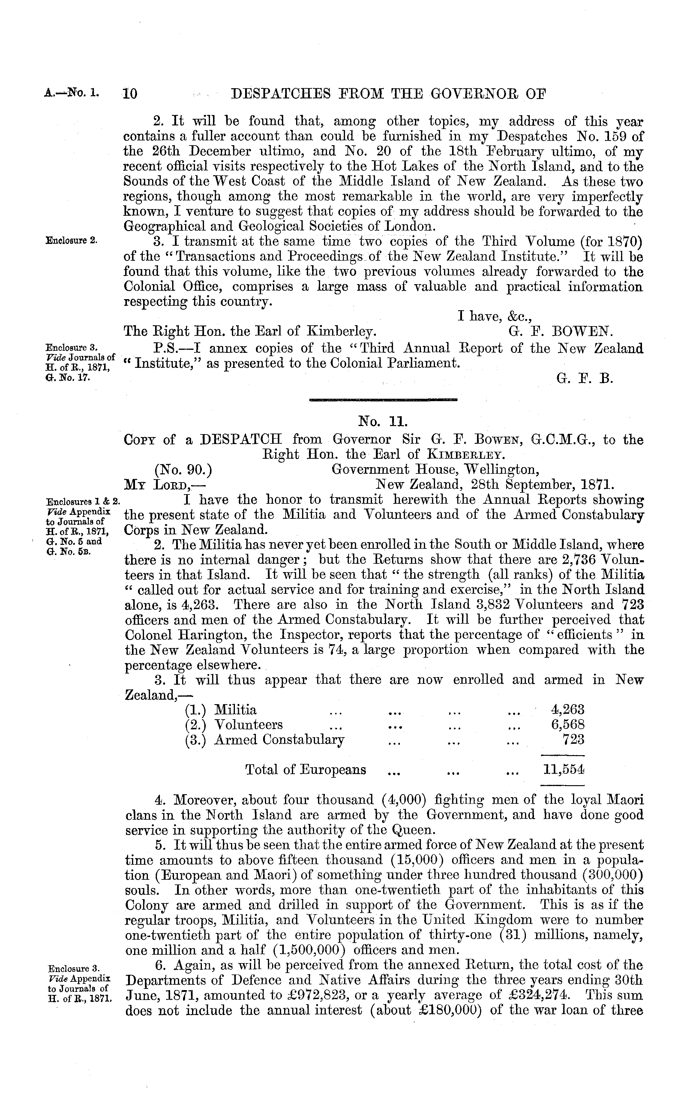 No. 11. Copt of a DESPATCH from Governor Sir G. P. Bowen, G.C.M.G., to the Right Hon. the Earl of Kimberlet. (No. 90.) Government House, Wellington, My Lord, — New Zealand, 28th September, 1871. I have the honor to transmit herewith the Annual Reports showing the present state of the Militia and Volunteers and of the Armed Constabulary Corps in New Zealand. 2. The Militia has never yet been enrolled in the South or Middle Island, where there is no internal danger; but the Returns show that there are 2,736 Volunteers in that Island. It will be seen that " the strength (all ranks) of the Militia " called out for actual service and for training and exercise," in the North Island alone, is 4,263. There are also in the North Island 3,832 Volunteers and 723 officers and men of the Armed Constabulary. It will be further perceived that Colonel Harington, the Inspector, reports that the percentage of "efficients " in the New Zealand Volunteers is 74, a large proportion when compared with the percentage elsewhere. 3. It will thus appear that there are now enrolled and armed in New Zealand, — (1.) Militia ... ... ... ... 4,263 (2.) Volunteers ... ... ... ... 6,568 (3.) Armed Constabulary ... ... ... 723 Total of Europeans ... ... ... 11,554 4. Moreover, about four thousand (4,000) fighting men of the loyal Maori clans in the North Island are armed by the Government, and have done good service in supporting the authority of the Queen. 5. It will thus be seen that the entire armed force of New Zealand at the present time amounts to above fifteen thousand (15,000) officers and men in a population (European and Maori) of something under three hundred thousand (300,000) souls. In other words, more than one-twentieth part of the inhabitants of this Colony are armed and drilled in support of the Government. This is as if the regular troops, Militia, and Volunteers in the United Kingdom were to number one-twentieth part of the entire population of thirty-one (31) millions, namely, one million and a half (1,500,000) officers and men. 6. Again, as will be perceived from the annexed Return, the total cost of the Departments of Defence and Native Affairs during the three years ending 30th June, 1871, amounted to £972,823, or a yearly average of £324,274. This sum does not include the annual interest (about £180,000) of the war loan of three