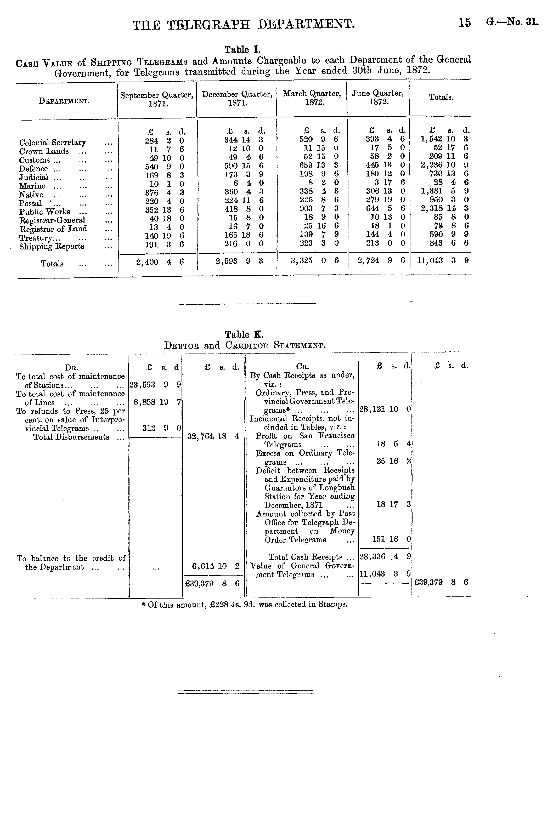 !ash Value of Shtpp: Government, i am Teiegeams : ibr Telegrams tri Table I. ,nd Amounts Chai .nsinitted during •geable to each Department the Tear ended 30th June, if the General L872. Depaetment. September Quarter, 1871. December Quarter, 1871. March Quarter, 1872. June Quarter, 1872. Totals. Colonial Secretary Crown Lands Customs Defence ... Judicial ... Marine ... Native Postal ' Public Works ... Registrar- General Registrar of Land Treasury Shipping Reports £ s. d. 284 2 0 11 7 6 49 10 0 540 9 0 169 8 3 10 1 0 376 4 3 220 4 0 352 13 6 40 18 0 13 4 0 140 19 6 191 3 6 £ s. d. 344 14 3 12 10 0 49 4 6 590 15 6 173 3 9 6 4 0 360 4 3 224 11 G 418 8 0 15 8 0 16 7 0 165 18 6 216 0 0 £ s. a. 520 9 6 11 15 0 52 15 0 659 13 3 198 9 6 8 2 0 338 4 3 225 8 6 903 7 3 18 9 0 25 16 6 139 7 9 223 3 0 S s. d. 393 4 6 17 5 0 58 2 0 445 13 0 189 12 0 3 17 6 306 13 0 279 19 0 644 5 6 10 13 0 18 1 0 144 4 0 213 0 0 £ s. d. 1,542 10 3 52 17 6 209 11 6 2,236 10 9 730 13 6 28 4 6 1,381 5 9 950 3 O 2,318 14 3 85 8 0 73 8 6 590 9 9 84,3 6 6 Totals 2,400 4 6 2,593 9 3 3,325 0 6 2,724 9 6 11,043 3 9 Tab! :toh and Cue i K. De: iitoe Statement. Dk. To total cost of maintenance of Stations... To total cost of maintenance of Lines To refunds to Press, 25 per cent, on value of Interprovincial Telegrams ... Total Disbursements ... £ s. d. £ s. d. Cs. By Cash Receipts aa under, viz. : Ordinary, Press, and Provincial Government Telegrams* ... Incidental Receipts, not included in Tables, viz.: Profit on San Francisco Telegrams Excess on Ordinary Telegrams ... Deficit between Eeceipts and Expenditure paid by Guarantors of Longbush Station for Year ending December, 1871 Amount collected by PoBt Office for Telegraph Department on Money Order Telegrams £ s. d. £ s. d. 23,593 9 9 8,858 19 7 28,121 10 0 312 9 0 32,764 18 4 18 5 4 25 16 2 18 17 3 To balance to the credit of the Department ... 151 16 0 Total Cash Eeceipts ... Value of General Government Telegrams ... 28,336 ,4 9 6,614 10 2 11,043 3 9 £39,379 8 6 £39,379 8 6 * Of this amount, £228 4s. 9d. was collected in Stamps.