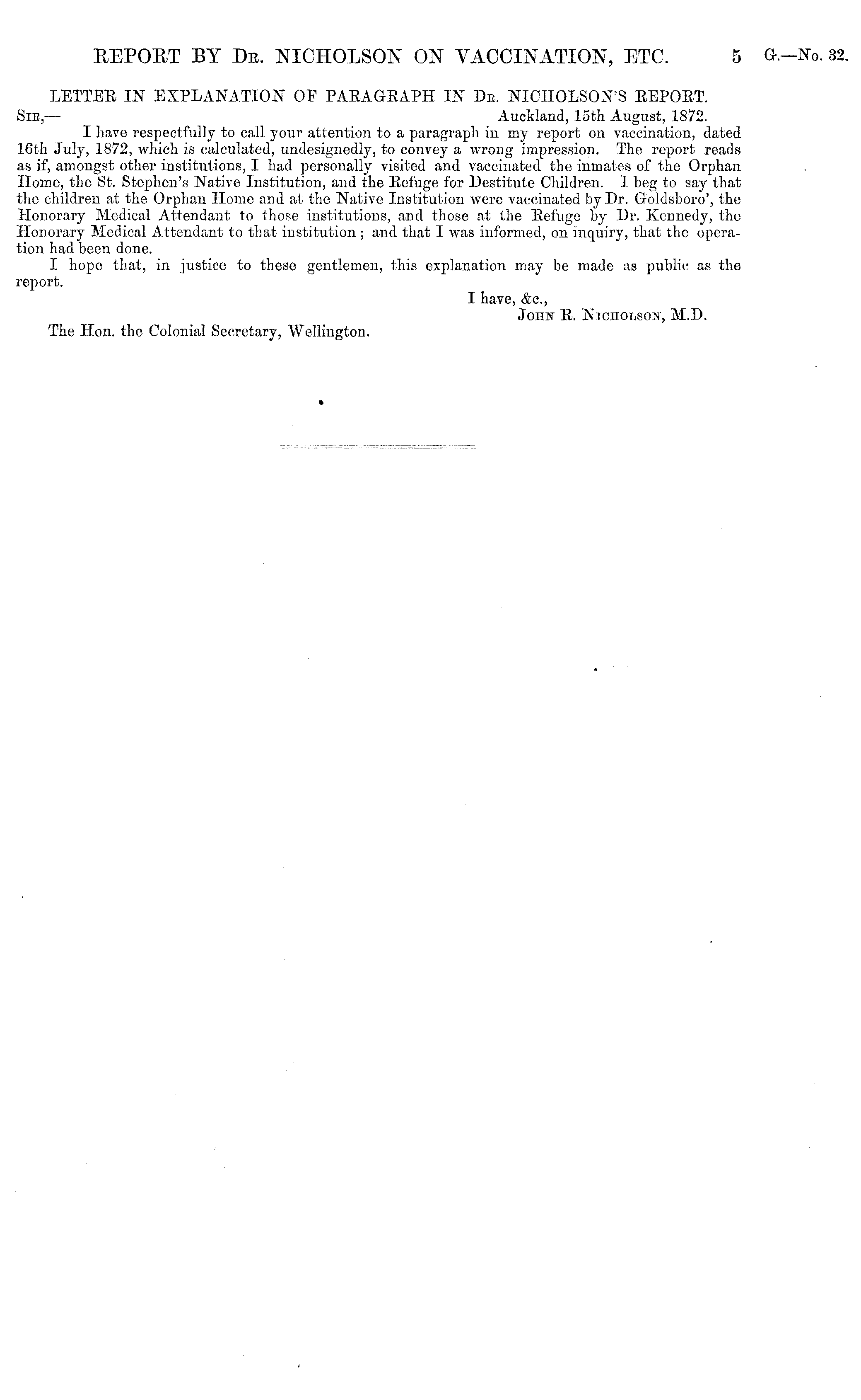 LETTER IN EXPLANATION OF PARAGRAPH IN Dr. NICHOLSON'S REPORT. Sir, — Auckland, loth August, 1872. I have respectfully to call your attention to a paragraph in my report on vaccination, dated 16th July, 1872, which is calculated, undesignedly, to convey a wrong impression. The report reads as if, amongst other institutions, I had personally visited and vaccinated the inmates of the Orphan Home, the St. Stephen's Native Institution, and the Refuge for Destitute Children. I beg to say that the children at the Orphan Home and at the Native Institution were vaccinated by Dr. Goldsboro', the Honorary Medical Attendant to those institutions, and those at the Refuge by Dr. Kennedy, the Honorary Medical Attendant to that institution j and that I was informed, on inquiry, that the operation had been done. I hope that, in justice to these gentlemen, this explanation may be made as public as the report. I have, &c, John R. Nicholson, M.D. The Hon. the Colonial Secretary, Wellington.