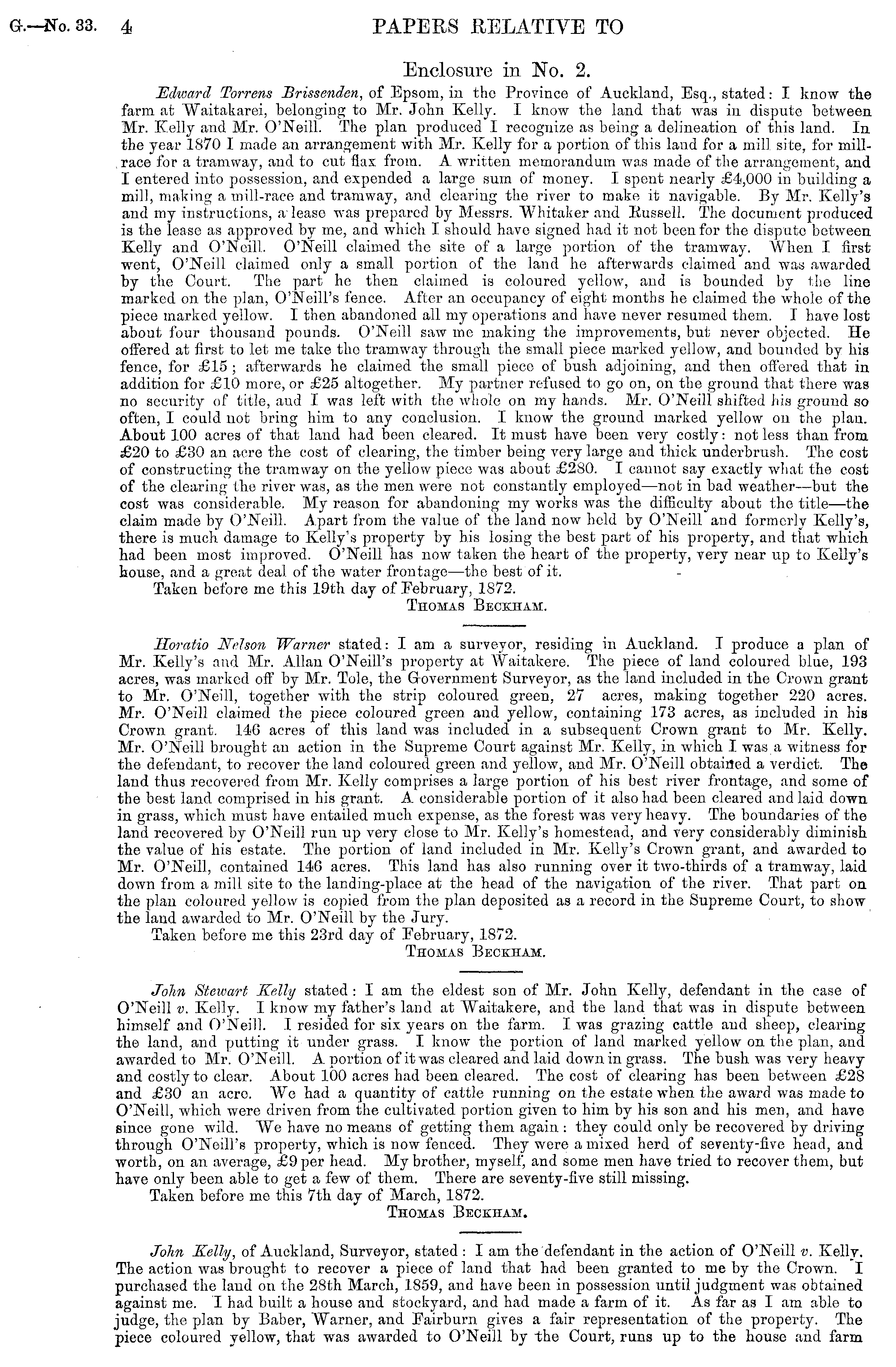 Enclosure in No. 2. Edward Torrens Brissenden, of Epsom, in the Province of Auckland, Esq., stated: I know the farm at Waitakarei, belonging to Mr. John Kelly. I know the land that was in dispute between Mr. Kelly and Mr. O'Neill. The plan produced I recognize as being a delineation of this land. In the year 1870 I made an arrangement with Mr. Kelly for a portion of this land for a mill site, for millrace for a tramway, and to cut flax from. A written memorandum was made of the arrangement, and I entered into possession, and expended a large sum of money. I spent nearly £4,000 in building a mill, making a mill-race and tramway, and clearing the river to make it navigable. By Mr. Kelly's and my instructions, a 1 lease was prepared by Messrs. Whitaker and Kussell. The document produced is the lease as approved by me, and which I should have signed had it not been for the dispute between Kelly and O'Neill. O'Neill claimed the site of a large portion of the tramway. When I first went, O'Neill claimed only a small portion of the land he afterwards claimed and was awarded by the Court. The part he then claimed is coloured yellow, and is bounded by the line marked on the plan, O'Neill's fence. After an occupancy of eight months he claimed the whole of the piece marked yellow. I then abandoned all my operations and have never resumed them. I have lost about four thousand pounds. O'Neill saw me making the improvements, but never objected. He offered at first to let me take the tramway through the small piece marked yellow, and bounded by his fence, for £15 ; afterwards he claimed the small piece of bush adjoining, and then offered that in addition for £10 more, or £25 altogether. My partner refused to go on, on the ground that there was no security of title, and I was left with the whole on my hands. Mr. O'Neill shifted his ground so often, I could not bring him to any conclusion. I know the ground marked yellow on the plan. About 100 acres of that land had been cleared. It must have been very costly: not less than from £20 to £30 an acre the cost of clearing, the timber being very large and thick underbrush. The cost of constructing the tramway on the yellow piece was about £280. I cannot say exactly what the cost of the clearing tho river was, as the men were not constantly employed —not in bad weather —but the cost was considerable. My reason for abandoning my works was the difficulty about the title—the claim made by O'Neill. Apart from the value of the land now held by O'Neill and formerly Kelly's, there is much damage to Kelly's property by his losing the best part of his property, and that which had been most improved. O'Neill has now taken the heart of the property, very near up to Kelly's house, and a great deal of the water frontage—the best of it. Taken before me this 19th day of February, 1872. Thomas Beckham. Horatio Nelson Warner stated: lam a surveyor, residing in Auckland. I produce a plan of Mr. Kelly's and Mr. Allan O'Neill's property at Waitakere. The piece of land coloured blue, 193 acres, was marked off by Mr. Tole, the Government Surveyor, as the land included in the Crown grant to Mr. O'Neill, together with the strip coloured green, 27 acres, making together 220 acres. Mr. O'Neill claimed the piece coloured green and yellow, containing 173 acres, as included in his Crown grant. 146 acres of this land was included in a subsequent Crown grant to Mr. Kelly. Mr. O'Neill brought an action in the Supreme Court against Mr. Kelly, in which I was a witness for the defendant, to recover the land coloured green and yellow, and Mr. O'Neill obtained a verdict. The land thus recovered from Mr. Kelly comprises a large portion of his best river frontage, and some of the best land comprised in his grant. A considerable portion of it also had been cleared and laid down in grass, which must have entailed much expense, as the forest was very heavy. The boundaries of the land recovered by O'Neill run up very close to Mr. Kelly's homestead, and very considerably diminish the value of his estate. The portion of land included in Mr. Kelly's Crown grant, and awarded to Mr. O'Neill, contained 146 acres. This land has also running over it two-thirds of a tramway, laid down from a mill site to the landing-place at the head of the navigation of the river. That part on the plan coloured yellow is copied from the plan deposited as a record in the Supreme Court, to show the land awarded to Mr. O'Neill by the Jury. Taken before me this 23rd day of February, 1872. Thomas Beckham. John Stewart Kelly stated : I am the eldest son of Mr. John Kelly, defendant in the case of O'Neill v. Kelly. I know my father's land at Waitakere, and the land that was in dispute between himself and O'Neill. I resided for six years on the farm. I was grazing cattle and sheep, clearing the land, and putting it under grass. I know the portion of land marked yellow on the plan, and awarded to Mr. O'Neill. A portion of it was cleared and laid down in grass. The bush was very heavy and costly to clear. About 100 acres had been cleared. The cost of clearing has been between £28 and £30 an acre. We had a quantity of cattle running on the estate when the award was made to O'Neill, which were driven from the cultivated portion given to him by his son and his men, and have since gone wild. We have no means of getting them again : they could only be recovered by driving through O'Neill's property, which is now fenced. They were a mixed herd of seventy-five head, and worth, on an average, £9 per head. My brother, myself, and some men have tried to recover them, but have only been able to get a few of them. There are seventy-five still missing. Taken before me this 7th day of March, 1872. Thomas Beckham. John Kelly, of Auckland, Surveyor, stated : I am the defendant in the action of O'Neill v. Kelly. The action was brought to recover a piece of land that had been granted to me by the Crown. I purchased the land on the 28th M