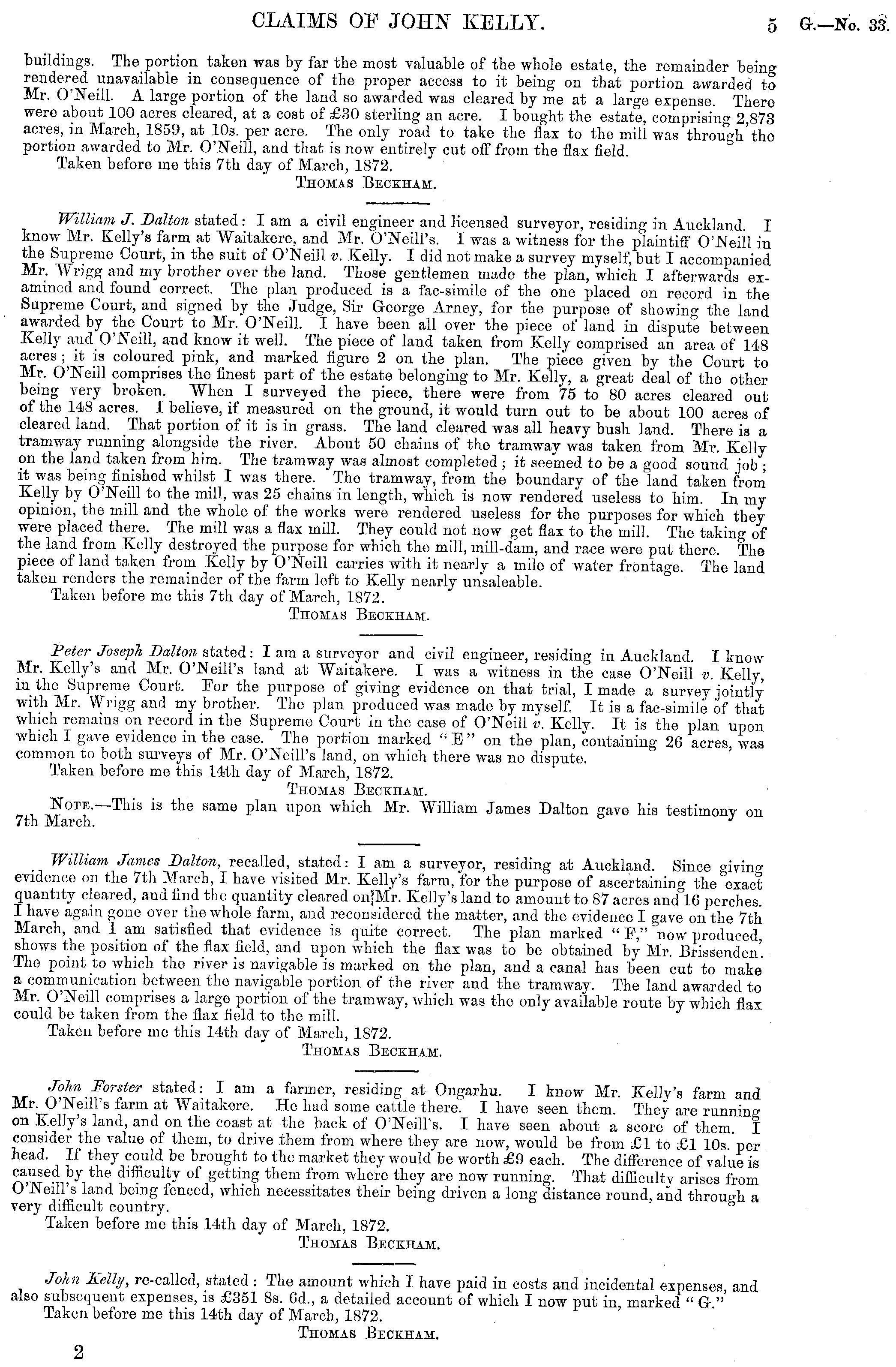 buildings. The portion taken was by far the most valuable of the whole estate, the remainder bein<* rendered unavailable in consequence of the proper access to it being on that portion awarded to Mr. O'Neill. A large portion of the land so awarded was cleared by me at a large expense. There were about 100 acres cleared, at a cost of £30 sterling an acre. I bought the estate, comprising 2 873 acres, in March, 1859, at 10s. per acre. The only road to take the flax to the mill was through'the portion awarded to Mr. O'Neill, and that is now entirely cut off from the flax field. Taken before me this 7th day of March, 1872. Thomas Beckiiam. William J. Dalton stated :lam a civil engineer and licensed surveyor, residing in Auckland I know Mr. Kelly's farm at Waitakere, and Mr. O'Neill's. I was a witness for the plaintiff O'Neill in the Supreme Court, in the suit of O'Neill v. Kelly. I did not make a survey myself, but I accompanied Mr. Wrigg and my brother over the land. Those gentlemen made the plan, which I afterwards examined and found correct. The plan produced is a fac-simile of the one placed on record in the Supreme Court, and signed by the Judge, Sir George Arney, for the purpose of showing the land awarded by the Court to Mr. O'Neill. I have been all over the piece of land in dispute between Kelly and O'Neill, and know it well. The piece of land taken from Kelly comprised an area of 148 acres ;> it is coloured pink, and marked figure 2on the plan. The piece given by the Court to Mr. O'Neill comprises the finest part of the estate belonging to Mr. Kelly, a great deal of the other being very broken. When I surveyed the piece, there were from 75 to 80 acres cleared out of the 148 acres. 1 believe, if measured on the ground, it would turn out to be about 100 acres of cleared land. That portion of it is in grass. The land cleared was all heavy bush land. There is a tramway running alongside the river. About 50 chains of the tramway was taken from Mr. Kelly on the land taken from him. The tramway was almost completed ; it seemed to be a good sound job • it was being finished whilst I was there. The tramway, from the boundary of the land taken from Kelly by O'Neill to the mill, was 25 chains in length, which is now rendered useless to him. In my opinion, the mill and the whole of the works were rendered useless for the purposes for which they were placed there. The mill was a flax mill. They could not now get flax to the mill. The taking of the land from Kelly destroyed the purpose for which the mill, mill-dam, and race were put there. The piece of land taken from Kelly by O'Neill carries with it nearly a mile of water frontage. The land taken renders the remainder of the farm left to Kelly nearly unsaleable. Taken before mo this 7th day of March, 1872. Thomas Beckham. Peter Joseph Ballon stated: lam a surveyor and civil engineer, residing in Auckland. I knowMr. Kelly's and Mr. O'Neill's land at Waitakere. I was a witness in the case O'Neill v. Kelly, in the Supreme Court. For the purpose of giving evidence on that trial, I made a survey jointly with Mr. Wrigg and my brother. The plan produced was made by myself. It is a fac-simile of that which remains on record in the Supreme Court in the case of O'Neill v. Kelly. It is the plan upon which I gave evidence in the case. The portion marked "E" on the plan, containino- 26 acres was common to both surveys of Mr. O'Neill's land, on which there was no dispute. Taken before me this 14th day of March, 1872. Thomas Beckham. Note.—This is the same plan upon which Mr. William James Dalton gave his testimony on 7th March. J William James Dalton, recalled, stated: lam a surveyor, residing at Auckland Since °iving evidence on the 7th March, I have visited Mr. Kelly's farm, for the purpose of ascertaining the exact quantity cleared, and find the quantity cleared onjMr. Kelly's land to amount to 87 acres and 16 perches I have again gone over the whole farm, and reconsidered the matter, and the evidence I gave on the 7th March, and iam satisfied that evidence is quite correct. The plan marked " P," now produced, shows the position of the flax field, and upon which the flax was to be obtained by Mr. Brissenden'. The point to which the river is navigable is marked on the plan, and a canal has been cut to make a communication between the navigable portion of the river and the tramway. The land awarded to Mr. O'Neill comprises a large portion of the tramway, which was the only available route by which flax could be taken from the flax field to the mill. Taken before me this 14th day of March, 1872. Thomas Beckham. John Forster stated: lam a farmer, residing at Ongarhu. I know Mr. Kelly's farm and Mr. O Neill's farm at Waitakere. Ho had some cattle there. I have seen them. They are running on Kelly's land, and on the coast at the back of O'Neill's. I have seen about a score of them I consider the value of them, to drive them from where they are now, would be from £1 to £1 10s per head. If they could be brought to the market they would be worth £9 each. The difference of value is caused by the difficulty of getting them from where they are now running. That difficulty arises from O Neill s land being fenced, which necessitates their being driven a long distance round, and through a very difficult country. Taken before me this 14th day of March, 1872. Thomas Beckiiam. John Kelly, re-called, stated : The amount which I have paid in costs and incidental expenses and also subsequent expenses, is £351 Bs. 6d., a detailed account of which I now put in marked " G " Taken before me this 14th day of March, 1872. Thomas Beckham. 2