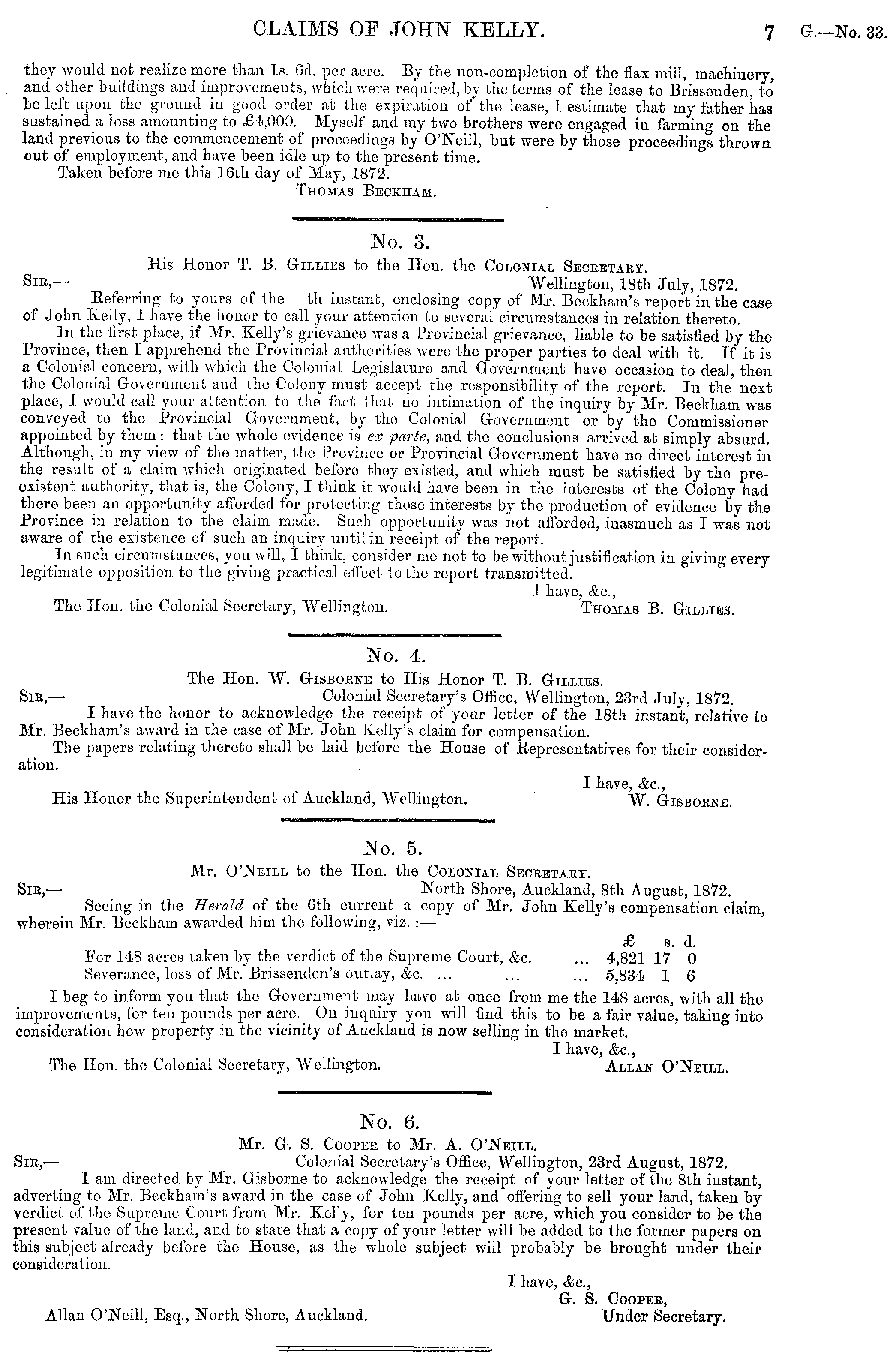 they would not realize more than Is. Gd. per acre. By the non-completion of the flax mill, machinery, and other buildings and improvements, which were required, by the terms of the lease to Brissenden, to' be left upon the ground in good order at the expiration of the lease, I estimate that my father has sustained a loss amounting to £4,000. Myself and my two brothers were engaged in farming on the land previous to the commencement of proceedings by O'Neill, but were by those proceedings thrown out of employment, and have been idle up to the present time. Taken before me this 16th day of May, 1872. Thomas Beckham. No. 3. His Honor T. B. G-illies to the Hon. the Colonial Secretary. Sib,— _ Wellington, 18th July, 1872. Referring to yours of the th instant, enclosing copy of Mr. Beckham's report in the case of John Kelly, I have the honor to call your attention to several circumstances in relation thereto. In the first place, if Mr. Kelly's grievance was a Provincial grievance, liable to be satisfied by the Province, then I apprehend the Provincial authorities were the proper parties to deal with it. If it is a Colonial concern, with which the Colonial Legislature and Government have occasion to deal, then the Colonial Government and the Colony must accept the responsibility of the report. In the next place, I would call your attention to the fact that no intimation of the inquiry by Mr. Beckham was conveyed to the Provincial Government, by the Colonial Government or by the Commissioner appointed by them : that the whole evidence is ex parte, and the conclusions arrived at simply absurd. Although, in my view of the matter, the Province or Provincial Government have no direct interest in the result of a claim which originated before they existed, and which must be satisfied by the preexistent authority, that is, tho Colony, I think it would have been in the interests of the Colony had there been an opportunity afforded for protecting those interests by the production of evidence by the Province in relation to the claim made. Such opportunity was not afforded, inasmuch as I was not aware of the existence of such an inquiry until in receipt of the report. In such circumstances, you will, I think, consider me not to be without justification in giving every legitimate opposition to the giving practical effect to the report transmitted. I have, &c, The Hon. the Colonial Secretary, Wellington. Thomas B. Gillies. No. 4. The Hon. W. Gisbobne to His Honor T. B. Gillies. Sib,— Colonial Secretary's Office, Wellington, 23rd July, 1872. I have the honor to acknowledge the receipt of your letter of the 18th instant, relative to Mr. Beckham's award in the case of Mr. John Kelly's claim for compensation. The papers relating thereto shall be laid before the House of Eepresentatives for their consideration. I have, &c, His Honor the Superintendent of Auckland, Wellington. W. Gisboene. No. 5. Mr. O'Neill to the Hon. the Colonial Seceetaby. Sib,— North Shore, Auckland, Bth August, 1872. Seeing in the Herald of the 6th current a copy of Mr. John Kelly's compensation claim, wherein Mr. Beckham awarded him the following, viz. : — £ s. d. For 148 acres taken by the verdict of the Supreme Court, &c. ... 4,821 17 0 Severance, loss of Mr. Brissenden's outlay, &c. ... ... ... 5,834 1 6 I beg to inform you that the Government may have at once from me the 148 acres, with all the improvements, for ten pounds per acre. On inquiry you will find this to be a fair value, taking into consideration how property in the vicinity of Auckland is now selling in the market. I have, &c, The Hon. the Colonial Secretary, Wellington. Allan O'Neill. No. 6. Mr. G. S. Coopee to Mr. A. O'Neill. Sic, — Colonial Secretary's Office, Wellington, 23rd August, 1872. I am directed by Mr. Gisborne to acknowledge the receipt of your letter of the Bth instant, adverting to Mr. Beckham's award in the case of John Kelly, and offering to sell your land, taken by verdict of the Supreme Court from Mr. Kelly, for ten pounds per acre, which you consider to be the present value of the land, and to state that a copy of your letter will be added to the former papers on this subject already before the House, as the whole subject will probably be brought under their consideration. I have, &c, G. 8. Coopee, Allan O'Neill, Esq., North Shore, Auckland. Under Secretary.