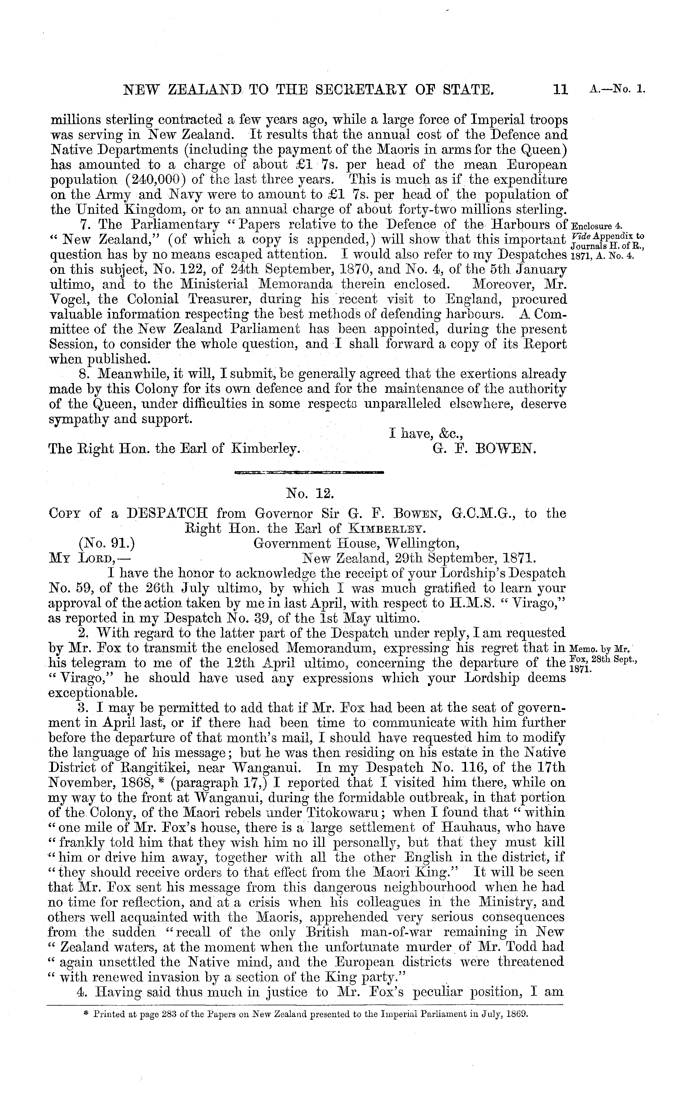 No. 12. Copy of a DESPATCH from. Governor Sir G. F. Bowen, G.C.M.G., to the Sight Hon. the Earl of Kimbebxey. (No. 91.) Government House, Wellington, My Lord,— New Zealand, 29th September, 1871. I have the honor to acknowledge the receipt of your Lordship's Despatch No. 59, of the 26th July ultimo, by which I was much gratified to learn your approval of the action taken by me in last April, with respect to H.M.S. " Virago," as reported in my Despatch No. 39, of the Ist May ultimo. 2. With regard to the latter part of the Despatch under reply, lam requested by Mr. Fox to transmit the enclosed Memorandum, expressing his regret that in his telegram to me of the 12th April ultimo, concerning the departure of the " Virago," he should have used any expressions which your Lordship deems exceptionable. 3. I may be permitted to add that if Mr. Fox had been at the seat of government in April last, or if there had been time to communicate with him further before the departure of that month's mail, I should have requested him to modify the language of his message; but he was then residing on his estate in the Native District of Rangitikei, near Wanganui. In my Despatch No. 116, of the 17th November, 1868, * (paragraph 17,) I reported that I visited him there, while on my way to the front at Wanganui, during the formidable outbreak, in that portion of the Colony, of the Maori rebels under Titokowaru; when I found that " within " one mile of Mr. Fox's house, there is a large settlement of Hauhaus, who have " frankly told him that they wish him no ill personally, but that they must kill " him or drive him away, together with all the other English in the district, if "they should receive orders to that effect from the Maori King." It will be seen that Mr. Fox sent his message from this dangerous neighbourhood when he had no time for reflection, and at a crisis when his colleagues in the Ministry, and others well acquainted with the Maoris, apprehended very serious consequences from the sudden "recall of the only British man-of-war remaining in New " Zealand waters, at the moment when the unfortunate murder of Mr. Todd had " again unsettled the Native mind, and the European districts were threatened " with renewed invasion by a section of the King party." 4. Having said thus much in justice to Mr. Fox's peculiar position, I am * Printed at page 283 of the Papers on New Zealand presented to the Imperial Parliament in July, 1869.
