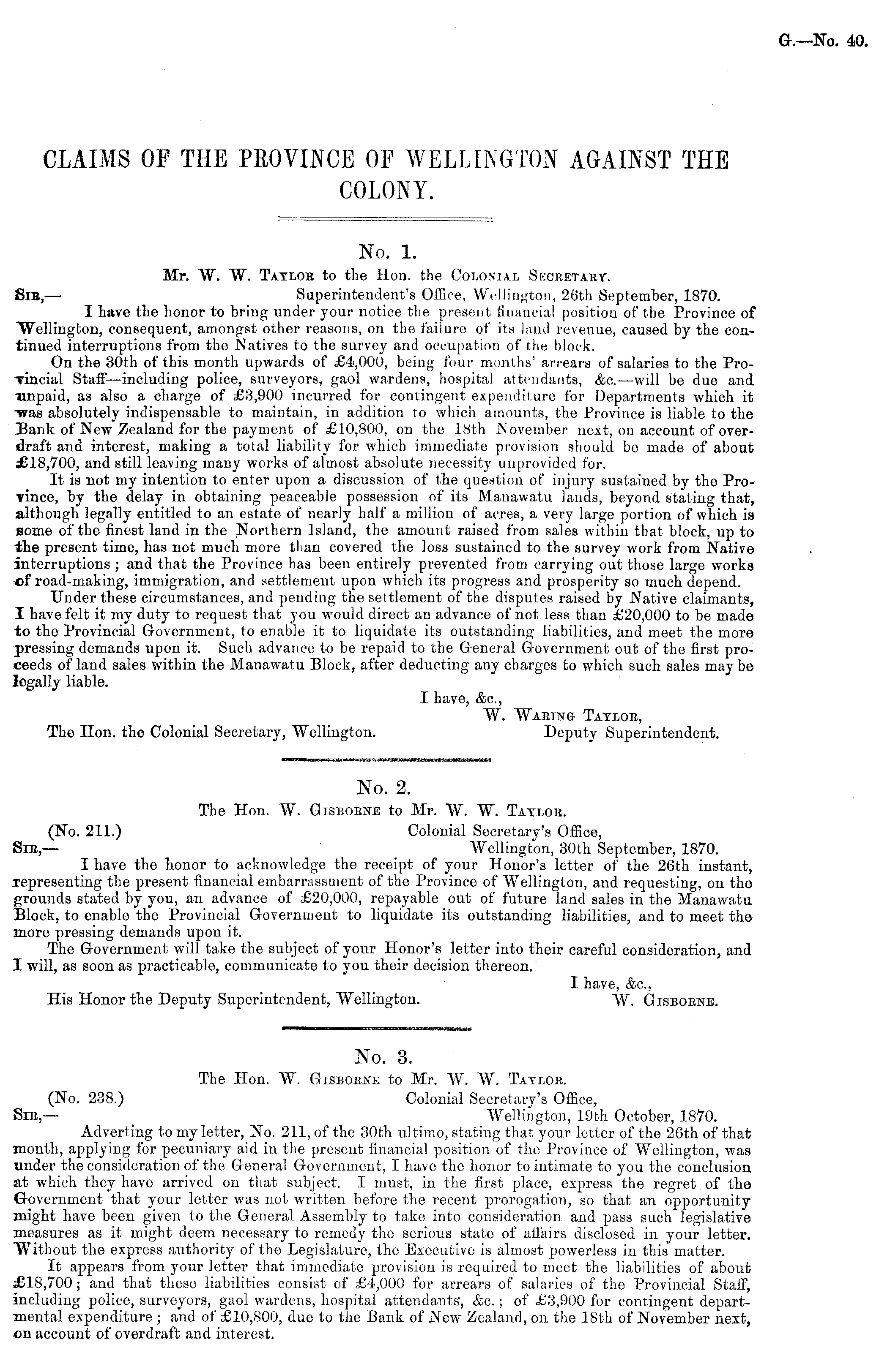 No. 1. Mr. W. W. Tayloe to the Hon. the Colonial Secbetaby. Sib, — Superintendent's Office, Wellington, 26th September, 1870. I have the honor to bring under your notice the present financial position of the Province of Wellington, consequent, amongst other reasons, on the failure of its land revenue, caused by the continued interruptions from the Natives to the survey and occupation of the block. On the 30th of this month upwards of £4,000, being four months' arrears of salaries to the ProTincial Staff —including police, surveyors, gaol wardens, hospital attendants, &c.—will be due and ■unpaid, as also a charge of £3,900 incurred for contingent expenditure for Departments which it "was absolutely indispensable to maintain, in addition to which amounts, the Province is liable to the Bank of New Zealand for the payment of £10,800, on the 18th JNovember next, on account of overdraft and interest, making a total liability for which immediate provision should be made of about £18,700, and still leaving many works of almost absolute necessity unprovided for. It is not my intention to enter upon a discussion of the question of injury sustained by the Proyince, by the delay in obtaining peaceable possession of its Manawatu lands, beyond stating that, although legally entitled to an estate of nearly half a million of acres, a very large portion of which is some of the finest land in the Northern Island, the amount raised from sales within that block, up to the present time, has not much more than covered the loss sustained to the survey work from Native interruptions ; and that the Province has been entirely prevented from carrying out those large works of road-making, immigration, and settlement upon which its progress and prosperity so much depend. Under these circumstances, and pending the settlement of the disputes raised by Native claimants, I have felt it my duty to request that you would direct an advance of not less than £20,000 to be made to the Provincial Government, to enable it to liquidate its outstanding liabilities, and meet the more pressing demands upon it. Such advance to be repaid to the General Government out of the first proceeds of land sales within the Manawatu Block, after deducting any charges to which such sales maybe legally liable. I have, &c, W. Waeing Tayloe, The Hon. the Colonial Secretary, Wellington. Deputy Superintendent.