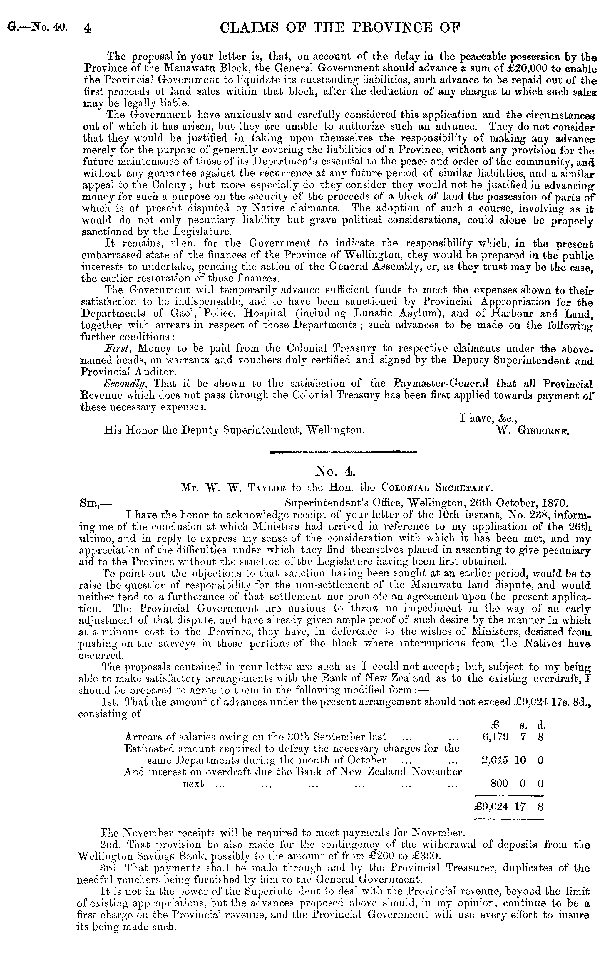 The proposal in your letter is, that, on account of the delay in the peaceable possession by the Province of the Manawatu Block, the General Government should advance a sum of £20,000 to enable the Provincial Government to liquidate its outstanding liabilities, such advance to be repaid out of the first proceeds of land sales within that block, after the deduction of any charges to which such sales may be legally liable. The Government have anxiously and carefully considered this application and the circumstances out of which it has arisen, but they are unable to authorize such an advance. They do not consider that they would be justified in taking upon themselves the responsibility of making any advance merely for the purpose of generally covering the liabilities of a Province, without any provision for the future maintenance of those of its Departments essential to the peace and order of the community, and without any guarantee against the recurrence at any future period of similar liabilities, and a similar appeal to the Colony; but more especially do they consider they would not be justified in advancing money for such a purpose on the security of the proceeds of a block of land the possession of parts of which is at present disputed by Native claimants. The adoption of such a course, involving as ife would do not only pecuniary liability but grave political considerations, could alone be properly sanctioned by the Legislature. It remains, then, for the Government to indicate the responsibility which, in the present embarrassed state of the finances of the Province of Wellington, they would be prepared in the public interests to undertake, pending the action of the General Assembly, or, as they trust may be the case, the earlier restoration of those finances. The Government will temporarily advance sufficient funds to meet the expenses shown to their satisfaction to be indispensable, and to have been sanctioned by Provincial Appropriation for the Departments of Gaol, Police, Hospital (including Lunatic Asylum), and of Harbour and Land, together with arrears in respect of those Departments ; such advances to be made on the following further conditions :— First, Money to be paid from the Colonial Treasury to respective claimants under the abovenamed heads, on warrants and vouchers duly certified and signed by the Deputy Superintendent and Provincial Auditor. Secondly, That it be shown to the satisfaction of the Paymaster-General that all Provincial Eevenue which does not pass through the Colonial Treasury has been first applied towards payment of these necessary expenses. I have, &c, His Honor the Deputy Superintendent, Wellington. W. Gisboene.
