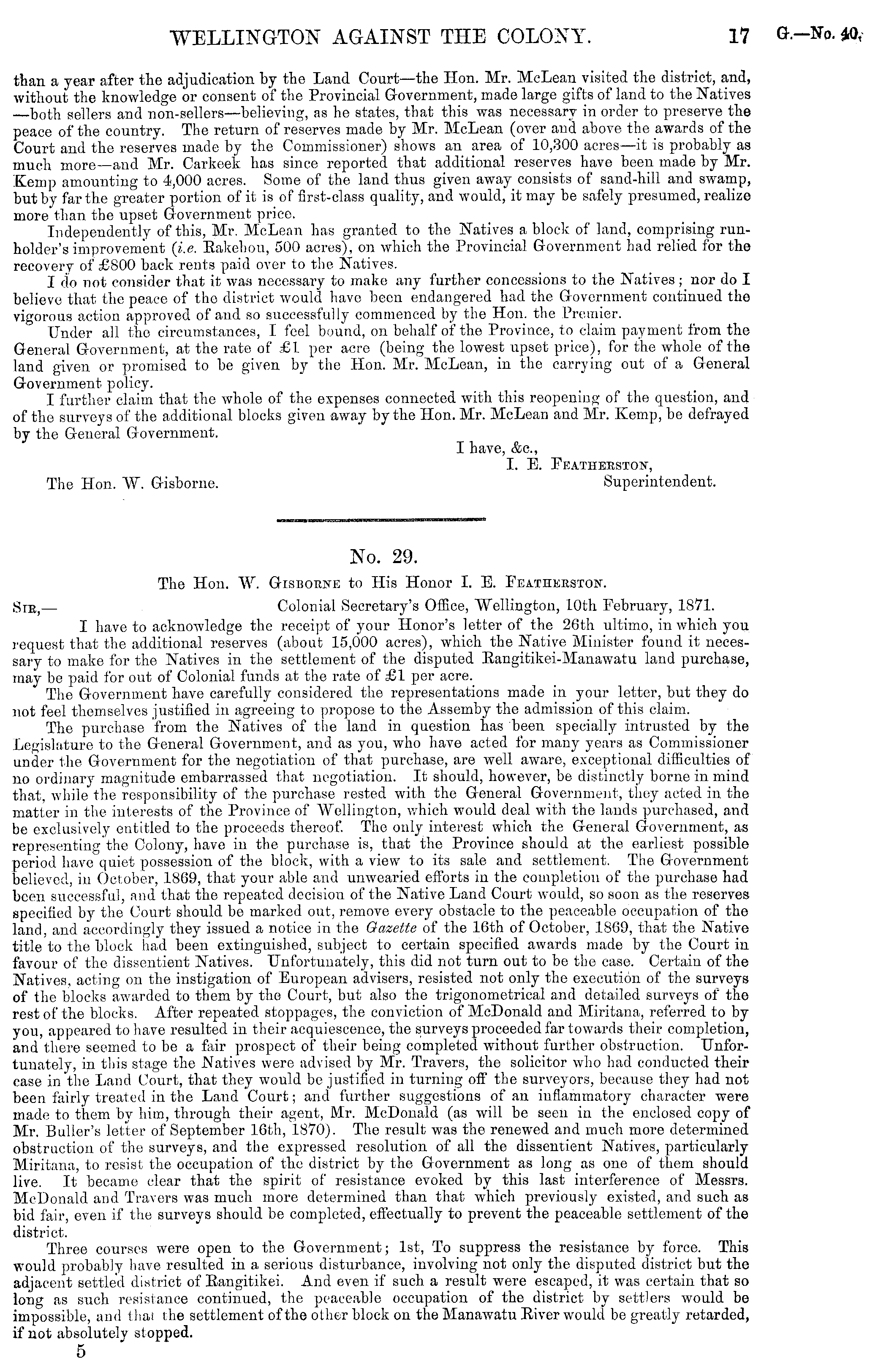 No. 29. The Hon. W. Gisboene to His Honor I. E. Eeatheeston. See, — Colonial Secretary's Office, Wellington, 10th February, 1871. I have to acknowledge the receipt of your Honor's letter of the 26th ultimo, in which you request that the additional reserves (about 15,000 acres), which the Native Minister found it necessary to make for the Natives in the settlement of the disputed Eangitikei-Manawatu land purchase, may be paid for out of Colonial funds at the rate of £1 per acre. The Government have carefully considered the representations made in your letter, but they do not feel themselves justified in agreeing to propose to the Assemby the admission of this claim. The purchase from the Natives of the land in question has been specially intrusted by the Legislature to the General Government, and as you, who have acted for many years as Commissioner under the Government for the negotiation of that purchase, are well aware, exceptional difficulties of no ordinary magnitude embarrassed that negotiation. It should, however, be distinctly borne in mind that, while the responsibility of the purchase rested with the General Government, they acted in the matter in the interests of the Province of Wellington, which would deal with the lands purchased, and be exclusively entitled to the proceeds thereof. The only interest which the General Government, as representing'the Colony, have in the purchase is, that the Province should at the earliest possible period have quiet possession of the block, with a view to its sale and settlement. The Government believed, in October, 1869, that your able and unwearied efforts in the completion of the purchase had been successful, and that the repeated decision of the Native Land Court would, so soon as the reserves specified by the Court should be marked out, remove every obstacle to the peaceable occupation of the land, and accordingly they issued a notice in the Gazette of the 16th of October, 1869, that the Native title to the block had been extinguished, subject to certain specified awards made by the Court in favour of the dissentient Natives. Unfortunately, this did not turn out to be the case. Certain of the Natives, acting on the instigation of European advisers, resisted not only the execution of the surveys of the blocks awarded to them by the Court, but also the trigonometrical and detailed surveys of the rest of the blocks. After repeated stoppages, the conviction of McDonald and Miritana, referred to by you, appeared to have resulted in their acquiescence, the surveys proceeded far towards their completion, and there seemed to be a fair prospect of their being completed without further obstruction. Unfortunately, in this stage the Natives were advised by Mr. Travers, the solicitor who had conducted their case in the Land Court, that they would be justified in turning off the surveyors, because they had not been fairly treated in the Land Court; and further suggestions of an inflammatory character were made to them by him, through their agent, Mr. McDonald (as will be seen in the enclosed copy of Mr. Buller's letter of September 16th, 1870). The result was the renewed and much more determined obstruction of the surveys, and the expressed resolution of all the dissentient Natives, particularly Miritana, to resist the occupation of the district by the Government as long as one of them should live. It became clear that the spirit of resistance evoked by this last interference of Messrs. McDonald and Travers was much more determined than that which previously existed, and such as bid fair, even if the surveys should be completed, effectually to prevent the peaceable settlement of the district. Three courses were open to the Government; Ist, To suppress the resistance by force. This would probably have resulted in a serious disturbance, involving not only the disputed district but the adjacent settled district of Eangitikei. And even if such a result were escaped, it was certain that so long as such resistance continued, the peaceable occupation of the district by settlers would be impossible, and that the settlement of the other block on the Manawatu Eiver would be greatly retarded, if not absolutely stopped. 5