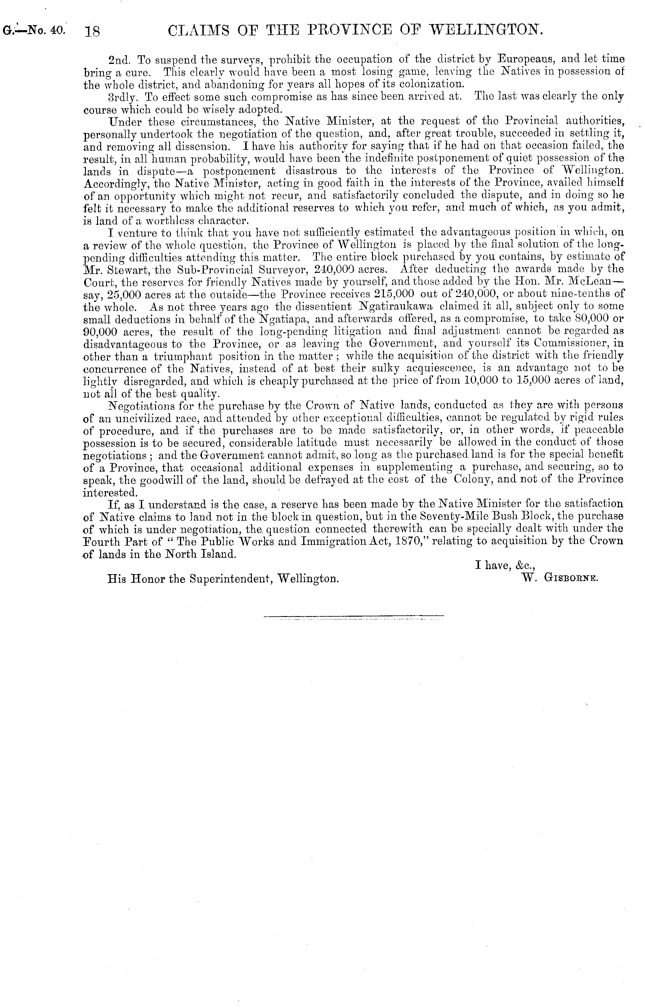 2nd. To suspend the surveys, prohibit the occupation of the district by Europeans, and let time bring a cure. This clearly would have been a most losing game, leaving the Natives in possession of the whole district, and abandoning for years all hopes of its colonization. 3rdly. To effect some such compromise as has since been arrived at. The last was clearly the only course which could bo wisely adopted. Under these circumstances, the Native Minister, at the request of the Provincial authorities, personally undertook the negotiation of the question, and, after great trouble, succeeded in settling it, and removing all dissension. I have his authority for saying that if he had on that occasion failed, the result, in all human probability, would have been the indefinite postponement of quiet possession of the lands in dispute—a postponement disastrous to the interests of the Province of Wellington. Accordingly, the Native Minister, acting in good faith in the interests of the Province, availed himself of an opportunity which might not recur, and satisfactorily concluded the dispute, and in doing so he felt it necessary to make the additional reserves to which you refer, and much of which, as you admit, is land of a worthless character. I venture to think that you have not sufficiently estimated the advantageous position in which, on a review of the whole question, the Province of Wellington is placed by the final solution of the longpending difficulties attending this matter. The entire block purchased by you contains, by estimate of Mr. Stewart, the Sub-Provincial Surveyor, 240,000 acres. After deducting the awards made by the Court, the reserves for friendly Natives made by yourself, and those added by the Hon. Mr. McLean — say, 25,000 acres at the outside—the Province receives 215,000 out of 240,000, or about nine-tenths of the whole. As not three years ago the dissentient Ngatiraukawa claimed it all, subject only to some small deductions in behalf of the Ngatiapa, and afterwards offered, as a compromise, to take 80,000 or 90,000 acres, the result of the long-pending litigation and final adjustment cannot be regarded as disadvantageous to the Province, or as leaving the Government, and yourself its Commissioner, in other than a triumphant position in the matter ; while the acquisition of the district with the friendly concurrence of the Natives, instead of at best their sulky acquiescence, is an advantage not to be lightly disregarded, and which is cheaply purchased at the price of from 10,000 to 15,000 acres of land, not all of the best quality. Negotiations for the purchase by the Crown of Native lands, conducted as they are with persons of an uncivilized race, and attended by other exceptional difficulties, cannot be regulated by rigid rules of procedure, and if the purchases are to be made satisfactorily, or, in other words, if peaceable possession is to be secured, considerable latitude must necessarily be allowed in the conduct of those negotiations ; and the Government cannot admit, so long as the purchased land is for the special benefit of a Province, that occasional additional expenses in supplementing a purchase, and securing, so to speak, the goodwill of the land, should be defrayed at the cost of the Colony, and not of the Province interested. If, as I understand is the case, a reserve has been made by the Native Minister for the satisfaction of Native claims to land not in the block in question, but in the Seventy-Mile Bush Block, the purchase of which is under negotiation, the. question connected therewith can be specially dealt with under the Fourth Part of " The Public Works and Immigration Act, 1870," relating to acquisition by the Crown of lands in the North Island. I have, &c, His Honor the Superintendent, Wellington. W. Gisboene.