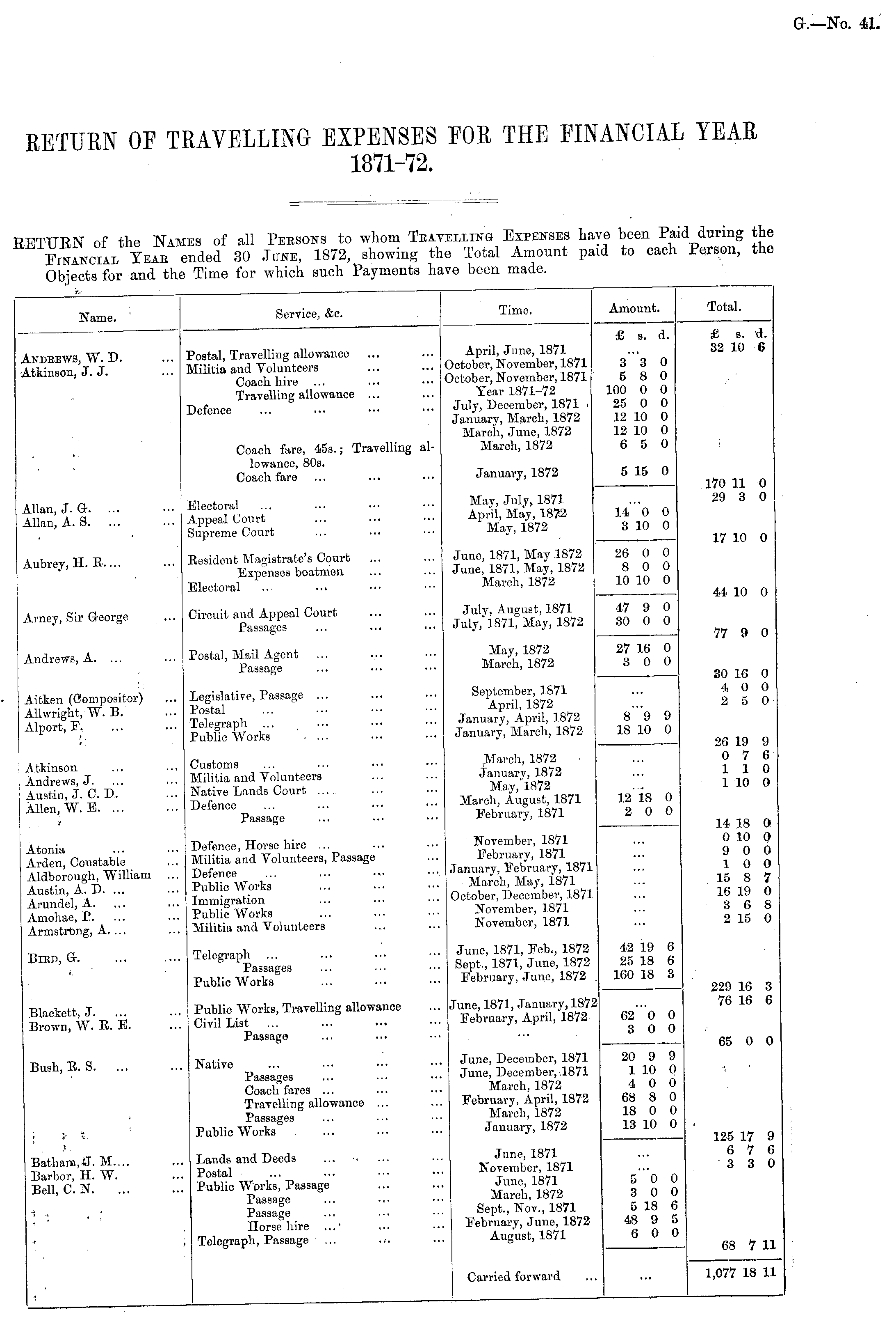 Time. Amount. Iota! Name. Service, &c. April, June, 1871 October, November, 1871 October, November, 1871 Year 1871-72 July, December, 1871 i January, March, 1872 March, June, 1872 March, 1872 £ a. d. 3 3 0 5 8 0 100 0 0 25 0 0 12 10 0 12 10 0 6 5 0 £ s. A. 32 10 6 Andbews, W. D. Atkinson, J. J. Postal, Travelling allowance ... Militia and Volunteers ... ... ( Coach hire ... ... • • • ' Travelling allowance ... Defence Coach fare, 45s.; Travelling allowance, 80s. Coach fare January, 1872 5 15 0 Allan, J. a. ... Allan, A. S. ... May, July, 1871 April, May, 1872 Mav, 1872 170 11 0 29 3 0 Electoral Appeal Court Supreme Court 14 0 0 3 10 0 17 10 0 Aubrey, H. B.... Besident Magistrate's Court Expenses boatmen Electoral June, 1871, May 1872 June, 1871, May, 1872 March, 1872 26 0 0 8 0 0 10 10 0 44 10 0 Arney, Sir George Circuit and Appeal Court Passages July, August, 1871 July, 1871, May, 1872 47 9 0 30 0 0 27 16 0 3 0 0 77 9 0 Andrews, A. ... Postal, Mail Agent Passage May, 1872 March, 1872 30 16 0 4 0 0 2 5 0 Aitken (Compositor) Allwright, W. B. Alport, F. Legislative, Passage ... Postal Telegraph Public Works ' • ... September, 1871 April, 1872 January, April, 1872 January, March, 1872 8 "9 9 18 10 0 Atkinson Andrews, J. Austin, J. C. D. Allen, W. E. ... Customs Militia and Volunteers Native Lands Court ... , Defence March, 1872 January, 1872 May,'1872 March, August, 1871 February, 1871 26 19 9 0 7 6 110 1 10 0 12 18 0 2 0 0 Atonia Arden, Constable Aldborough, William Austin, A. D. ... Arundel, A. Amohae, P. Armstrong, A.... Passage Defence, Horse hire ... Militia and Volunteers, Passage Defence Public Woi'ks Immigration Public Works Militia and Volunteers November, 1871 February, 1871 January, February, 1871 March, May, 1871 October, December, 1871 November, 1871 November, 1871 14 18 Q 0 10 0 9 0 0 10 0 15 8 7 16 19 0 3 6 8 2 15 0 Bied, Gr. Telegraph ... Passages Public Works June, 1871, Feb., 1872 Sept., 1871, June, 1872 February, June, 1872 42 19 6 25 18 6 160 18 3 Blackett, J. ... Brown, W. R. E. June, 1871, January, 1872 February, April, 1872 229 16 3 76 16 6 Public Works, Travelling allowance Civil List Passage 2 62 0 0 3 0 0 June, December, 1871 June, December, ,1871 March, 1872 February, April, 1872 March, 1872 January, 1872 20 9 9 1 10 0 4 0 0 68 8 0 18 0 0 13 10 0 65 0 0 Bush, E. S. ... Native Passages Coach fares ... Travelling allowance ... Passages Public Works ,1. Batham,*r. M.... Barbor, H. W. Bell, C.N. Lands and Deeds ... Postal Public Works, Passage Passage Passage Horse hire ...' ; Telegraph, Passage ... June, 1871 November, 1871 June, 1871 March, 1872 Sept., Nov., 1871 February, June, 1872 August, 1871 5 0 0 3 0 0 5 18 6 48 9 5 6 0 0 125 17 9 6 7 6 3 3 0 68 7 11 Carried forward 1,077 18 11