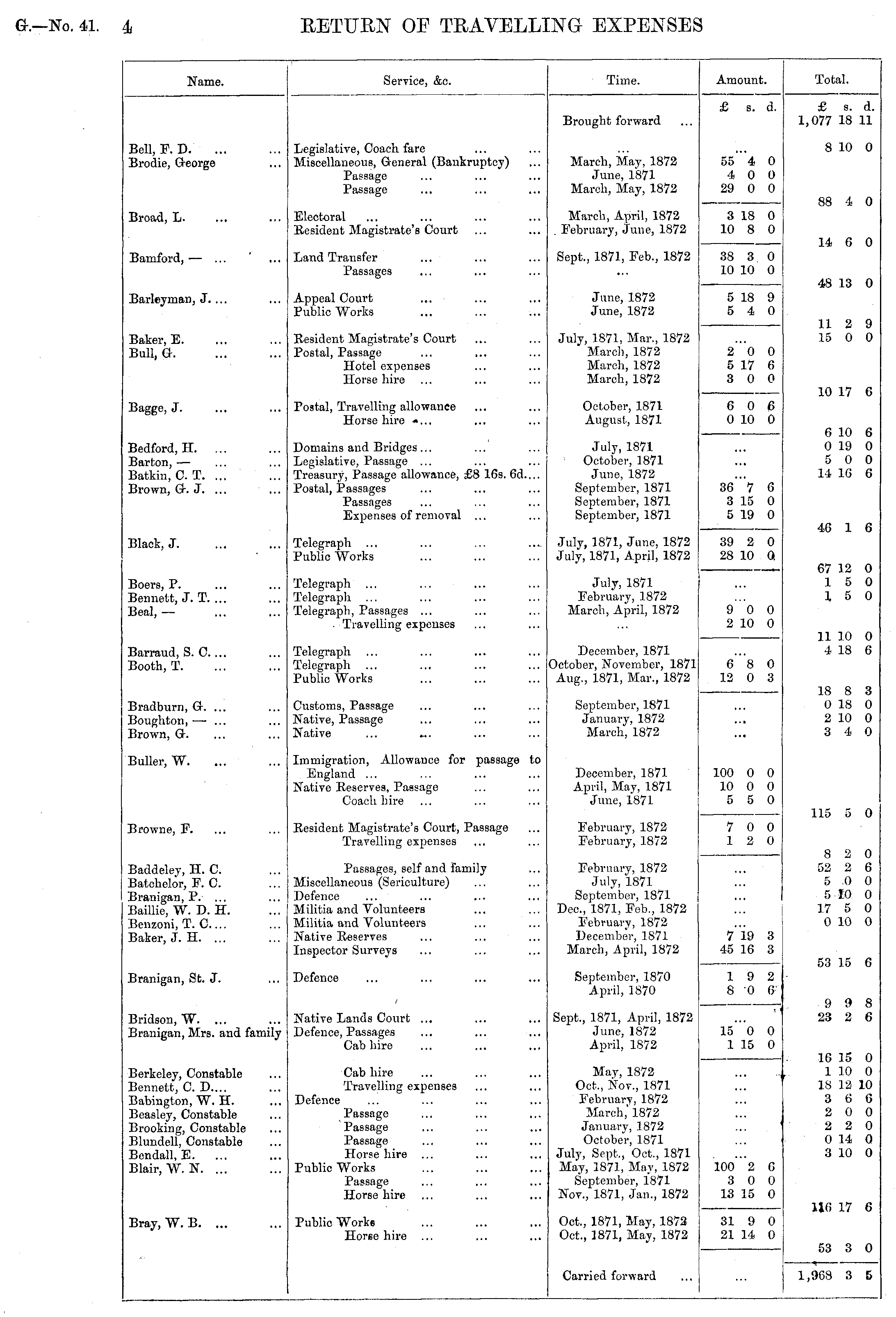 Name. Service, &c. Time. Amount. Total. Brought forward £ s. d. £ s. d. 1,077 18 11 Bell, F. D Brodie, George Legislative, Coach fare Miscellaneous, General (Bankruptcy) Passage Passage March, May, 1872 June, 1871 March, May, 1872 55 4 0 4 0 0 29 0 0 8 10 0 Broad, L. 3 18 0 10 8 0 88 4 0 Electoral Resident Magistrate's Court March, April, 1872 February, June, 1872 14 6 0 Bamford, — ... Land Transfer ... Passages Sept., 1871, Feb., 1872 38 3 0 10 10 0 Barleyman, J. ... 48 13 0 Appeal Court Public Works June, 1872 June, 1872 5 18 9 5 4 0 11 2 9 15 0 0 Baker, E. Bull, G Resident Magistrate's Court Postal, Passage Hotel expenses Horse hire July, 1871, Mar., 1872 March, 1872 March, 1872 March, 1872 2 0 0 5 17 6 3 0 0 Bagge, J. 6 0 6 0 10 0 10 17 6 Postal, Travelling allowance Horse hire «... October, 1871 August, 1871 6 10 6 0 19 0 5 0 0 14 1G 6 Bedford, H. ... Barton, — Batkin, C. T. ... Brown, G. J. ... Domains and Bridges... Legislative, Passage ... Treasury, Passage allowance, £8 16s. 6d.... Postal, Passages Passages Expenses of removal ... July, 1871 October, 1871 June, 1872 September, 1871 September, 1871 September, 1871 36 7 6 3 15 0 5 19 0 Black, J. 39 2 0 28 10 0. 46 1 6 Telegraph ... Public Works July, 1871, June, 1872 July, 1871, April, 1872 67 12 0 15 0 15 0 Boers, P. Bennett, J. T. ... Beal, — Telegraph Telegraph ... Telegraph, Passages ... . Travelling expenses July, 1871 February, 1872 March, April, 1872 9 0 0 2 10 0 Barraud, S. C. ... Booth, T. Telegraph Telegraph Public Works December, 1871 October, November, 1871 Aug., 1871, Mar., 1872 11 10 0 4 18 6 6 "8 0 12 0 3 Bradburn, G. ... Boughton, ■— ... Brown, G. Customs, Passage Native, Passage Native September, 1871 January, 1872 March, 1872 18 8 3 0 18 0 2 10 0 3 4 0 Buller, W. Immigration, Allowance for passage to England ... Native Beserves, Passage Coach hire December, 1871 April, Mav, 1871 June, 1871 100 0 0 10 0 0 5 5 0 115 5 0 Browne, F. Resident Magistrate's Court, Passage Travelling expenses February, 1872 February, 1872 7 0 0 12 0 Baddeley, H. C. Batchelor, F. C. Branigan, P. ... Baillie, W. D. H. Benzoni, T. C Baker, J. H. ... Passages, self and family Miscellaneous (Sericulture) Defence Militia and Volunteers Militia and Volunteers Native Reserves Inspector Surveys February, 1872 July, 1871 September, 1871 Dec, 1871, Feb., 1872 February, 1872 December, 1871 March, April, 1872 8 2 0 52 2 6 5 0 0 5 10 0 17 5 0 0 10 0 7 19 3 45 16 3 53 15 6 Branigan, St. J. Defence September, 1870 April, 1870 19 2 8 0 6' Bridson, W. Branigan, Mrs. and family Native Lands Court ... Defence, Passages Cab hire Sept., 1871, April, 1872 June, 1872 April, 1872 . i 9 9 8 23 2 6 15 "o 0 1 15 0 Berkeley, Constable Bennett, C. D.... Babington, W. H. Beasley, Constable Brooking, Constable Blundell, Constable Bendall, E. ... Blair, W.N. ... Cab hire Travelling expenses Defence Passage Passage Passage Horse hire Public Works Passage Horse hire Mav, 1872 Oct., Nov., 1871 Februarv, 1872 March,' 1872 January, 1872 October, 1871 July, Sept., Oct., 1871 May, 1871, May, 1872 September, 1871 Nov., 1871, Jan., 1872 ... 16 15 0 1 10 0 18 12 10 3 6 6 2 0 0 2 2 0 0 14 0 3 10 0 100 2 6 3 0 0 13 15 0 Bray, W. B. ... 116 17 6 Public Works Horse hire Oct., 1871, May, 1872 Oct., 1871, May, 1872 31 9 0 21 14 0 53 3 0 Carried forward | 1,968 3 5