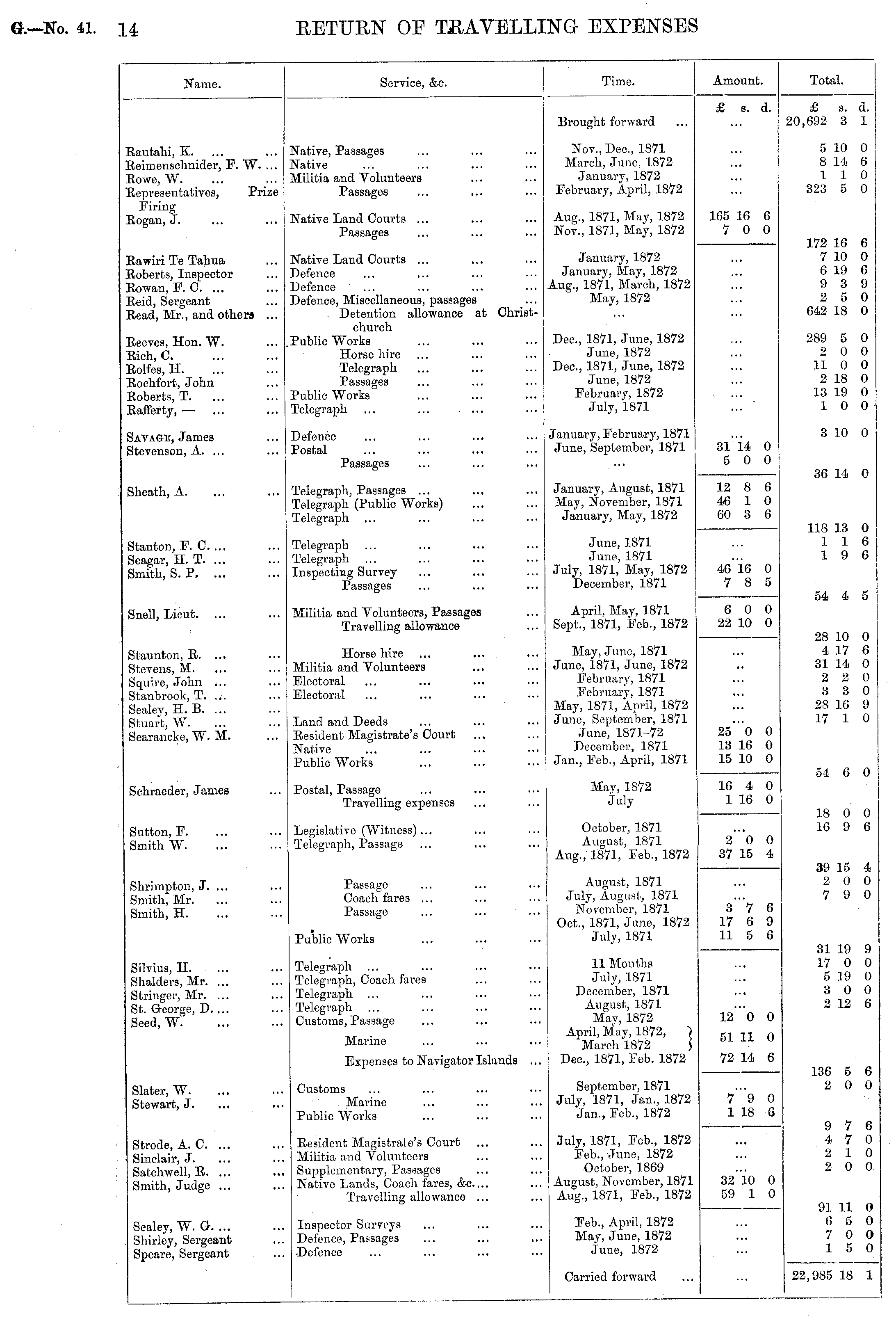 Name. Service, &c. Time. Amount. Total. Brought forward £ s. d. j £ s. d. 20,692 3 1 Eautahi, K. Beimenschnider, F. W. ... Eowe, W. Bepresentatives, Prize Firing Bogan, J. Native, Passages Native Militia and Volunteers Passages Nov., Dec, 1871 March, June, 1872 January, 1872 February, April, 1872 5 10 0 8 14 6 110 323 5 0 Native Land Courts ... Passages Aug., 1871, May, 1872 Nov., 1871, May, 1872 165 16 6 7 0 0 172 16 6 7 10 0 6 19 6 9 3 9 2 5 0 642 18 0 Bawiri Te Tahua Eoberts, Inspector Rowan, F. C. ... Beid, Sergeant Bead, Mr., and others ... Native Land Courts ... Defence Defence Defence, Miscellaneous, passages Detention allowance at Christchurch Public Works Horse hire Telegraph Passages Public Works Telegraph ... ... .... January, 1872 January, May, 1872 Aug., 1871, March, 1872 May, 1872 Beeves, Hon. W. Rich, C. Rolfes, H. Rochfort, John Roberts, T. Eafferty, — ... Dec, 1871, June, 1872 June, 1872 Dec, 1871, June, 1872 June, 1872 February, 1872 July, 1871 289 5 0 2 0 0 11 0 0 2 18 0 13 19 0 10 0 Savage, James Stevenson, A. ... Defence Postal Passages January, February, 1871 June, September, 1871 31 14 0 5 0 0 3 10 0 Sheath, A. January, August, 1871 May, November, 1871 January, May, 1872 12 8 6 46 1 0 60 3 6 36 14 0 Telegraph, Passages ... Telegraph (Public Works) Telegraph 118 13 0 116 19 6 Stanton, F. C. ... Seagar, H. T. ... Smith, S. P. ... Telegraph Telegraph Inspecting Survey Passages June, 1871 June, 1871 July, 1871, May, 1872 December, 1871 46 16 0 7 8 5 . Snell, Lieut. ... 54 4 5 Militia and Volunteers, Passages Travelling allowance April, May, 1871 Sept., 1871, Feb., 1872 6 0 0 22 10 0 28 10 0 4 17 6 31 14 0 2 2 0 3 3 0 28 16 9 17 l o Staunton, E. ... Stevens, M. Squire, John ,.. Stanbrook, T. ... Sealev, H. B. ... Stuart, W. Searancke, W. M. Horse hire Militia and Volunteers Electoral Electoral May, June, 1871 June, 1871, June, 1872 February, 1871 February, 1871 May, 1871, April, 1872 June, September, 1871 June, 1871-72 December, 1871 Jan., Feb., April, 1871 Land and Deeds Besident Magistrate's Court Native Public Works 25 0 0 13 16 0 15 10 0 Schraeder, James 16 4 0 1 16 0 54 6 0 Postal, Passage Travelling expenses May, 1872 July 18 0 0 16 9 6 Sutton, F. Smith W. Legislative (Witness)... Telegraph, Passage October, 1871 August, 1871 Aug., 1871, Feb., 1872 2 0 0 37 15 4 Shrimpton, J. ... Smith, Mr. Smith, H. Passage Coach fare3 ... Passage August, 1871 July, August, 1871 November, 1871 Oct., 1871, June, 1872 July, 1871 39 15 4 2 0 0 7 9 0 3 7 6 17 6 9 11 5 6 Silvins, H. Shalders, Mr. ... Stringer, Mr. ... St. George, D. ... Seed, W Public Works Telegraph Telegraph, Coach fares Telegraph ... Telegraph Customs, Passage 11 Months July, 1871 December, 1871 August, 1871 May, 1872 April, May, 1872, ) March 1872 ) Dec, 1871, Feb. 1872 31 19 9 17 0 0 5 19 0 3 0 0 2 12 6 12 "o 0 Marine 51 11 0 72 14 6 136 5 6 2 0 0 Slater, W. Stewart, J. Expenses to Navigator Islands ... Customs Marine Public Works September, 1871 July, 1871, Jan., 1872 Jan., Feb., 1872 7 9 0 1 18 6 Strode, A. C. ... Sinclair, J. Satchwell, E. ... Smith, Judge ... Besident Magistrate's Court Militia and Volunteers . Supplementary, Passages Native Lands, Coach fares, &c... Travelling allowance ... July, 1871, Feb., 1872 Feb., June, 1872 October, 1869 August, November, 1871 Aug., 1871, Feb., 1872 9 7 6 4 7 0 2 10 2 0 0 32 10 0 59 1 0 Sealey, W. G Shirley, Sergeant Speare, Sergeant Inspector Surveys Defence, Passages , Defence' Feb., April, 1872 Mav, June, 1872 June, 1872 91 11 0 6 5 0 7 0 0 15 0 Carried forward 22,985 18 1