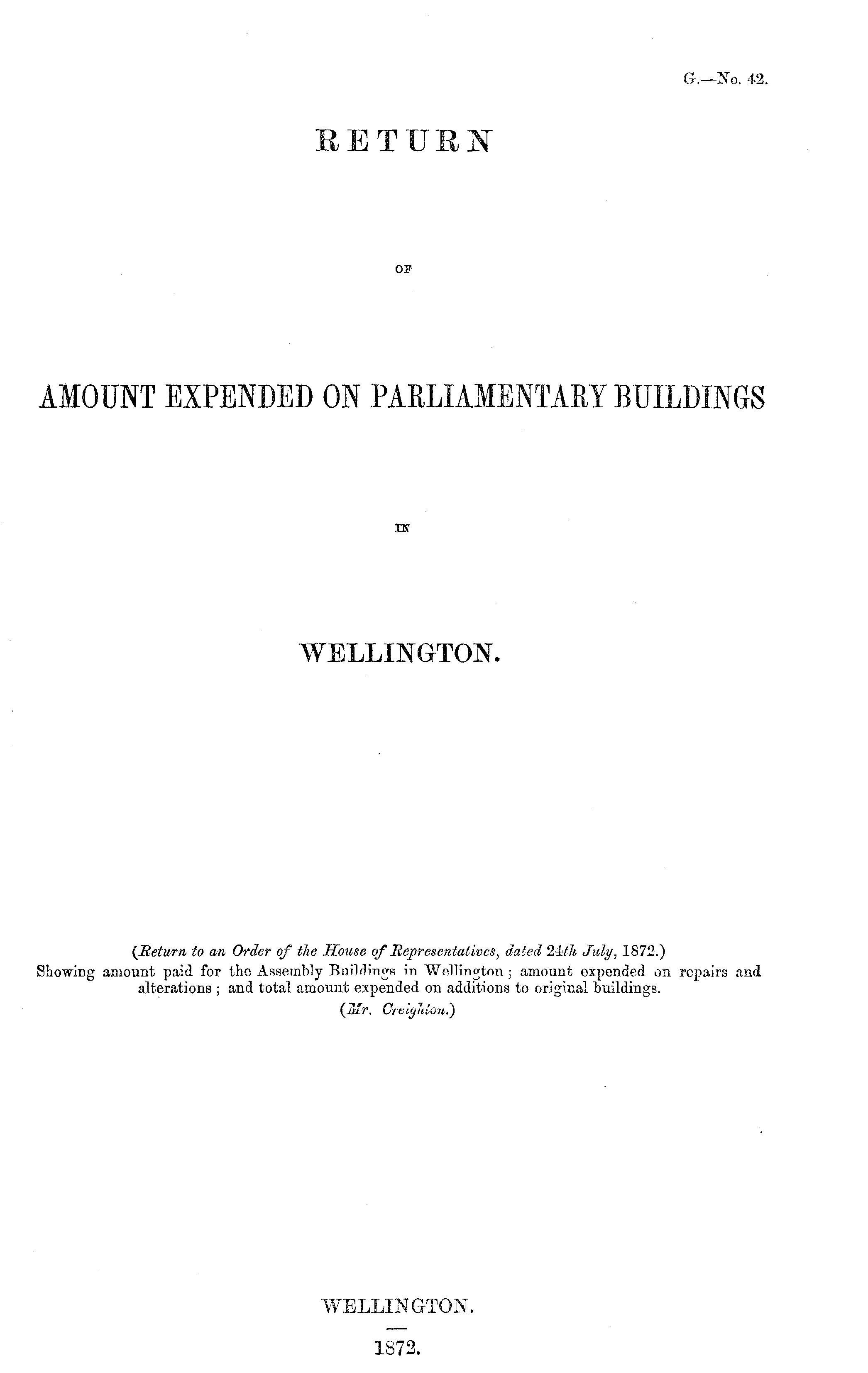 RETURN OF AMOUNT EXPENDED ON PARLIAMENTARY BUILDINGS or WELLINGTON. (Return to an Order of the House of Representatives, dated 24th July, 1872.)