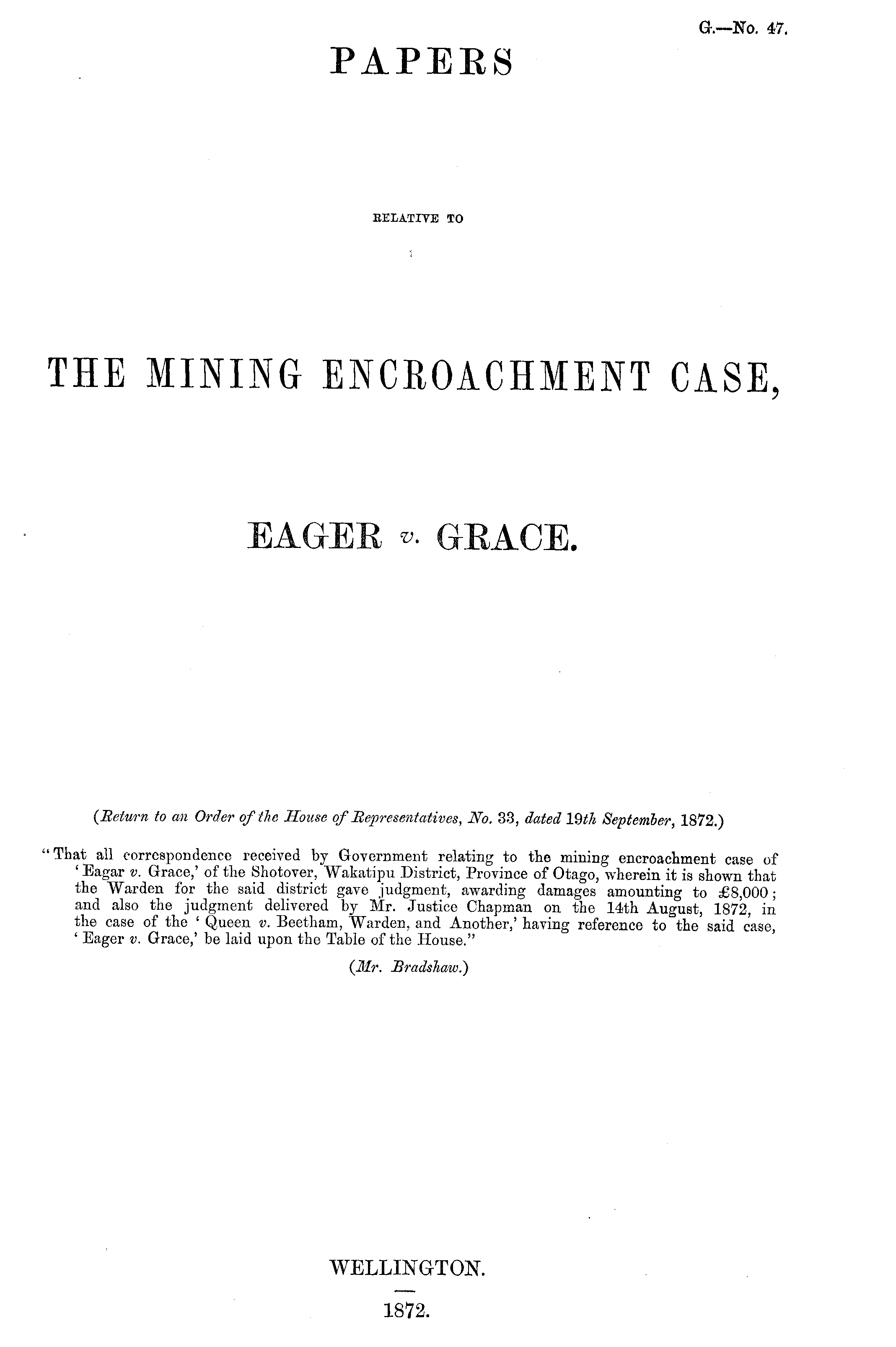 PAPERS RELATIVE TO THE MINING ENCROACHMENT CASE, EAGER v. GRACE. (Return to an Order of the House of Representatives, No. 33, dated 19th September, 1872.)