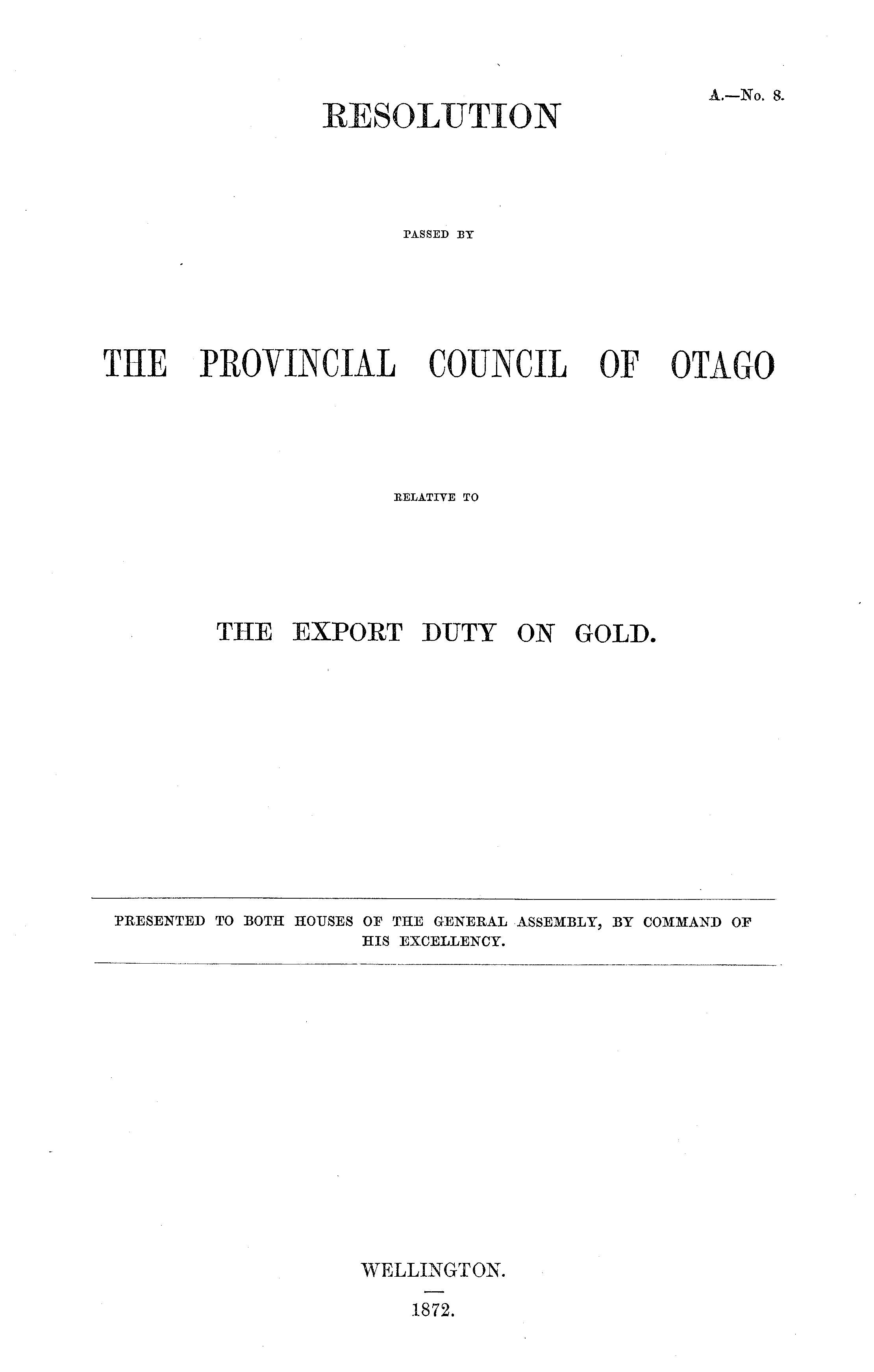 RESOLUTION PASSED BY THE PROVINCIAL COUNCIL OF OTAGO RELATIVE TO THE EXPORT DUTY ON GOLD.